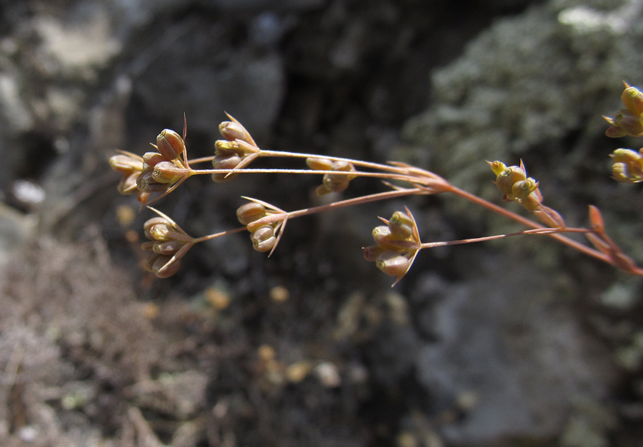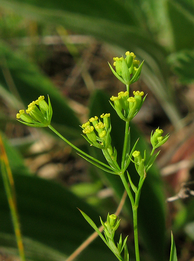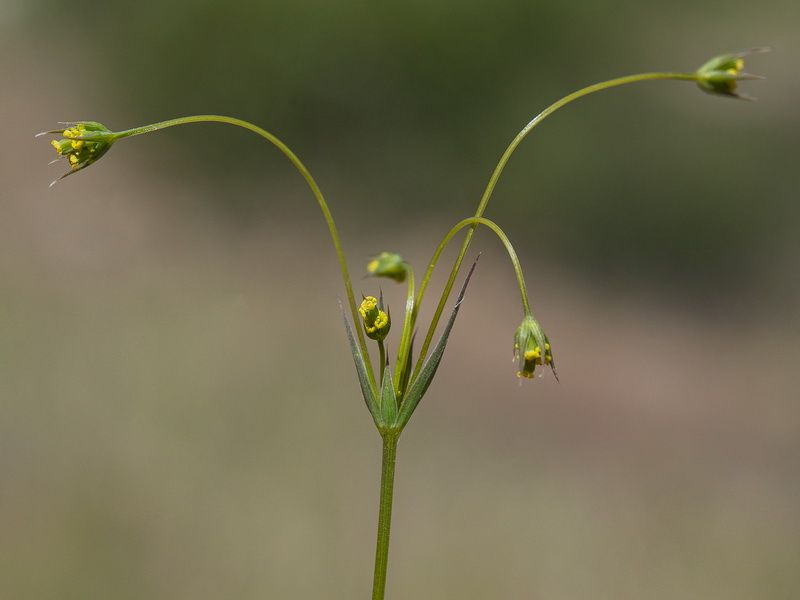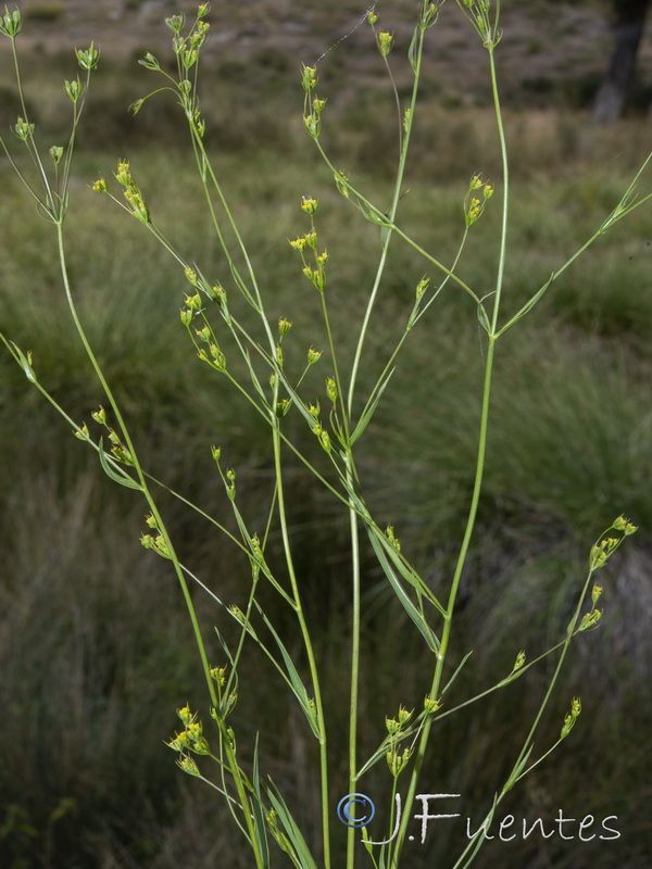 Bupleurum gerardi All., it is an annual herb, erect. up to 50 cm tall, dichotomously or corymbosely branched from c. the middle, glabrous with patent-sub erect, angular, sulcate branches. Leaves linear, (10-) 20-100 (-110) x 1-4 mm, amplexicaul but not sheathing at base, acute acuminate at the apex, conspicuously 3-veined. Umbels 5-6 (-7l-rayed, on terminal and antiphyllous, 8-30 mm long, slender, erect peduncles; rays filiform, unequal, 3-25 mm long, angular, glabrous. Bracts 3-5, linear-subulate, 3-15 x 0.5-1 mm. unequal minutely scabridulous on margins, cuspidate, 1-3-nerved. entirely herbaceous and opaque between veinlets. Umbelsns mostly 6-flowered. Pedieels up to 2 mm long. Bracteoles 5, akin to bracts, mostly less than 6 mm long. Petals broadly oblong, c. 0.3-0.4 mm long, strongly incurved emarginate at apex. occasionally ± papillate dorsally. Anthers yellow, suborbicular; styles shorter than the flattish stylopodium. Fruit oblong-prismatic c. 2-2.5 mm long, dark brown; mericarps glabrous with 5 conspicuous filiform ribs.