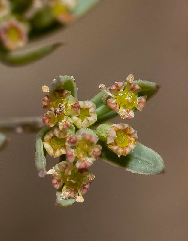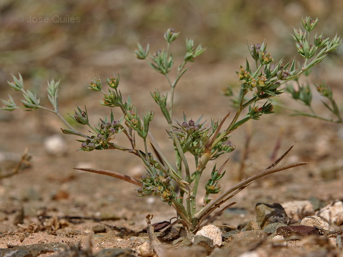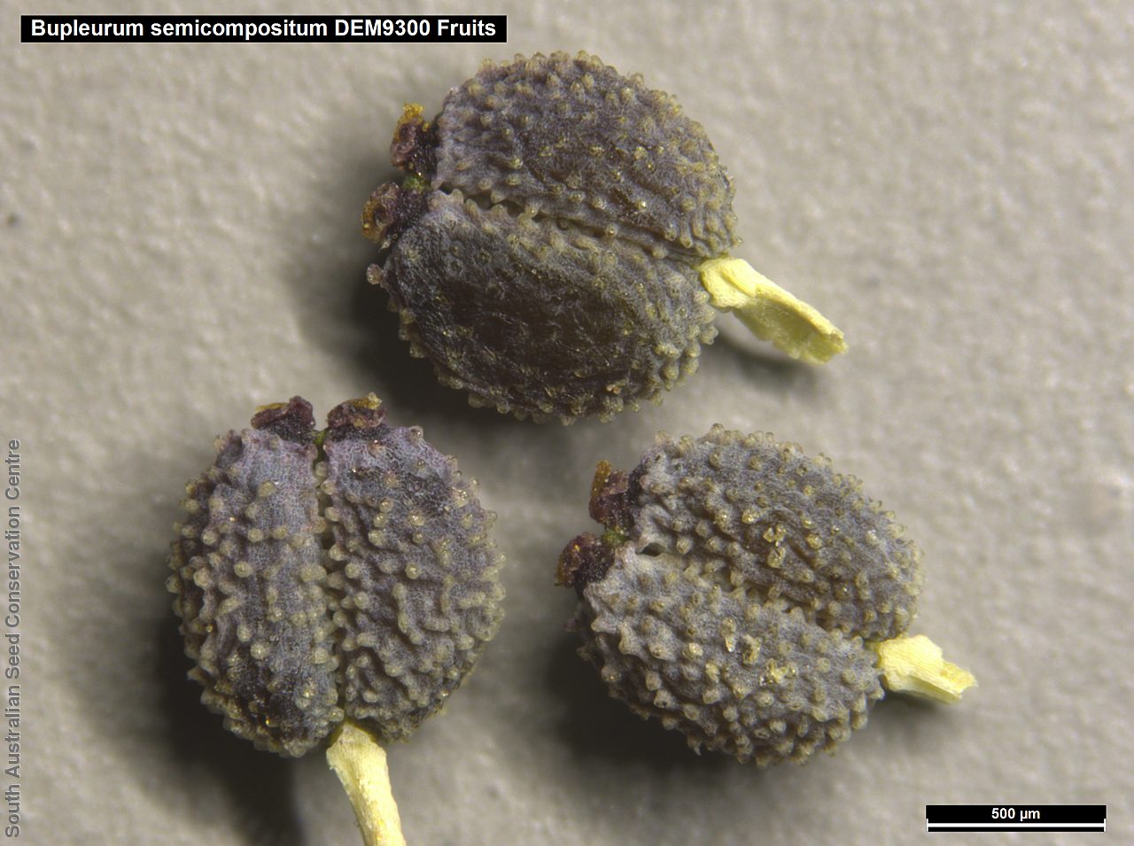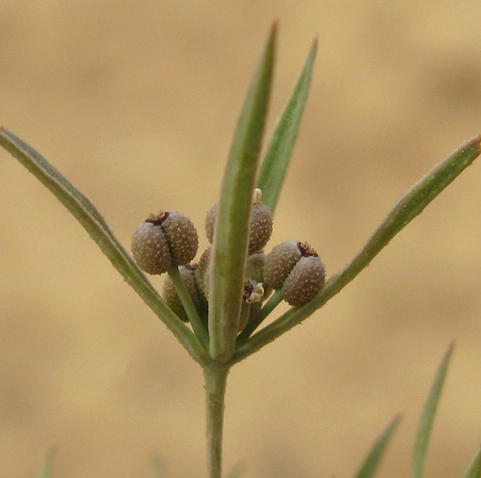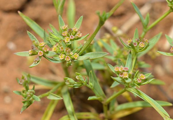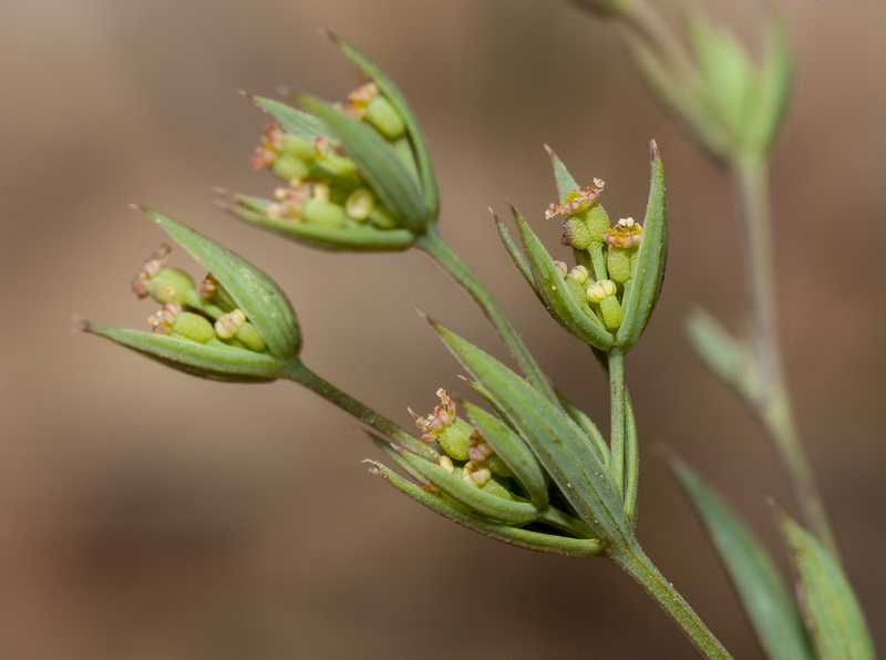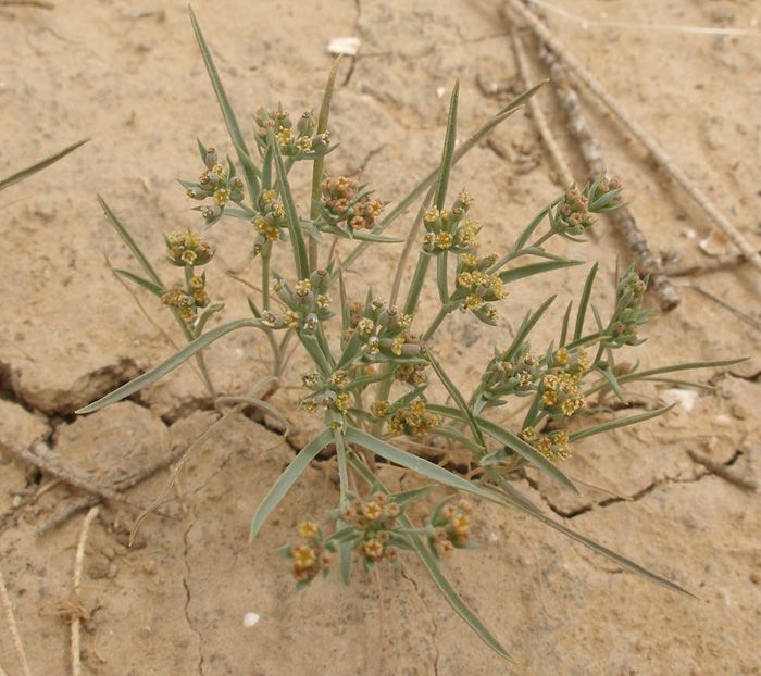 Bupleurum semicompositum L., it is an annual herb, erect or ascending, up to 30 (40) cm tall, glabrous-glaucous, dichotomously branched from base, loose tuft forming with angular or inconspicuously ridged stems. Leaves linear-lanceolate or narrowly oblong-oblanceolate, 10-30 (-60) x1-6 mm, acute or acuminate, 3 (-5)-nerved, lower shortly petiolate, upper sessile and serni-amplexicaute. Umbels (3-) 4-5 (-6)-rayed, on slender, angular, 0.5-1.5 cm long, unequal peduncles; rays filiform, very unequal, 0.5-15 mm long, angled. Bracts 4, linear-lanceolate, 3-12 x 0.5-1.5 mm, concave, prominently 3-nerved, opaque and herbaceous between the veinlets, scabridulous. Umbellules 4-7-flowered. Pedicels very unequal, up to c. 2 mm long. Bractlets mostly 5 narrowly linear-lanceolate, longer than umbellules, 2.5-8 x 1-1.5 mm, green, scabrid on veins and veinlets. aristae, sub erect or palent in fruit. Petals oblong, yellowish or brownish-green. c. 0.3-0.4 mm long and broad, incurved at lip, inconspicuously papillose or not. Anthers suborbicular, yellow. Styles shorter than stylopodium. Fruit ovoid-sub globose, 1- 1.5 mm long and nearly as broad, dark brown; mericarps inconspicuously ribbed, irregularly while-pallid papillale.