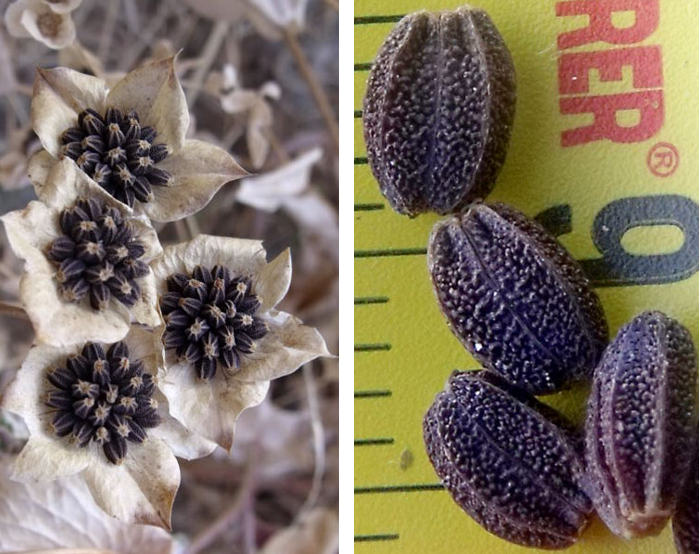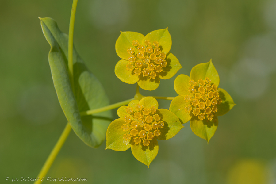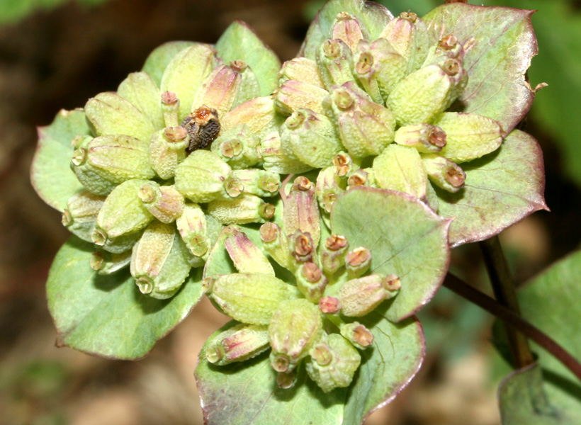Bupleurum subovatum Link ex Spreng., it is an annual, erect, up to 1 m tall, glabrous-glaucous, stout herb with conspicuously furrowed, ± angular stems. Basal and lower leaves oblong-narrowly ovate, oblanceolate or elliptical, 3-8 x 1-2.5 cm, acute but not long acuminate; upper leaves broadly ovate, 2-8 x 1.5-3 cm, acute-apiculate, perfoliate. Umbels 3-5, rayed, on terminal and axillary peduncles; rays sub equal, 1-2.5 cm long, glabrous. Bracts absent. Umbellules 15-25-flowered, pedicels up to 2 mm long, unequal. Bractlets mostly 5, broadly ovate, 4-15 x 3-10 mm. sub equal, pale-green, basally, ± connate, apiculate at the apex. Petals broadly oblong, 0.5-0.7 x 0.8 mm, much inflexed. Anthers suborbicular, yellow. Styles shorter than stylopodium. Fruit oblong-ovoid, 3.5 – 4.5 (-5) x 3-3.5 mm, dark brown; mericarps conspicuously 5-ribbed with sharp rib margins, ± pruinose, irregularly tuberculate in furrows.