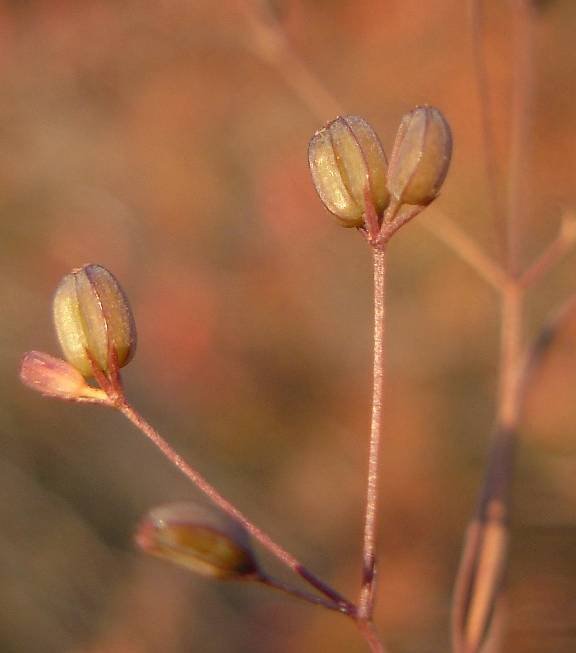 Bupleurum trichopodum Boiss. & Spruner, it is an annual herb, erect, up t0 40(-50) cm tall, glabrous, dichotomously branched with ± terete or inconspicuously sulcate stem. Leaves linear or linear-oblanceolate to ± spalbulate, 10-60 (-80) x 1.5-6 mm, shortly acuminate or obtuse, narrowed at the base. lower petiolate. upper occasionally subulate, sessile, sub cordate and amplexicaul at base. Umbels (2-)3-6(-1)-rayed, on terminal and antiphyllous, 8-40 mm long, filifonn peduncles; rays sub equal, slender, 6-50 mm long, spreading. Bracts 1-3, rarely absent, linear-subulate to lanceolate, (3-) 5-15 (-20) x c. 1.5 mm, obscurely 1-3-nervedd, cuspidate at tips; bracteoles usually 2-3. Umbellulcs (1-) 2-3 (-5)-flowered. Pedicels 1-2 mm long. Petals broadly oblong, c. 0.5 mm long and broad, with an inflexed emarginate tip, yellowish. Styles strongly reflexed. Fruit oblong-prismatic to ± rounded, 2.5-3 x 1.5 mm, dark brown; meriearps smooth or faintly rugulose. with 5 filiform ribs.