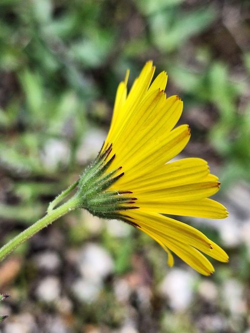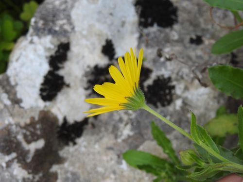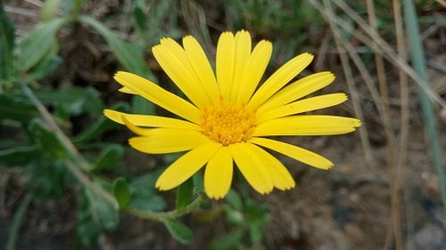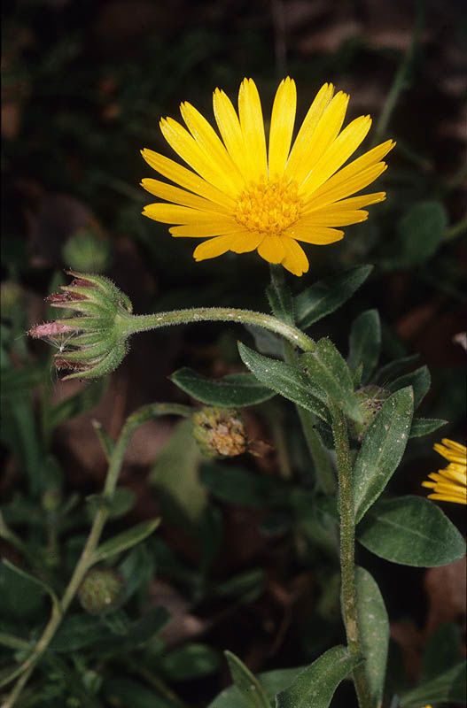 Calendula suffruticosa Vahl , it is a perennial, woody at the base, rarely biennial. Stems ascending or decumbent. Lower leaves spatulate to oblanceolate. Upper leaves oblong or elliptic to lanceolate, acute or obtuse, auriculate. Involucre 9–13 × 11–18 (–25) mm. Flowers yellow; hemiligulate flowers with a tube 0.5–2 mm long and a limb (9–) 11–20 mm long; disc flowers (3.7–) 4–5 mm long. Anthers 2.13 mm long. Achenes heteromorphic; outer ones up to 2.2 cm long, generally spreading, with a long or short beak, middle ones with 3 wings or navicular, sometimes with a beak, innermost ones annular or hooked.