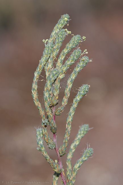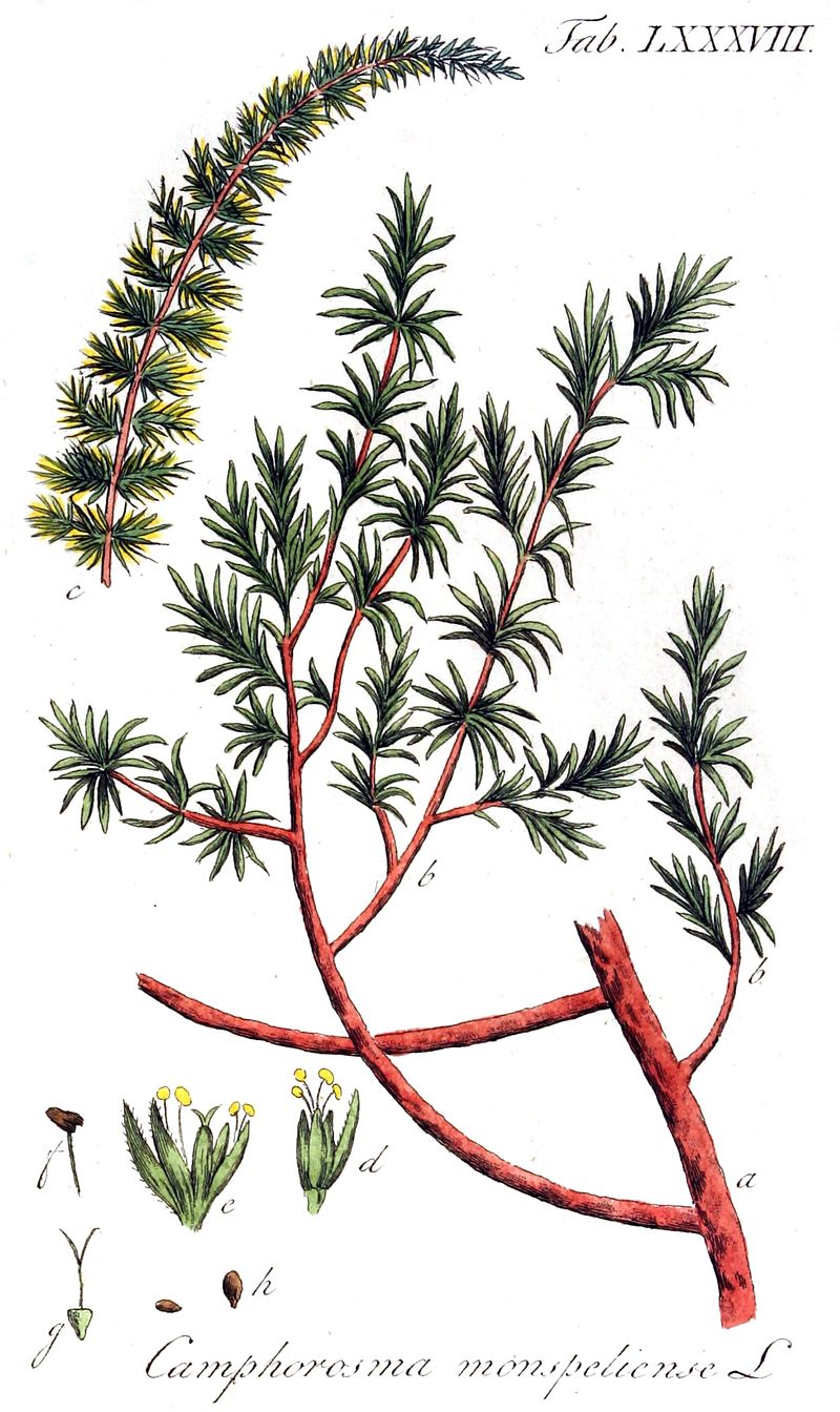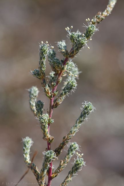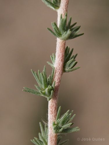 Camphorosma monspeliaca L., it is a subshrub, up to 10-50 cm tall, forming dense mat of lignescent branchlets on the soil surface, annual shoots branched in upper parts arising from the mat, whitish or white-tomentose with dense short and curly hairs. Leaves subulate, 3-10 mm long, somewhat rigid, straight or reflexed, with shortened branchlets in axils, covered with straight long hairs. Flowers solitary in bracteole axils, aggregated in dense and short spicate inflorescences. Perianth 3-3.5 mm, densely hairy with long hairs, or with short hairs and glabrous beneath, with two herbaceous lateral teeth, deflexed at fruits and two scarious short medial teeth. Seeds oval or oblong-oval, 1.5-1.75 mm long, brown or black-brown with scattered glandules.