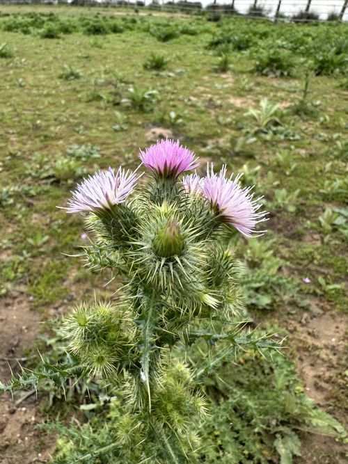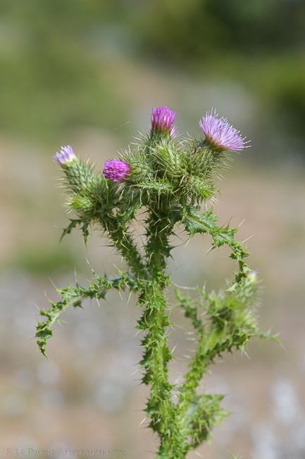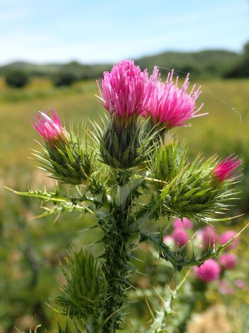 Carduus meonanthus Hoffmanns. & Link, it is an annual herb, up to 30-50 (-65) cm. Stem arachnoid hairy and glabrescent. winged, simple, erect. branched above; wings ± continuous, undulated. palmate, lobed, with soft, slender apical spines up to 5 mm. Leaves oblanceolate to oblong, glabrescent above, arachnoid hairy beneath with multicellular and sinuate unicellular hairs, sinuate pinnatifid with 8-10 pairs of palmate, acutely lobulate lobes, each with an apical spine up to 4 mm. Basal lower-cauline leaves up to 150 x 30 mm, tapered into a long, winged, soft spiny petiole. Mid-cauline leaves c. 100 x 20 mm, sessile. Capitula 15-20 x 8-12 mm, cylindrical oblong to ± narrowly campanulate, sub sessile, in clusters of 2-4(-8), on the apex of winged stem. Involucre arachnoid-hairy. Involucral bracts of 1st & 2nd rows 5-7 x 0.75-1 mm, linear-ovate, with thin scarious margins, tapered above into a soft, c. 2 mm long mucro, the one of the 2nd row keeled on the back in the distal one third. Involucral bracts of 3rd & 4th rows 8-9,5 x 1-1,5 mm, abruptly narrowed above into a soft c. 2 mm long mucro, margins narrowly scarious and minutely serrulate, keeled at the back in distal one third to one quarter. Inner involucral bracts 12-15 x 1.25-2 mm, linear-lanceolate, sharply acute, faintly 3 (-5) nerved in the distal one third, margins scarious, with borders minutely barbellate, tips and margins in the upper half sometimes purplish. Florets up to 13-15 mm long. Corolla 10-12 mm; basal tube of the corolla 4-5 mm, widened above in a narrower ellipsoid cup of c. 0.5 mm wide; unequally 5-lobed. Cypsela 3-4 mm, compressed, smooth; umbo small, sessile or shortly stalked, entire; pappus 8-10 (-13) mm.