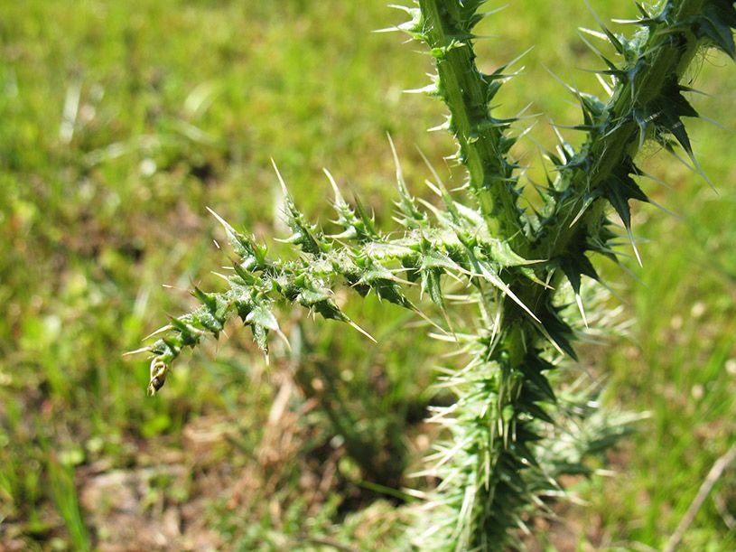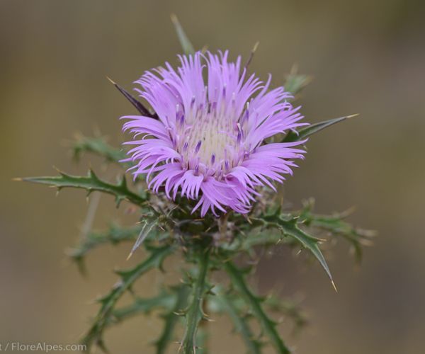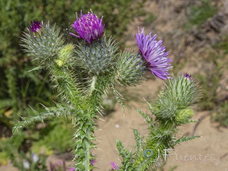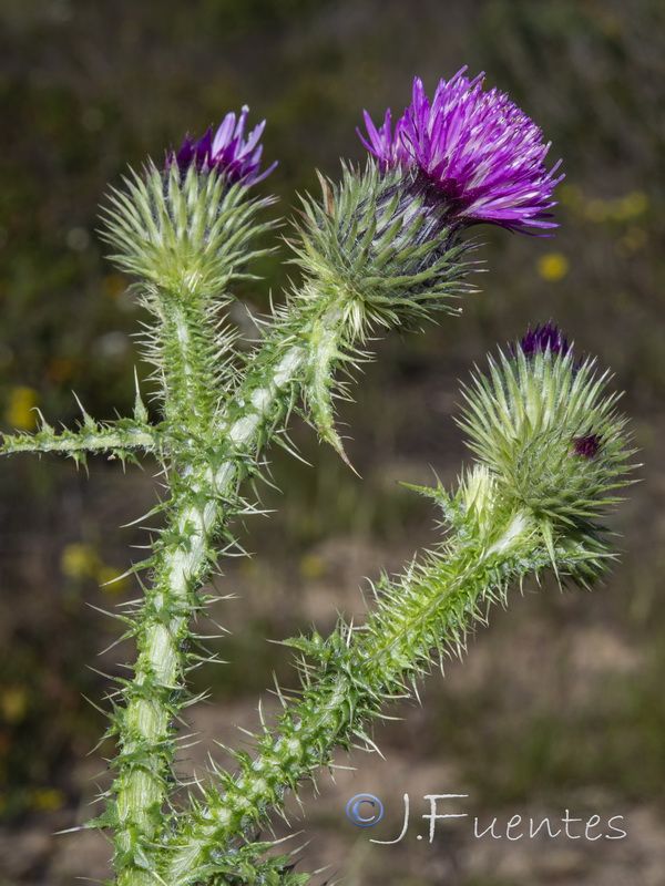 Carduus myriacanthus Salzm. ex DC., it is an annual herb, up to 30cm. Stems simple or branched in the upper part, sub glabrous or slightly arachnoid. Basal leaves oblong-lanceolate, with 8-12 pairs of deeply lobed lobes and spines up to 4.5 mm long; upper surface with scattered multicellular hairs and lower surface arachnoid with multicellular hairs on the veins and unicellular hairs between the veins. Flower heads solitary or in groups of 2-3, sessile or sub sessile. Involucre 15-20 x 6-11 mm, sub ovoid, arachnoid. Middle bracts lanceolate, attenuate from the base, erect-spreading, with a scarious margin in the lower third and an apical spine up to 2 mm long. Flowers with a tube (5-) 6-8 mm and a limb 8-9.5 mm long. Achenes 4.3-4.8 x 1.8-2.2 mm, straw-yellow, with a globose, slightly five-lobed apical prominence 0.5-0.9 mm long. Pappus 13.5-17 mm long.