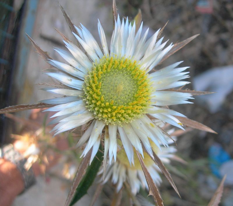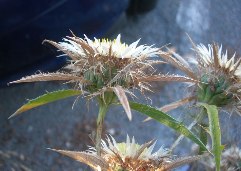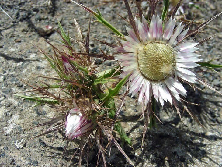 Carlina sicula Ten. //Infraspecifics: Carlina sicula ssp. mareotica (Asch. & Schweinf.) Greuter  it is a sub glabrous perennial, up to (5-) 10·30 (-70) cm. simple or with few short branches arising from an underground rhizome. Lower part of the aerial stem usually covered with the bases of dry leaves. Lower leaves 40 x 70 x 20 mm (incl. spines), oblong, pinnatisect; lobes spiny toothed. Mid-cauline leaves 60-80 x 25-35 mm (incl. spines), oblong-lanceolate, pinnatifid to pinnatisect with lobes and margins spiny-toothed. Capitula 2-4, in a crowded terminal cluster, or 1-2, sub sessile in leaf axils lower-down,15-40 mm in diam. (exclude, the outermost involueral bracts). Outer involucral bracts 25-35 (-80-100) mm long, erecto-patent, coriaceous and somewhat clavateat the bases and rest similar to the upper cauline-leaves. Middle involucral bracts 8-10 (-12) x 2.5 mm, oblong, herbaceous with narrow scarious margins, finely apiculate, arachnoid tomentose on the back in the distal halves. Innermost involucral bracts 18-22 x 2-2.25 mm, oblong, exceeding the florets, parts projecting above the florets silver white above, white or purplish beneath, apiculate, margins finely ciliate. Florets yellow. Cypsela 3 mm; pappus c, 9 mm.