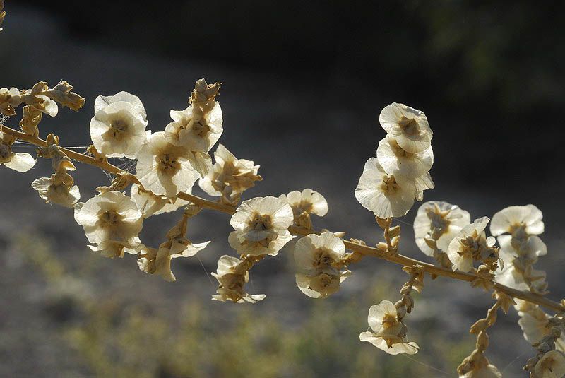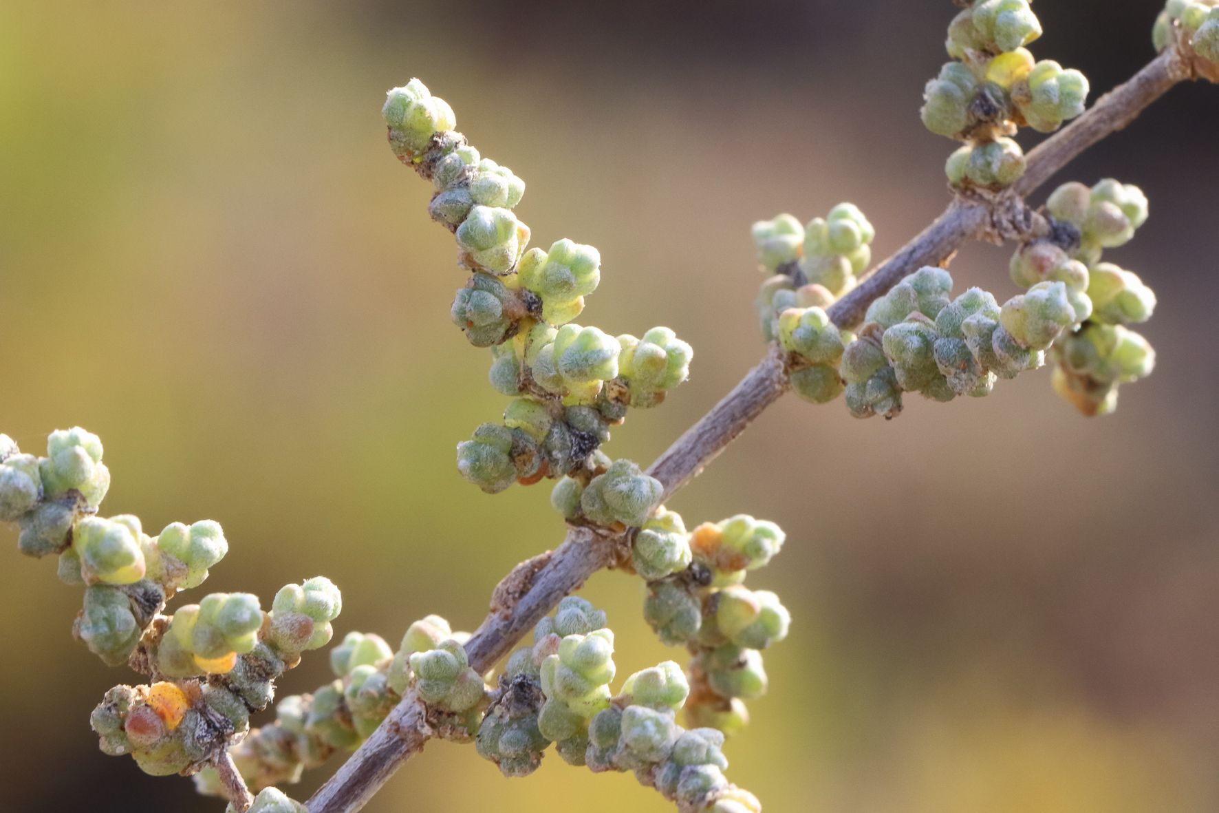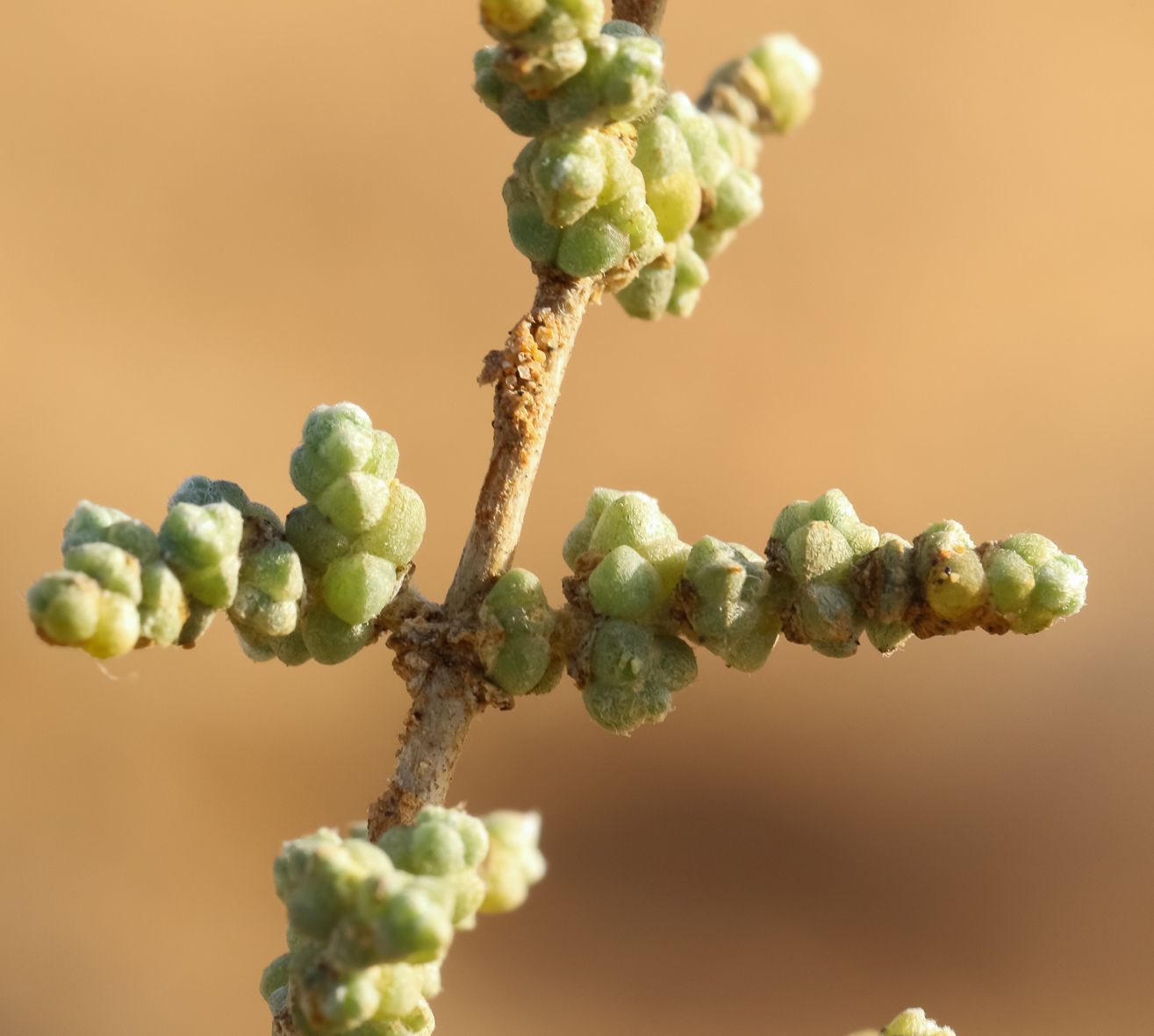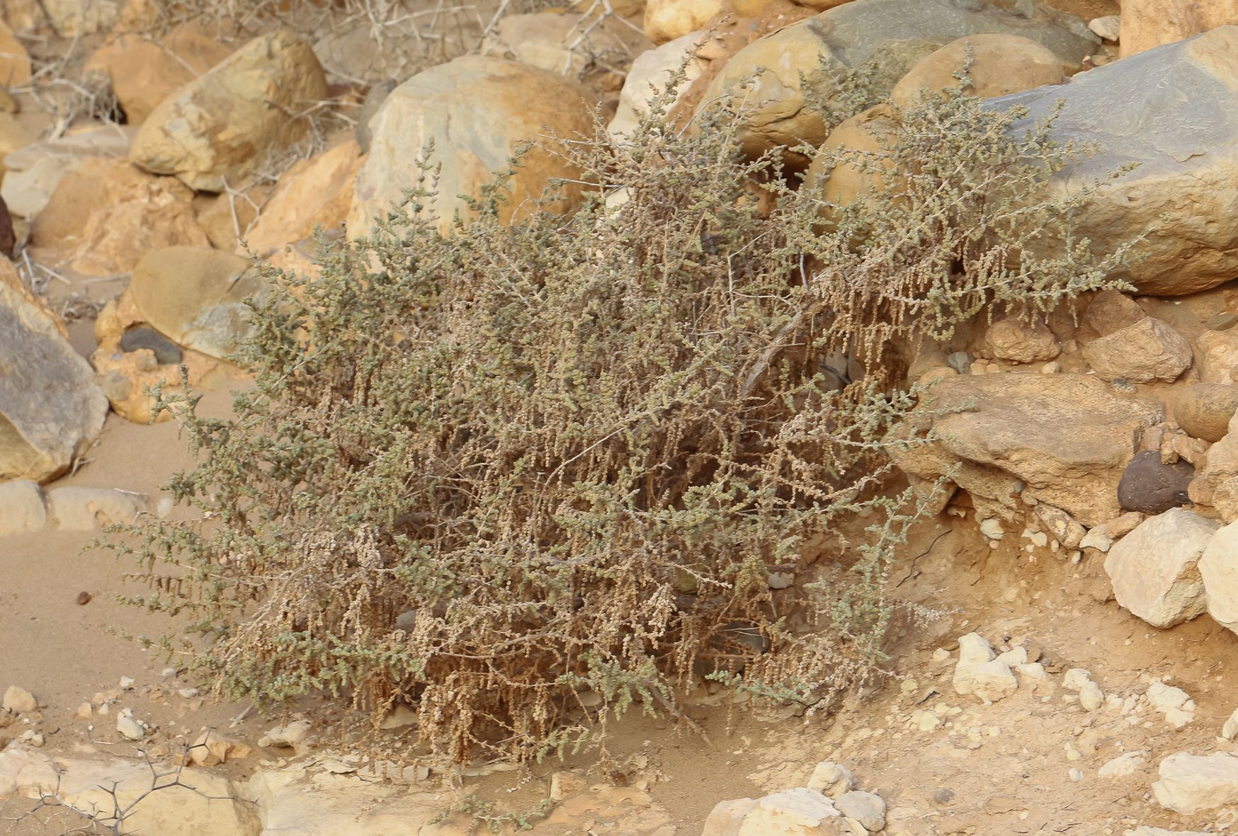 Caroxylon tetrandrum (Forssk.) Akhani & Roalson / Homotypic Synonyms: Salsola tetrandra Forssk. it is a subshrub and grows primarily in the desert or dry shrub land biome. it is a highly branched shrub up to 80 cm tall. The main branches have brownish bark, while the secondary and terminal branches have greyish-green bark. The leaves are sessile, opposite, scale-shaped, succulent, tomentose, with hyaline margins. The flowers are ⚥ (pentamerous), ♀, and ♂ (tetramerous), solitary in the axils of the bracts or in spikes at the end of the branches.