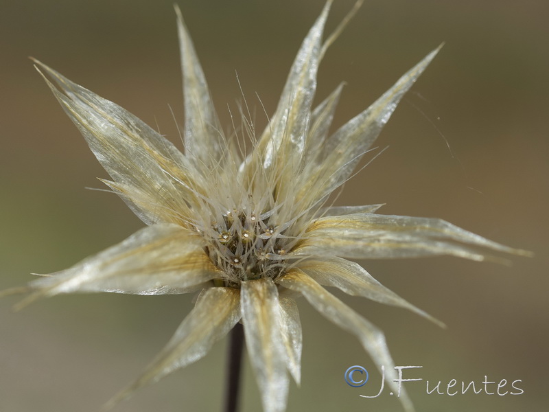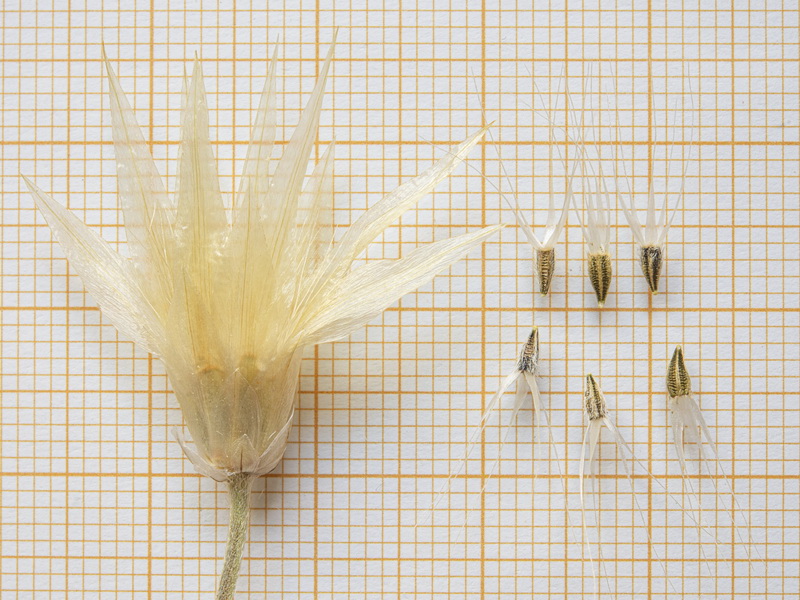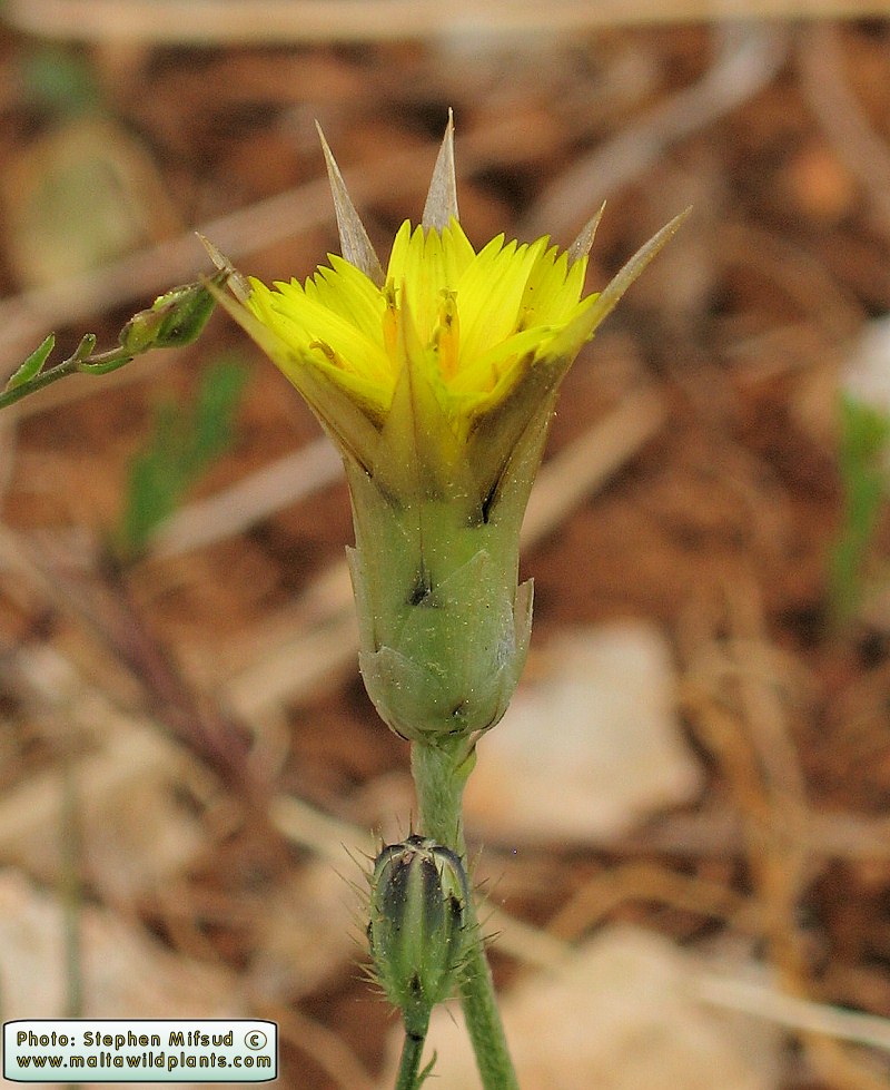 Catananche lutea L., it is an annual herb, appressed hairy. Stem somewhat thickened and fibrous at the base, giving rise to monocephalic fertile branches of up to 25 cm height. Leaves mostly crowded at the base of the stem forming a rosette, (50-) 70-120 x 6-9 mm. narrowly oblanceolate, attenuate into a short, dilated petiole; margins entire or weakly and sparsely toothed; leaves in the upper part of stem few or absent, linear, sessile. Capitula solitary, terminal. pedunculate and as well as sessile in the axils of the leaves of the rosette; peduncles 5-15 (-20) cm long, thickly villous hairy, with 2-3 small, extra involucral bracts below the involucre. Involucre 15-22 (-25) mm long. Involucral bracts (4-) 5-7 rowed, scarious with a brownish midrib. Outermost involucraI bracts 4.5 x 3-4 mm, broadly ovate, acute. Involucral bracts of 2nd row up to 6,5 x 4,5 mm. broadly ovate, acuto-aeuminate. Involucral bracts of the 3rd row up to 9 x 4.5 mm. ovate, acute. Involucral bracts of 4th row up to 13.5 x 4.5 mm, linear-ovate, acute. Inner most involucral bracts up 10 22 x 4 mm, linear-lanceolate or lanceolate, attenuate-acute. Ligules yellow, hairy on under surfaces. Cypsela up to5 mm long, 5-angled, stiff hairy; pappus dimorphic; pappus of the peripheral cypselas non-aristate, those of the central cypsela aristate.