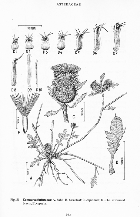 Centaurea furfuracea Coss. & Durieu, it is an annual herb, furfuraceous, arachnoid-tomentose with main stem reduced to an almost sessile head; lateral branches prostrate or procurnbtent. sparsely leafy, monocephalic. Leaves not decurrent on the stem. lyrate-pinnatifid, with lobes toothed. Basal leaves tapered below into a thin petiole. Cauline leaves sessile, semiamplexicaule. Capitula non-radiate, pale lemon yellow to whitish-crcam coloured, subtended by 2-3, small, shortly petiolate. spathulat: pinnalifid leaves. Involucres 10-15 x 10-15 mm (exclude, spines): involucral bracts coriaceous, without distinct nerves, with whitish to nearly hyaline, entire or minutely papillate, scarious margins; appendages coriaceous and somewhat corky, usually brownish or reddish at least in the center. Outer most involucral bracts 7-7.5 x 3.25 mm, broadly ovate; appendages reflexed, not decurrent on the margins of the involucral bracts, with 4 spines; spines yellowish; lateral spines 3, up to 1.5 mm long, terminal spine 2.25 mm; bases of the spines and appendages laterally hairy. Involucral bracts of the 2nd row 8-8.25 x 3.5 mm. similar to the preceding, with appendicular spines5; lateral spines 4, 1.75 mm long. terminal spine c. 3 mm long. Involucral bracts of the 3rd row 10-10.5 x 4 mm. ovate; appendages brownish, reflexed, 5 pinnately arranged spines, 2 lateral pairs and one median, the lateral spines up 10 2.5 mm and median spine up to 5 mm. Involucre bracts of the 4th row 11.5-12 x 4 mm, similar to the preceding one, appendages brownish in the center with weakly scarious, ± decurrent margins, strongly reflexed. Involucral bracts of the 5 row 14-15 x 3.5 mm, ovate lanceolate; appendages narrow, brownish in the center with marginal searious. with 6 pinnately arranged spines; lateral spines up to 3 mm, terminal spine up to 4 mm. Involucral bracts of the 6th row 16 x 3 mm, lanceolate; appendages strongly reflexed. with center brownish or reddish. with very thin. hyaline, up 10 0,75 mm wide. decurrent membranous, laterally bearded margins; lateral spines up to2,5 mm, median spine up to4 mm. Involucral bracts of the 7th row 16 x 2 mm, linear or linear-lanceolate; appendages brownish or reddish in the center with very thin, hyaline, c. 1 mm wide, decurrent membranous margin; lateral spinules c. 2 mm, median spinule c. 4 mm. Involucral bract of the 8th row 15 x 2 mm, linear lanceolate; appendages brownish in the center with broad hyaline, very thin infolded, decurrent margin, mucro-spinescent, muero c, 2.25 mm, directed backwards. Involucral bract of the 9th row 13 x 1.5 mm, linear; appendages brownish with wide. hyaline, very thin, decurrent margins, mucronulate at the apices. Inner most involucral bract 12 x 0.5 mm. linear, more or less scarious with very thin, hyaline, spathuliform membranous appendages. Cypsela yellowish, shiny with hilum a line hairy, (hairs caduceus); pappus equal in length to the body of the cypsela.