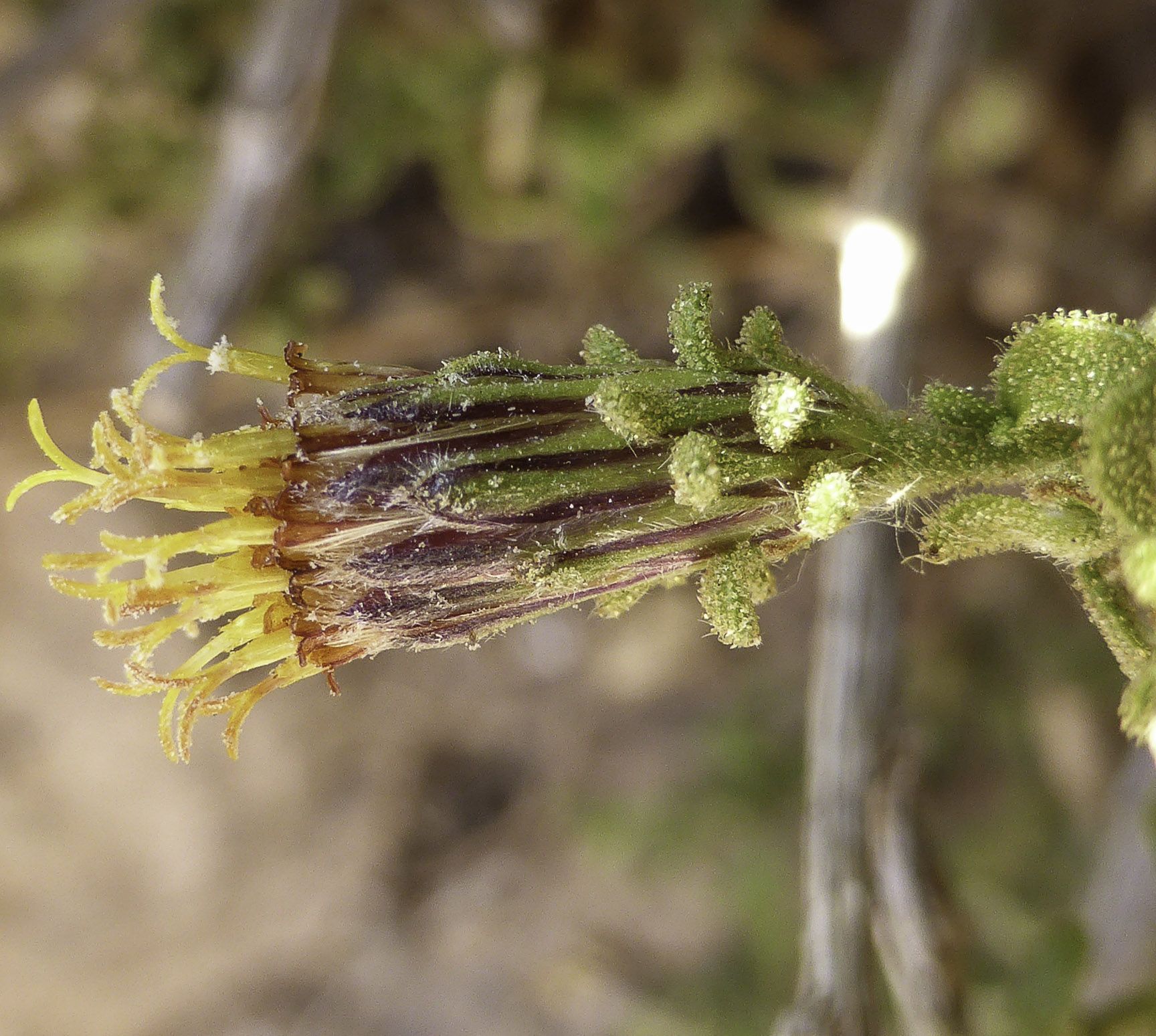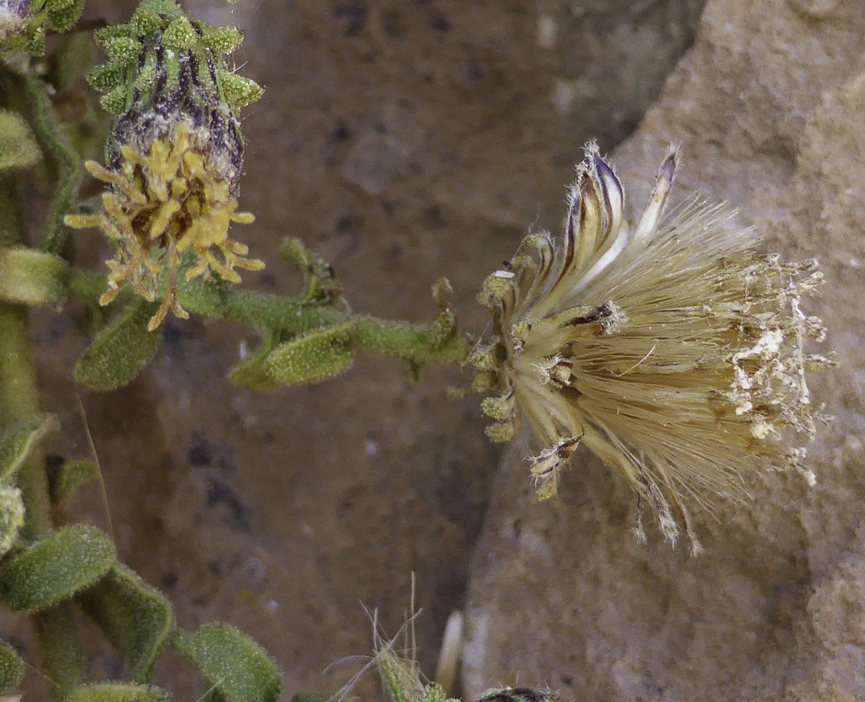 Chiliadenus rupestris (Pomel) Brullo / Homotypic Synonyms: Jasonia rupestris Pomel, it is a perennial similar to Chiliadenus glutinosus (L.) Fourr., but aromatic, with appressed glandular hairs. Leaves dentate-undulate. Capitula c. 1 cm in diam., with pale-purple florets, the outer involucral bracts with dark coloured apices. Cypsela of the marginal florets with 1-rowed pappus setae, those of the center with 2-row of 20-3O pappus setae.
