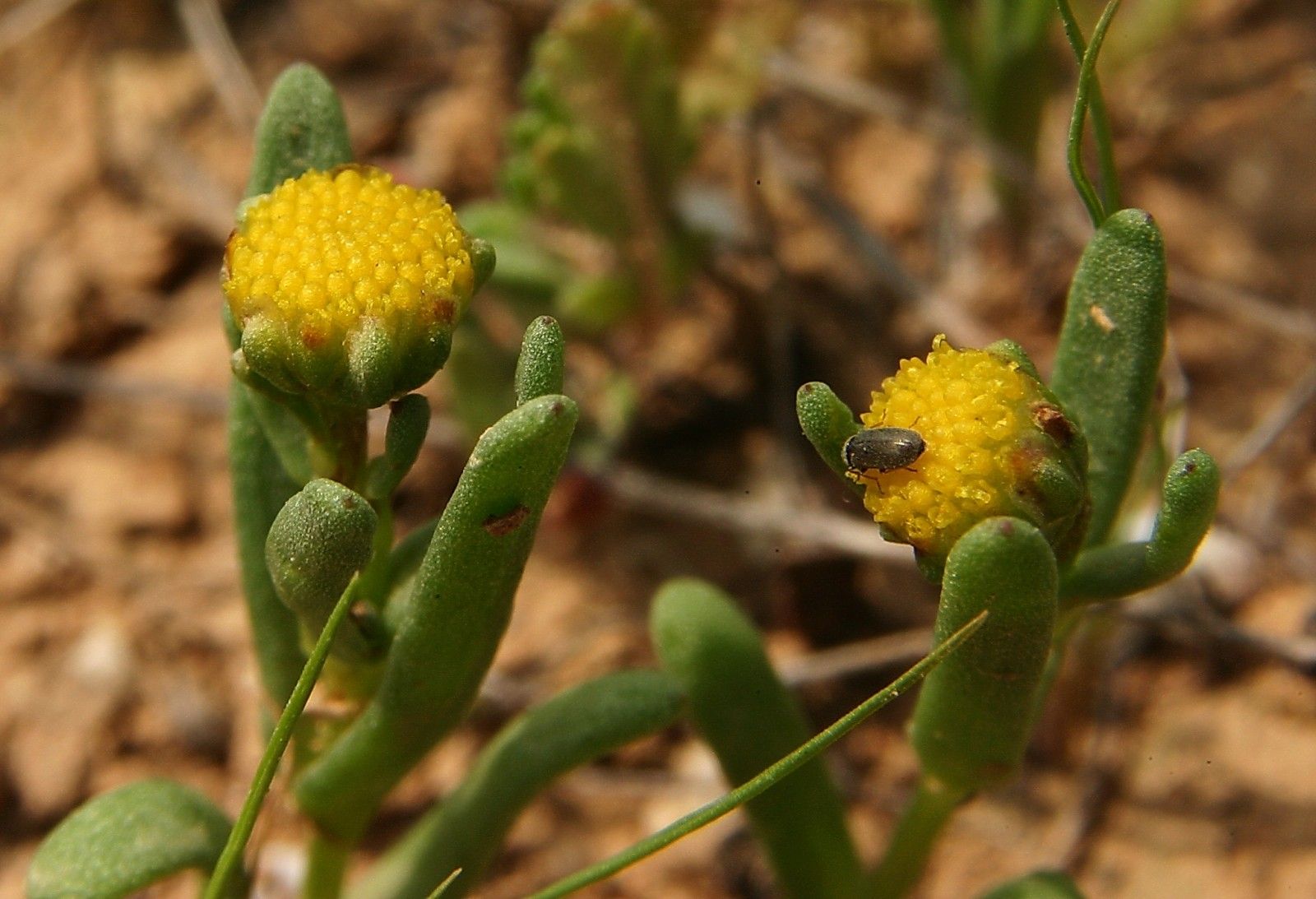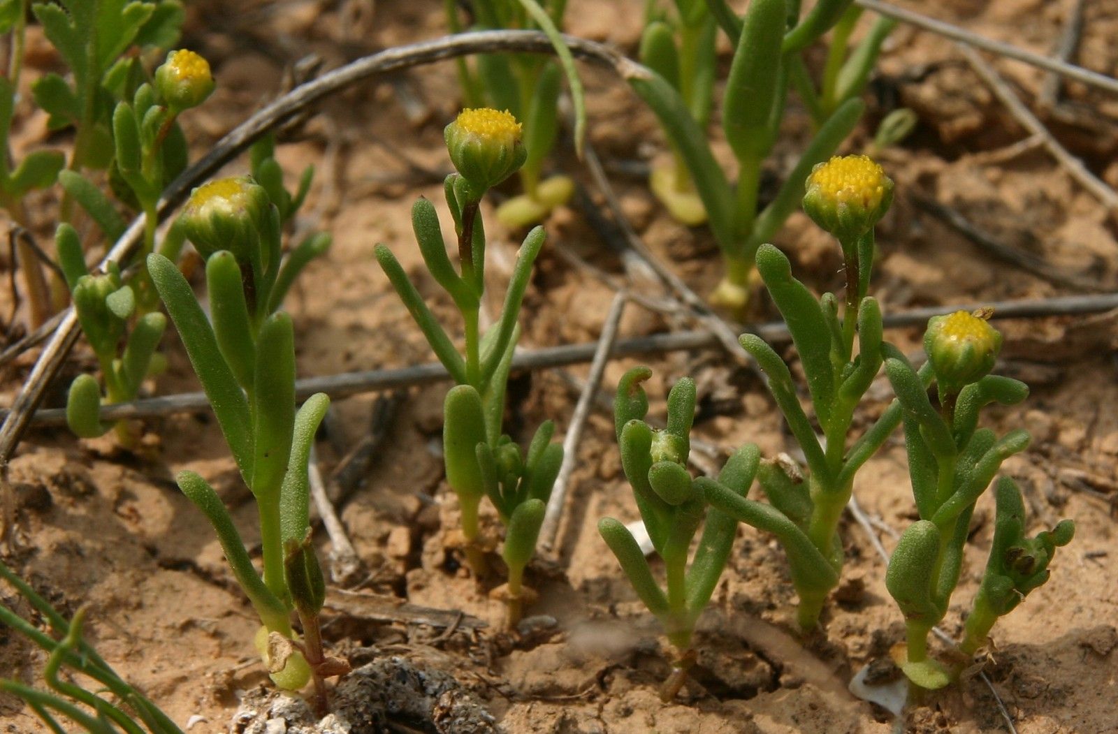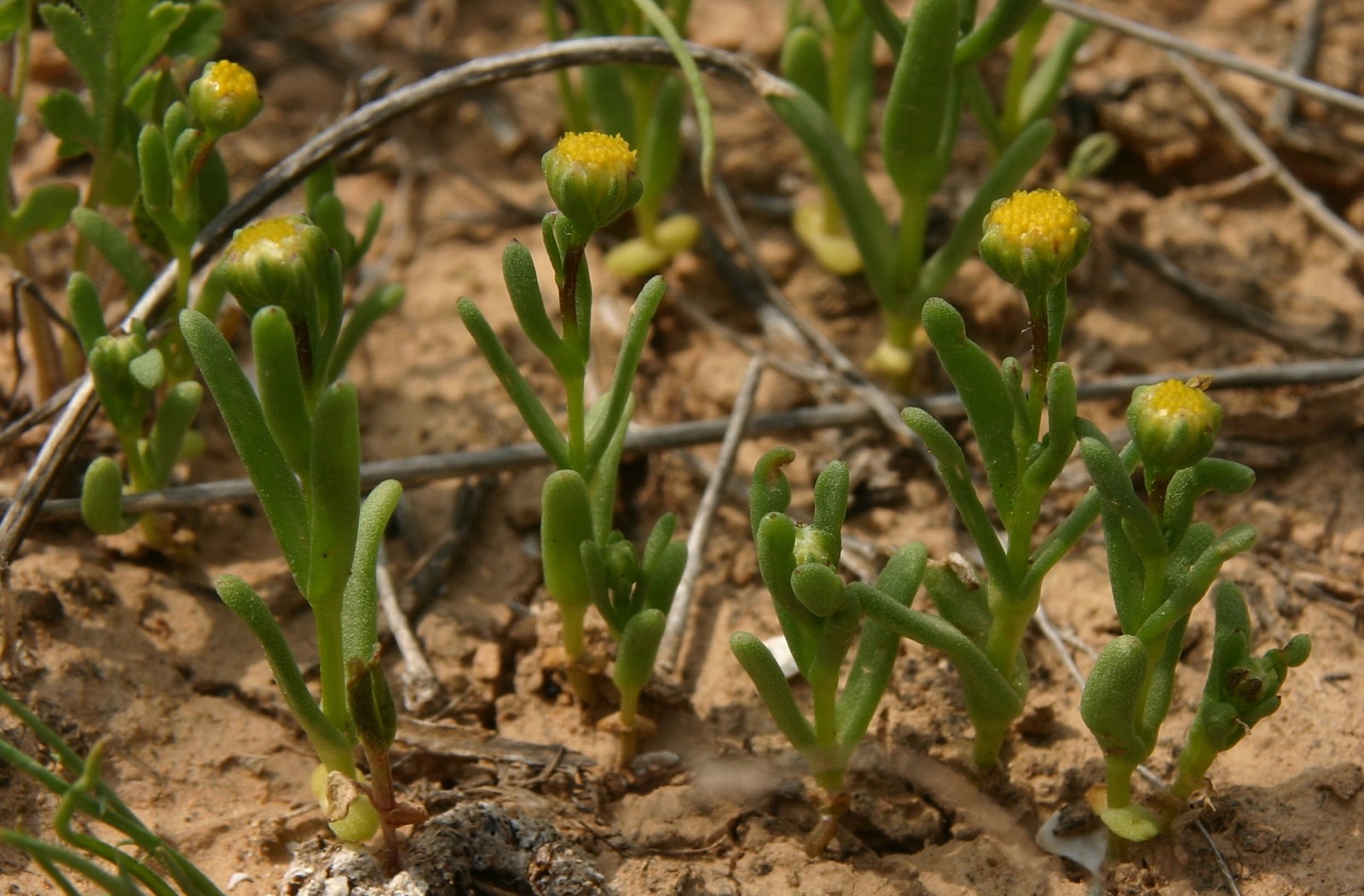 Chlamydophora tridentata Ehrenb. ex Less., it is an annual 7-15 (-20) cm, glabrous, with many basal tillers and very leafy. Stems simple to few-branched. Leaves linear to oblong, somewhat fleshy, 15-30 x 1-3 mm; the lower usually 3-toothed near the apex; upper entire. Capitula long pedunculate. 5-8 (-10) mm in diam. Involucral bracts (2-) 3-3.5 x 1.5-2 mm, obovate-oblong, obtuse, broadly scarious margined. Corolla 1.5 mm, yellow tipped. Cypsela 1-1.5 mm, dark brown, glabrous, ribs whitish, the peripheral ones weakly incurved, rest fusiform; pappus 1.5-2 mm long on the posterior side, scarious, auriculiform, obliquely truncate and lobed.