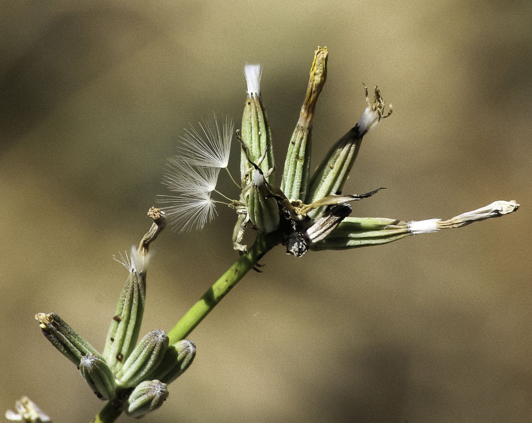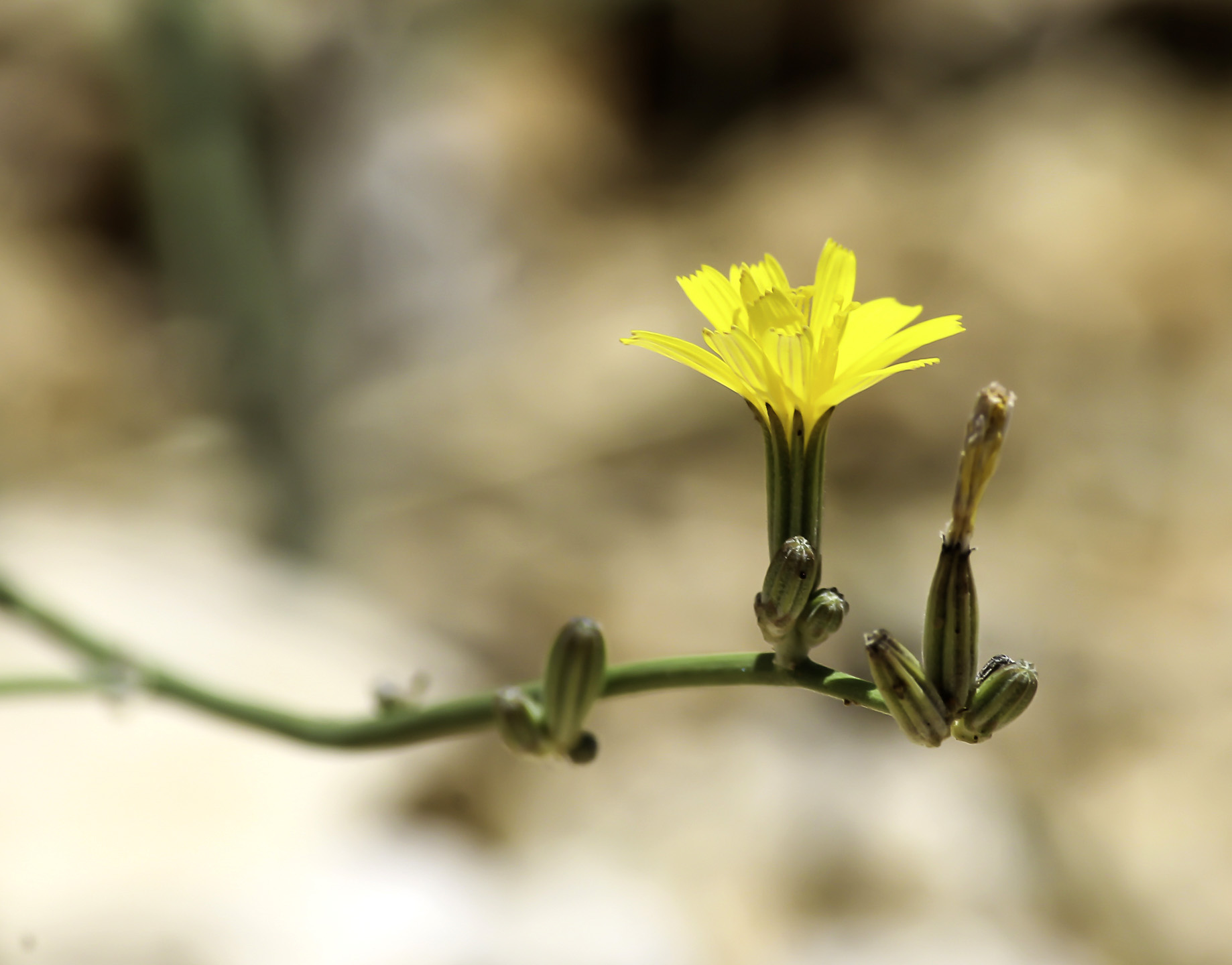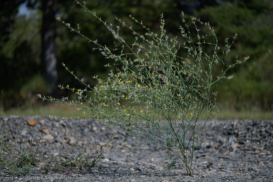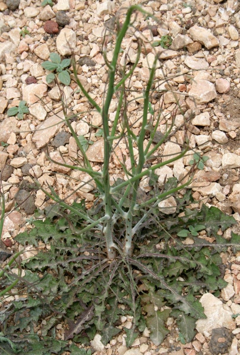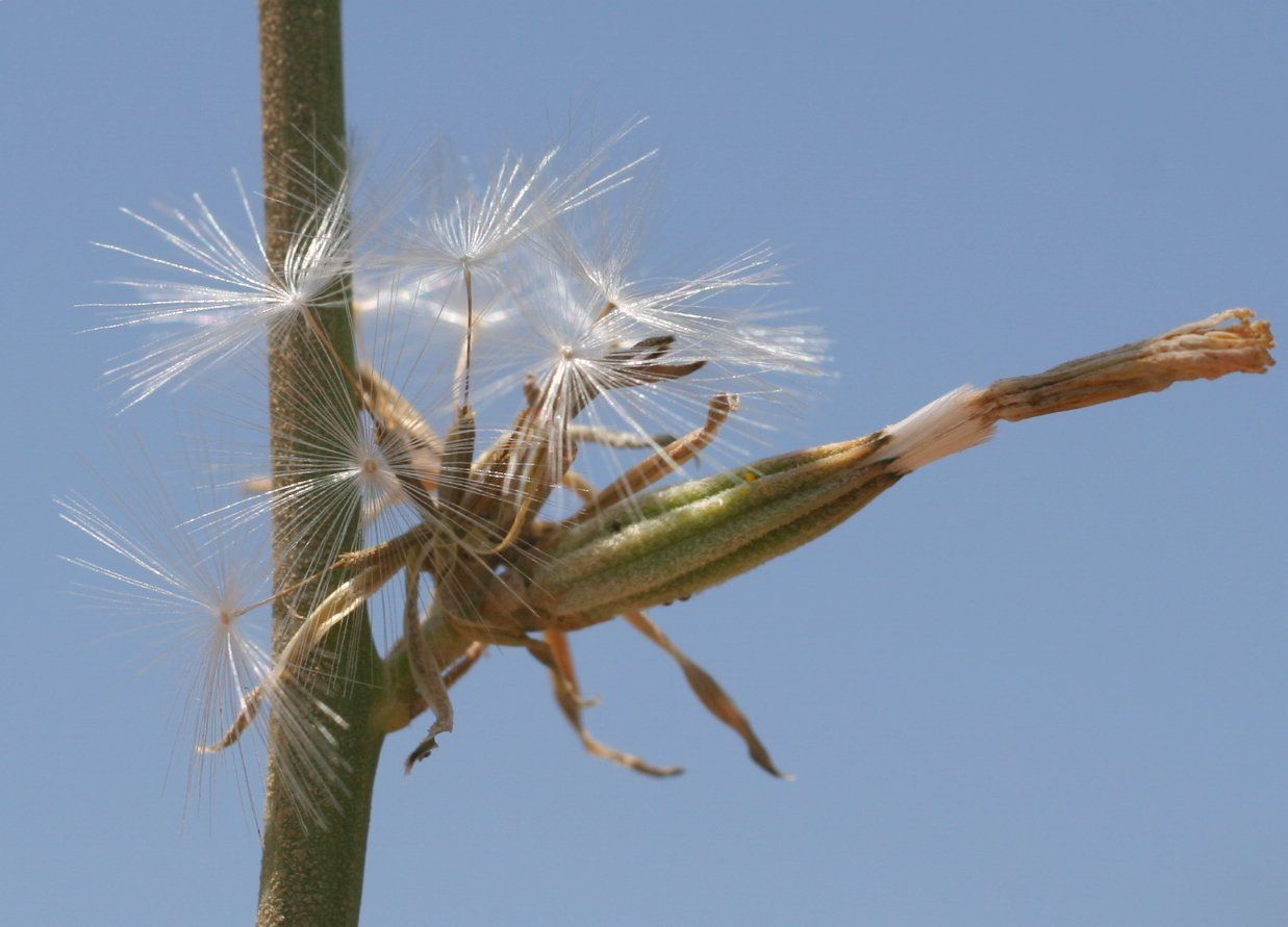 Chondrilla juncea L., it is a biennial to perennial, glaucous or greyish-green. hispid or glabrescent . Stems usually solitary, up to 40-100 cm, with numerous ascending, interlaced, slender and stiff branches; indumentum (when present) of rigid, retrorse hairs and sometime with short appressed hairs often confined to the lower parts. Leaves glabrous or with few rigid hairs. Basal leaves 40-120 x 15-45 mm, oblanceolate, ± acute, entire to deeply and irregularly runcinate dentate, attenuate into a short, winged petiole, soon withering. Lower cauline leaves smaller, usually like basal, the remainder long-linear, sometimes lanceolate, entire or denticulate. Capitula numerous, 9-12 flowered, terminal, lateral or axillary, solitary or in groups of 2-5, sessile or with short peduncles. Involucre 9-12 x 2.5-5 mm. Involucral bracts linear-lanceolate, obtuse to subacute, glabrous or sparsely tomentose, sometimes with a row of rigid hairs on the median line. Inner involueral bracts 7-9, searious at margins. Cypselas 8-10 mm (including 4-5 mm beak), pale yellowish-brown; beak slender, not articulated at the base; pappus c. 6 mm long.