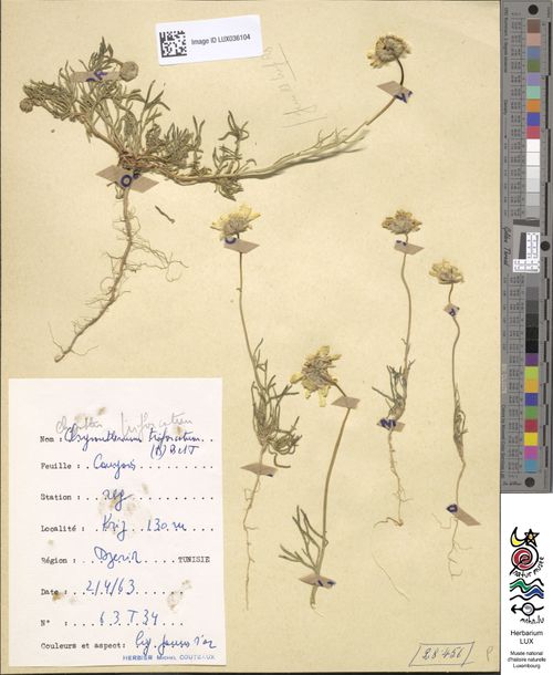 PAMPANINI, R. (1914). Piantae Tripolitanae, ab auctore anno 1913 […] – Firenze: 257 – under: Chrysanthemum trifurcatum var. microcephalum Bég. & A.Vacc.