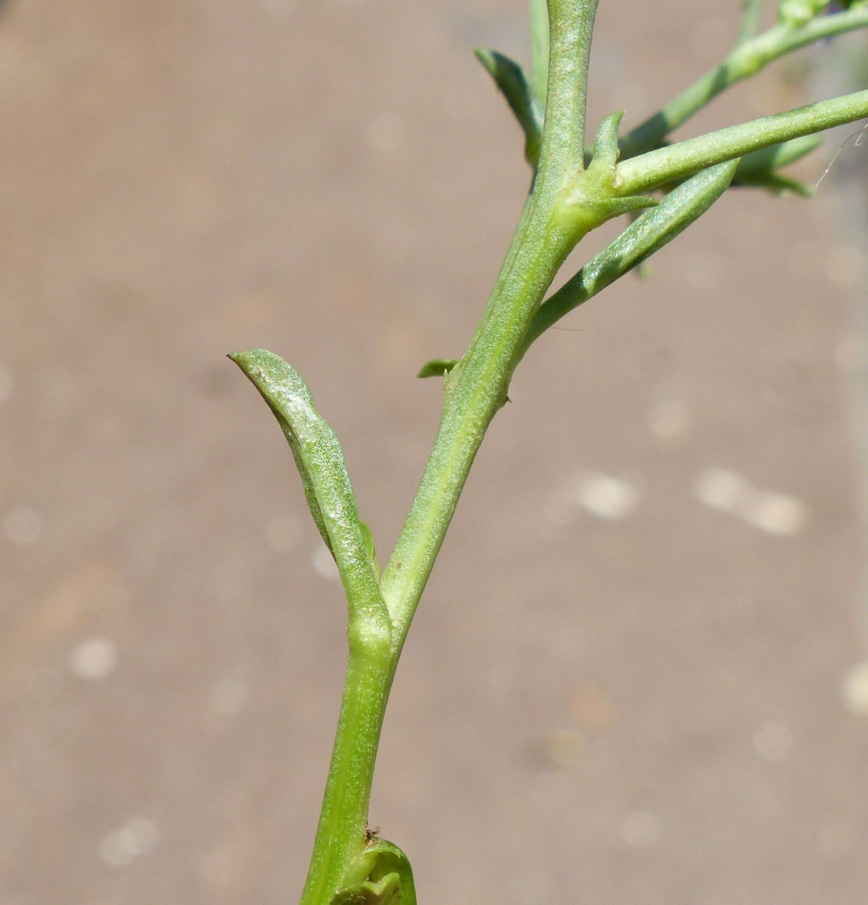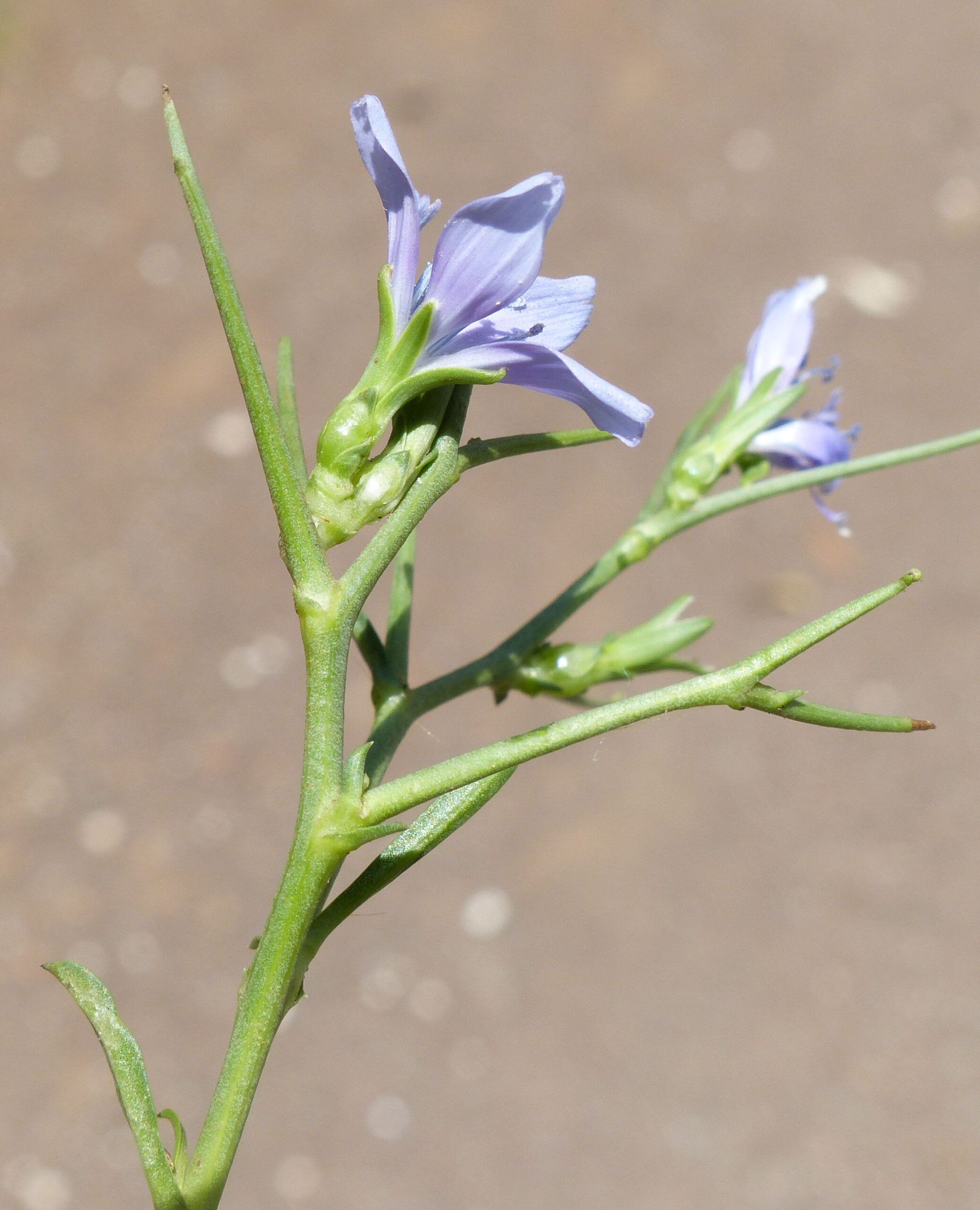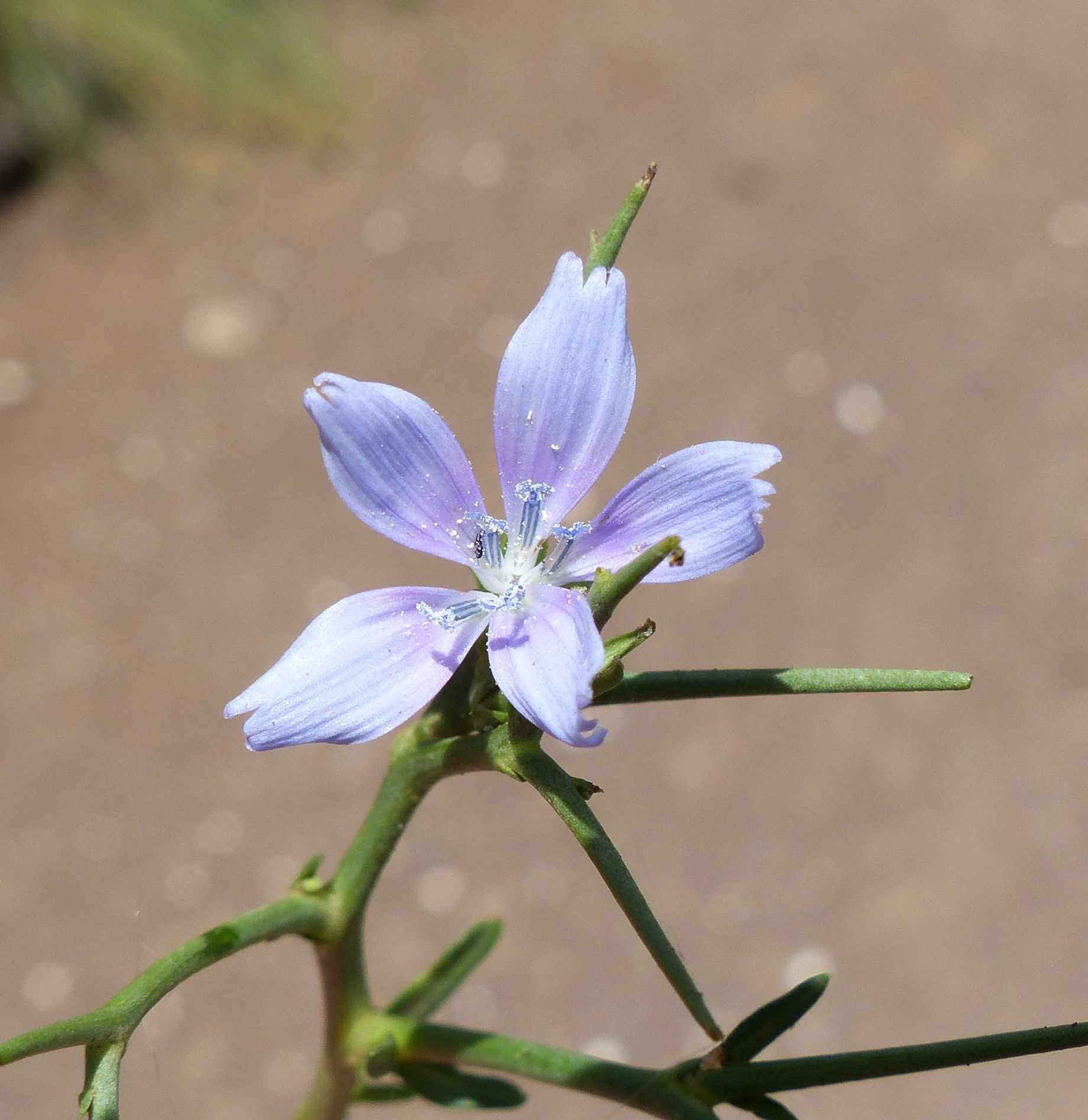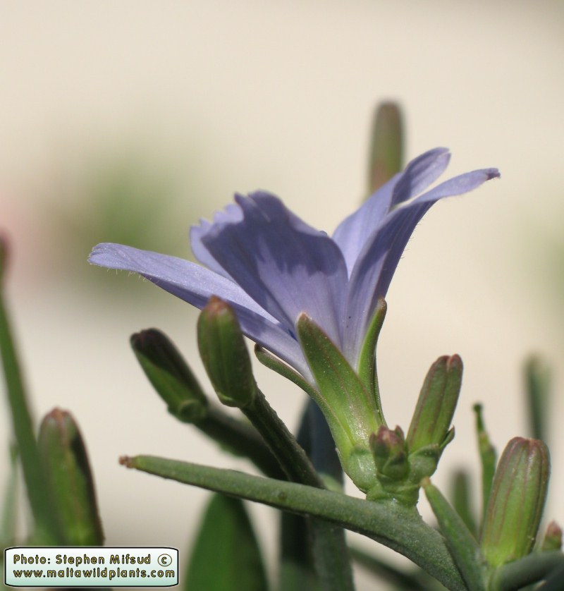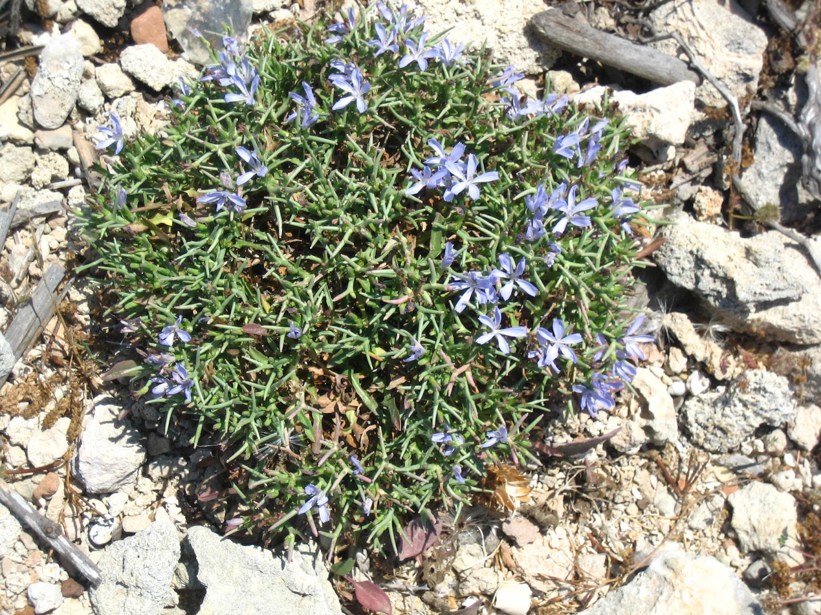 Cichorium spinosum L., it is a dwarf perennial with a woody stock. Stems 3.5-18 cm, divaricately branched from the base, the upper branches non-flowering and spine-like. Leaves 2-9 x 0.2-1.5 cm, fleshy, runcinate or dentate, glabrous. Capitula mostly in the dichotomies of the stem, sub sessile in groups of 1-4. Involucre 5-8 x 2-3 mm; outer bracts ovate to broadly elliptical, the inner lanceolate, c. 3 times as long as the outer. Ligules blue, rarely pink or white, about twice as long as involucre. Achenes 1.5-2 mm; pappus-scales 1/10-1/8 as long as achene.