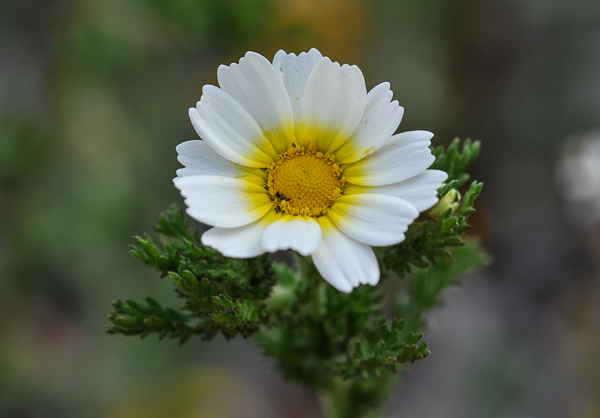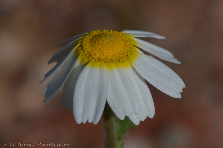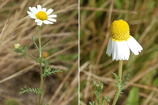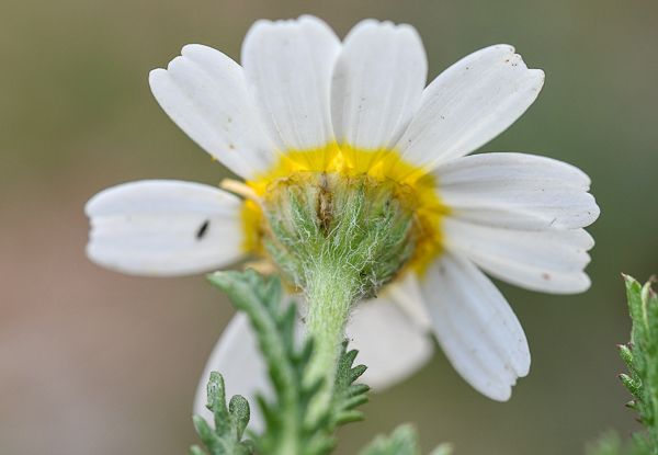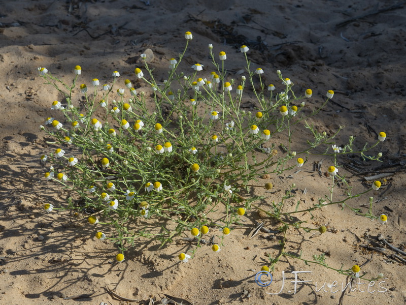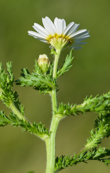 Cladanthus mixtus (L.) Chevall. / Homotypic Synonyms: Chamaemelum mixtum (L.) All,  it is an annual herb, fragrant,  up to 10-40 cm tall, pubescent. Stems erect or ascending, branched. Leaves pinnatipartite, with entire or incised segments, decreasing towards the base. Capitula solitary at branch ends, conical receptacle with cartilaginous scales, hairy at the apex, lanceolate, acute, folded longitudinally. Involucre with appressed bracts, broadly scarious. Ray florets c. 12, white with yellow base or concolourous yellow. entire neuter; ligule 7-10 mm. palent, becoming reflexed at maturity. Disc corolla c. 2.25 mm; appendage 1.25 mm.  Achenes very small, about 1 mm long, yellowish, with three very fine ribs on the inner face.