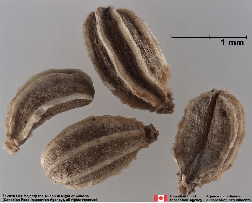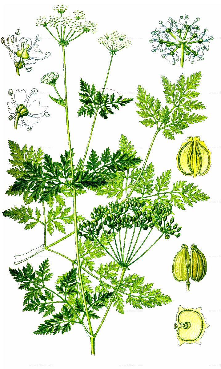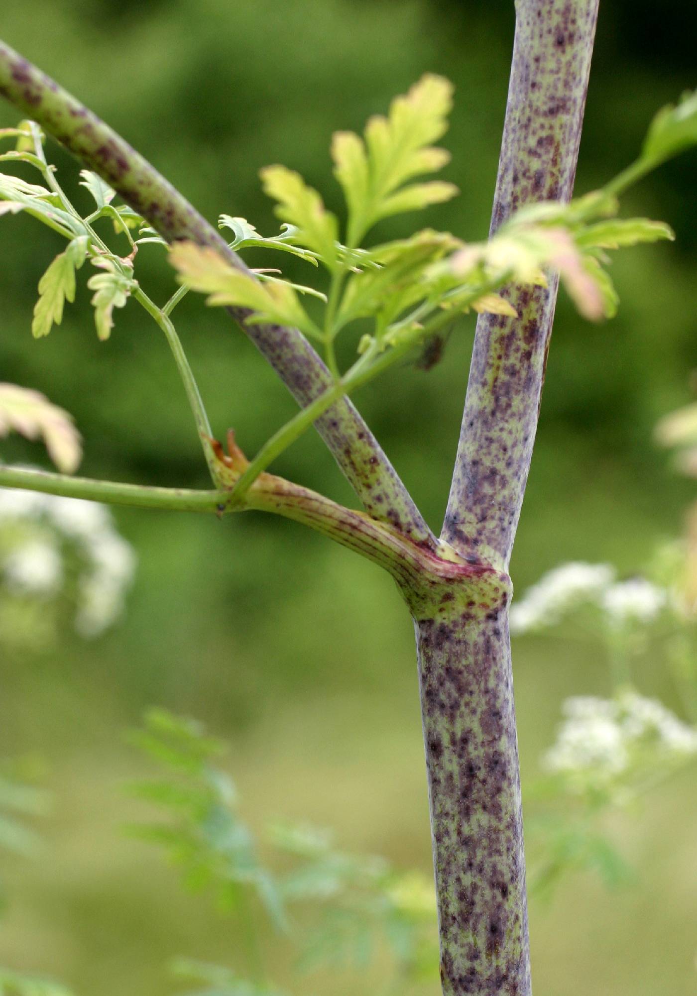 Conium maculatum L., it is a biennial or perennial herb, erect, almost glabrous, up to 0.5-2.5 m tall, fusiform rooted, with unpleasant mousy smell when bruised. Basal leaves on 15-60 cm long, petioles, broadly triangular, usually 30-50x 15-25 (-30) cm, (2-)3 (-4)-pinnatisect into ovate or oblong lobes with oblong-elliptic to oblanceolate, 5-20 x 2-7 mm, pinnatifid or pinnatipartite, acute, ultimate segments; upper leaves similar but sub sessile or nearly sessile with linear ultimate segments. Umbels 8-20, rayed, ± flat or convex, on leaf-opposed and terminal, 4-8 cm long peduncles; rays patent or erect,1-2.5 cm long, unequal. Bracts mostly 4-5, leafy, lanceolate-ovate, 2-3 x 1-1.5 mm, scarious margined, deflexed, caducous. Umbcllules 12-20-flowered. Pediccls c. 3 mm long at flowering stage. elongated up to c. 1 cm or more in fruit. Bracteoles 3-6, akin to bracts, 2-6 x 1-3 mm, connate at the base, shorter than the fruiting pedicels. Petals broadly obovate, 1-1.5 mm long and broad, emarginate at apices. Anthers ovoid-oblong, yellow. Fruit broadly ovoid to sub globose, 2.5-4 x 2-3 mm, greyish-brown; mericarps ± arcuate when ripe, dorsally rounded, with 5, prominent, pallid ribs.