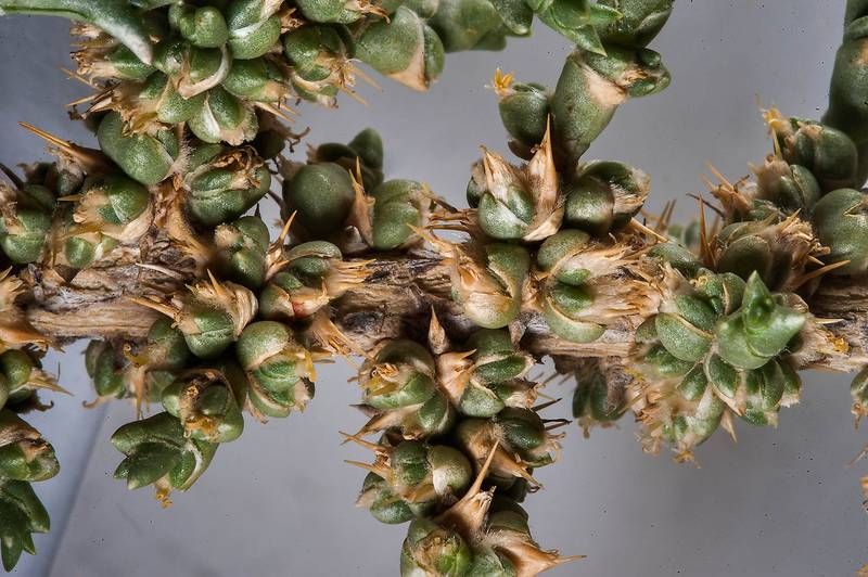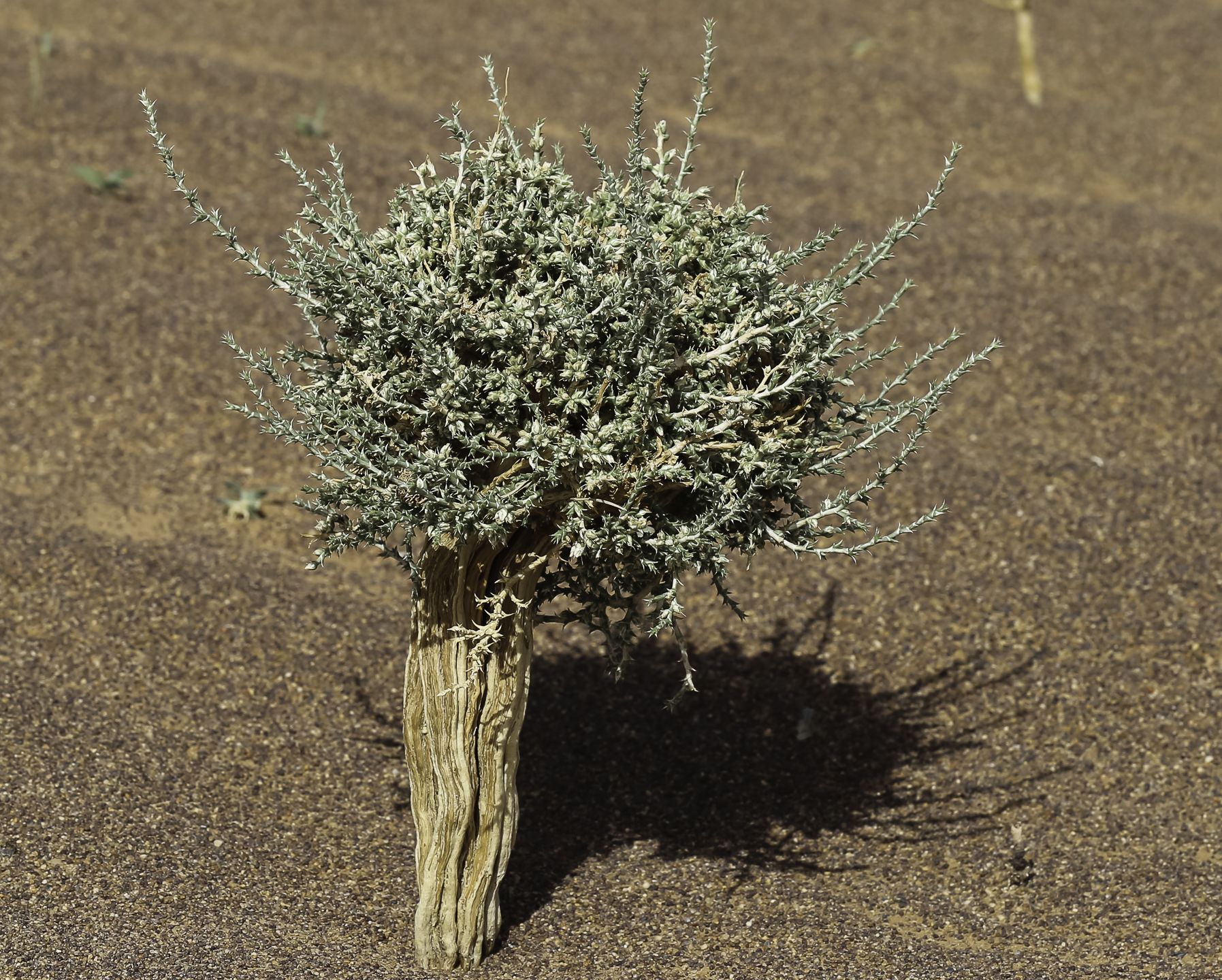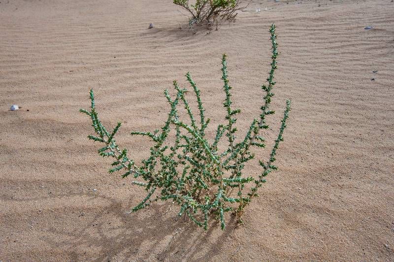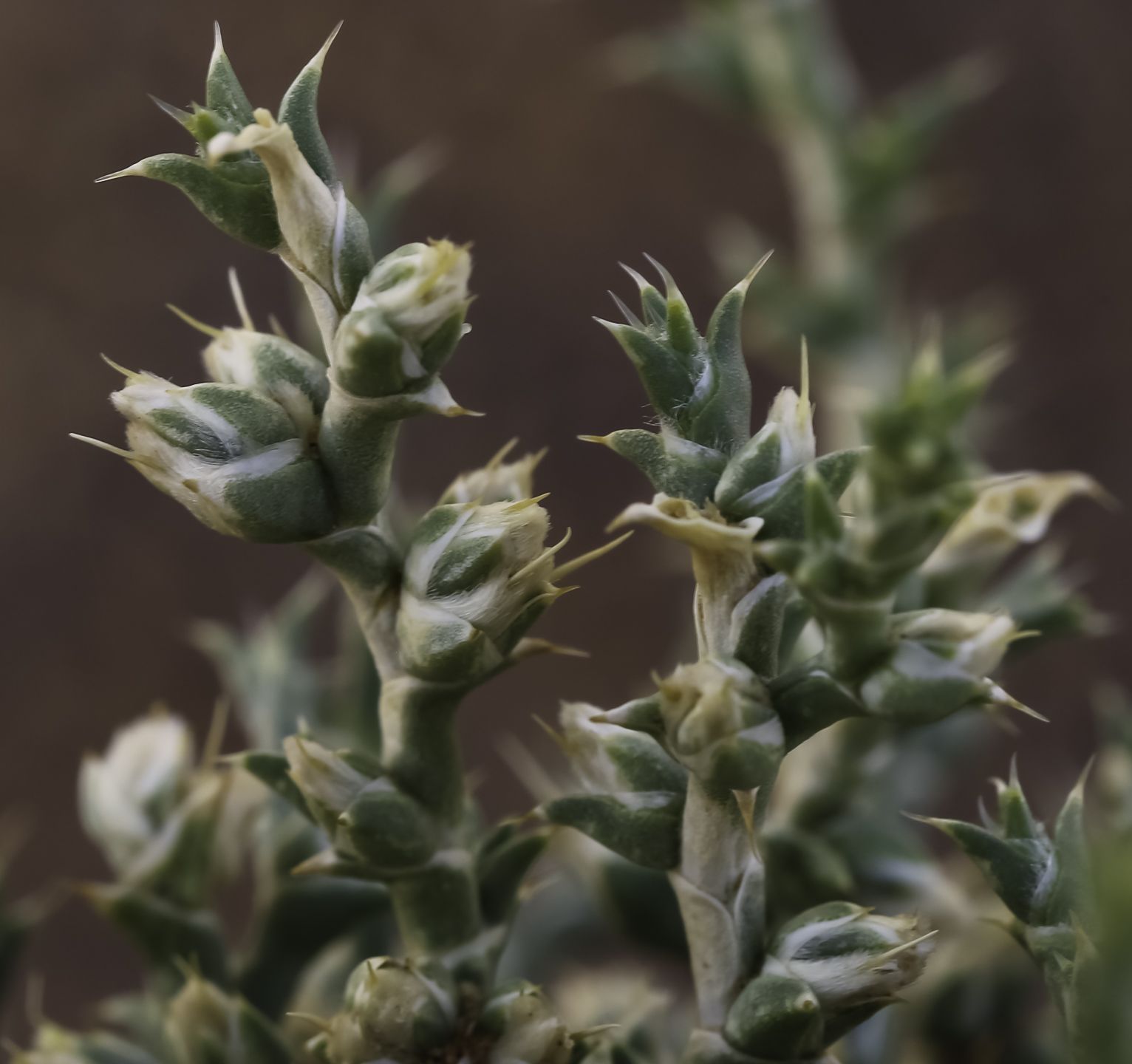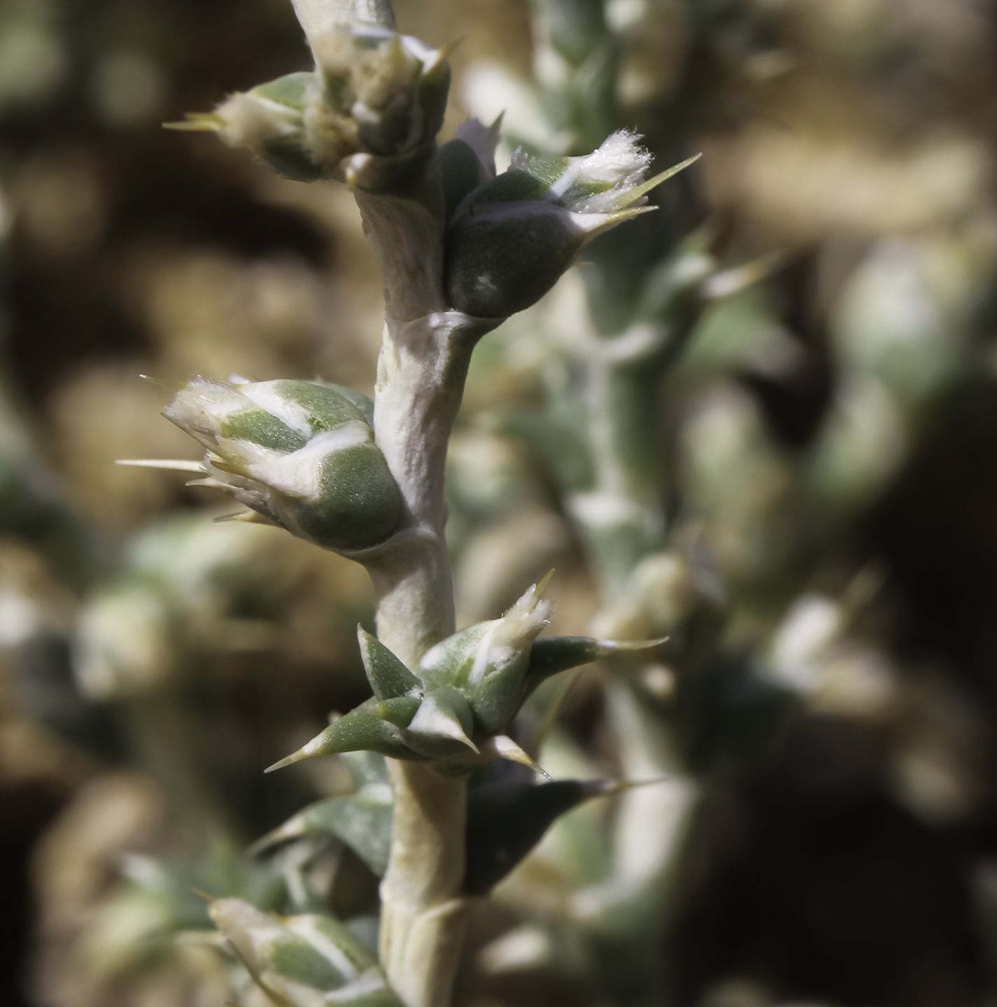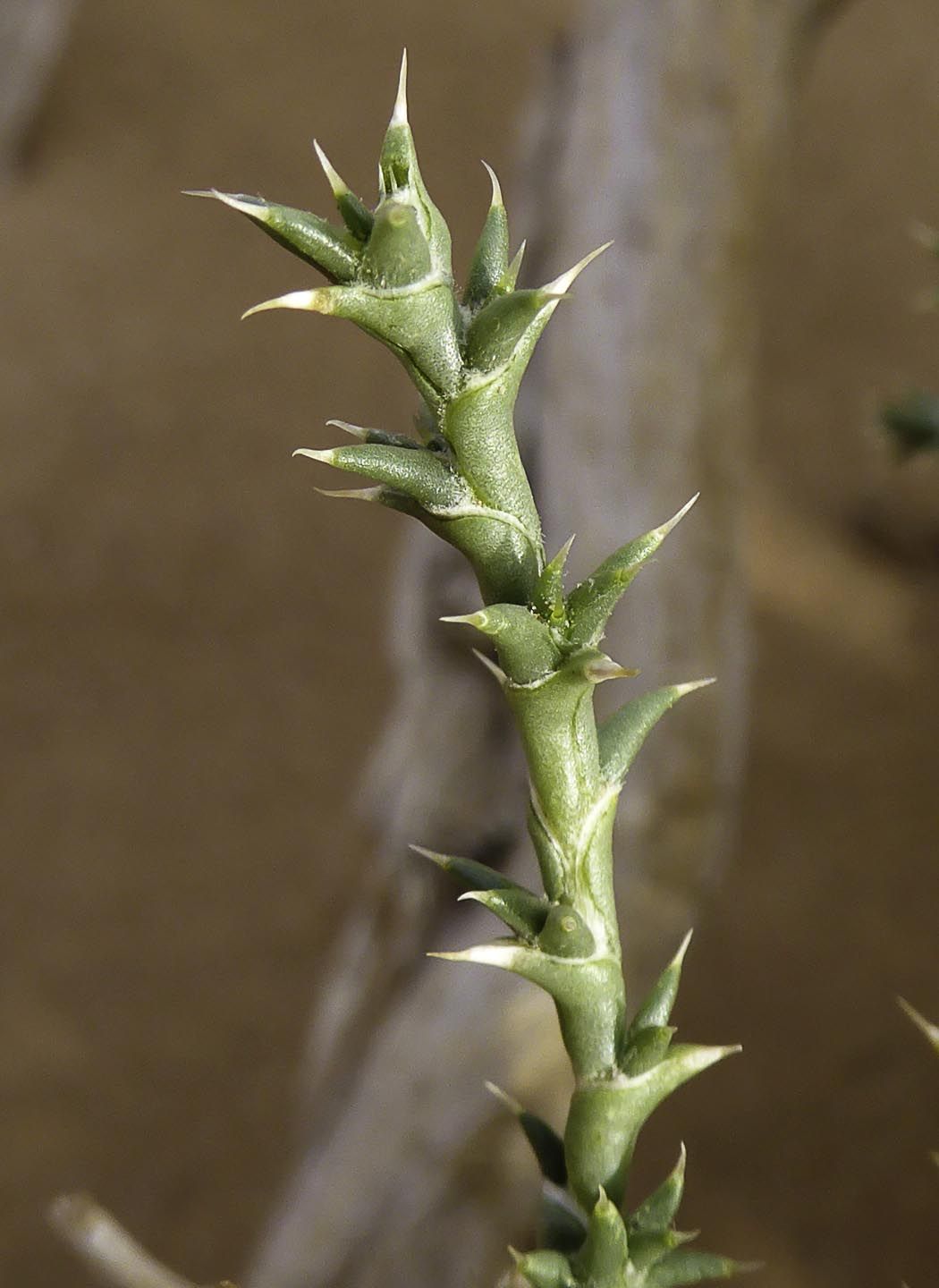 Cornulaca monacantha Delile, it is a straggling, branched, woody shrub growing to a height of 60 cm. The stubby bluish-green leaves are scale-like and clasp the greyish, wiry stems. They each have a single stiff spine at the tip, hence the specific name monacantha. Leaves up to 10 x 2 (-2.5) mm, recurved, tapering from a clasping base into a rigid spine, woolly in the axils, the leaves turn yellow or white when the plant is dead. The orange-brown flowers appear singly in the woolly leaf axils. Flowers 1-3 (-5) in each axil, exceeding the bracteoles; bracts up to c. 4 mm, spinescent. Perianth-segments c. 5 mm, linear, subspathulate, obtuse, ± denticulate at apex, coriaceous below, membranous above, the anterior one usually developing an up to 8 (-10) mm long spine at the back. The seeds are held vertically in an erect, flattened seed pod.