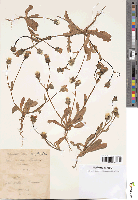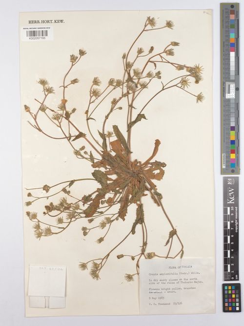 Crepis amplexifolia Willk., it is an annual herb, hispid, up to 10-40 cm. Basal leaves petiolate, dentate to lyrate pinnatifid. Cauline leaves truncate or cordate and amplexicaule at the base. Capitula many flowered. Involucre 8-14 x 4-7 mm. canescent-tomentose and finely glandular pubescent. Inner involucral bracts indurating and enclosing the peripheral cypsela at maturity. Cypsela dimorphic, 4–6 mm; peripheral cypsela, attenuate above, unbaked; inner cypsela abruptly contracted into beak; beak as long as the cypsela body; pappus 3-5 mm. 1-seriate, very fine, soft, and deciduous.