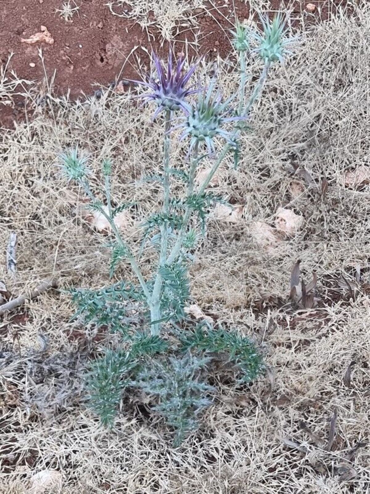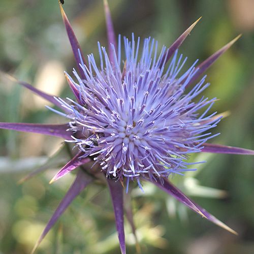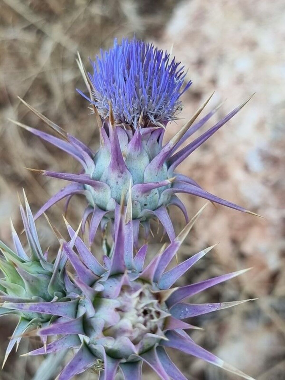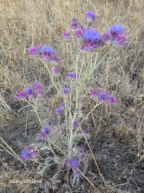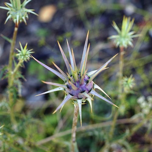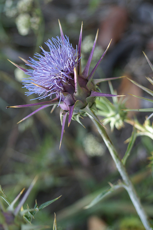Cynara cyrenaica Maire & Weiller, it is a perennial with moderately thickened root-stock, a roseate shape of leaves. The stem erect, up to 60 cm, arising from the center of the rosette of leaves, few branched, white-arachnoid-tomentose becoming glabrescent, branches monocephalic. Basal leaves up to 30 x 8 cm, pinnatisect, broadly lanceolate in outline, dark, shiny. glabrous-green on the upper surface and white arachnoid-tomentse on the under surface, petiole short, broad and ± sheathing at the base with margins shortly spinulose, rachis in the lower part narrow becoming broad and sheatinged towards the apex, primary lateral lobes broadly triangular-lanceolate, acute, pinnatifid, alternate to sub-opposite, with somewhat revolute margins, terminal lobule of the primary lobe ovate-triangular, entire or rarely sparsdy spinose-dentate, with 2-3 pairs of lateral spinulose lobules near the base, apex, with a sharp, pallid, up to 3 mm long spine, primary terminal lobe lanceolate, sometimes pinnalifid with spinulose lobules. Cauline leaves few, similar to the basal leaves but smaller and sessile. with broadly winged rachis. Capitula on ± naked peduncles, solitary, c. 2.5 cm (exclude. spines) in diam. Involucral bracts coriaceous. Outer most involucral bracts few in number, cobwebby tomentose, shortly spiny at the apex. Middle and inner involucral bracts broadly ovate, with canaliculated, reddish, somewhat spreading appendages which terminate in to sharp, long (c. 5 cm) spines. Inner most involucral bracts linear-lanceolate, hardly spinescent. Corolla violet. Cypsela 5·6 x 2.5 mm. compressed, indistinctly ribbed, pappus c. 13 mm.