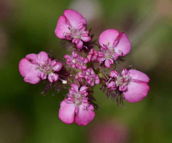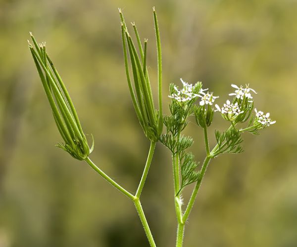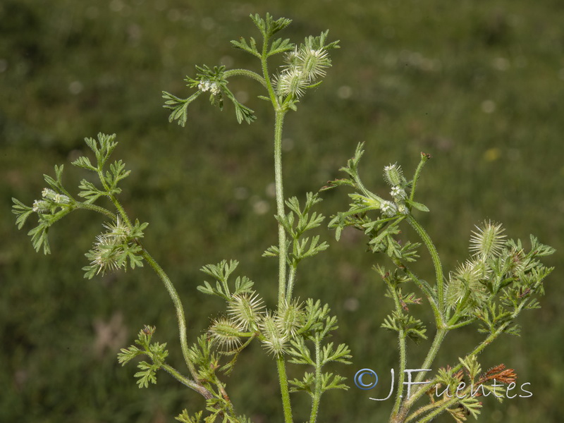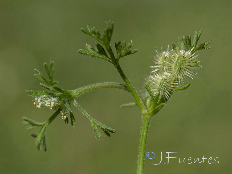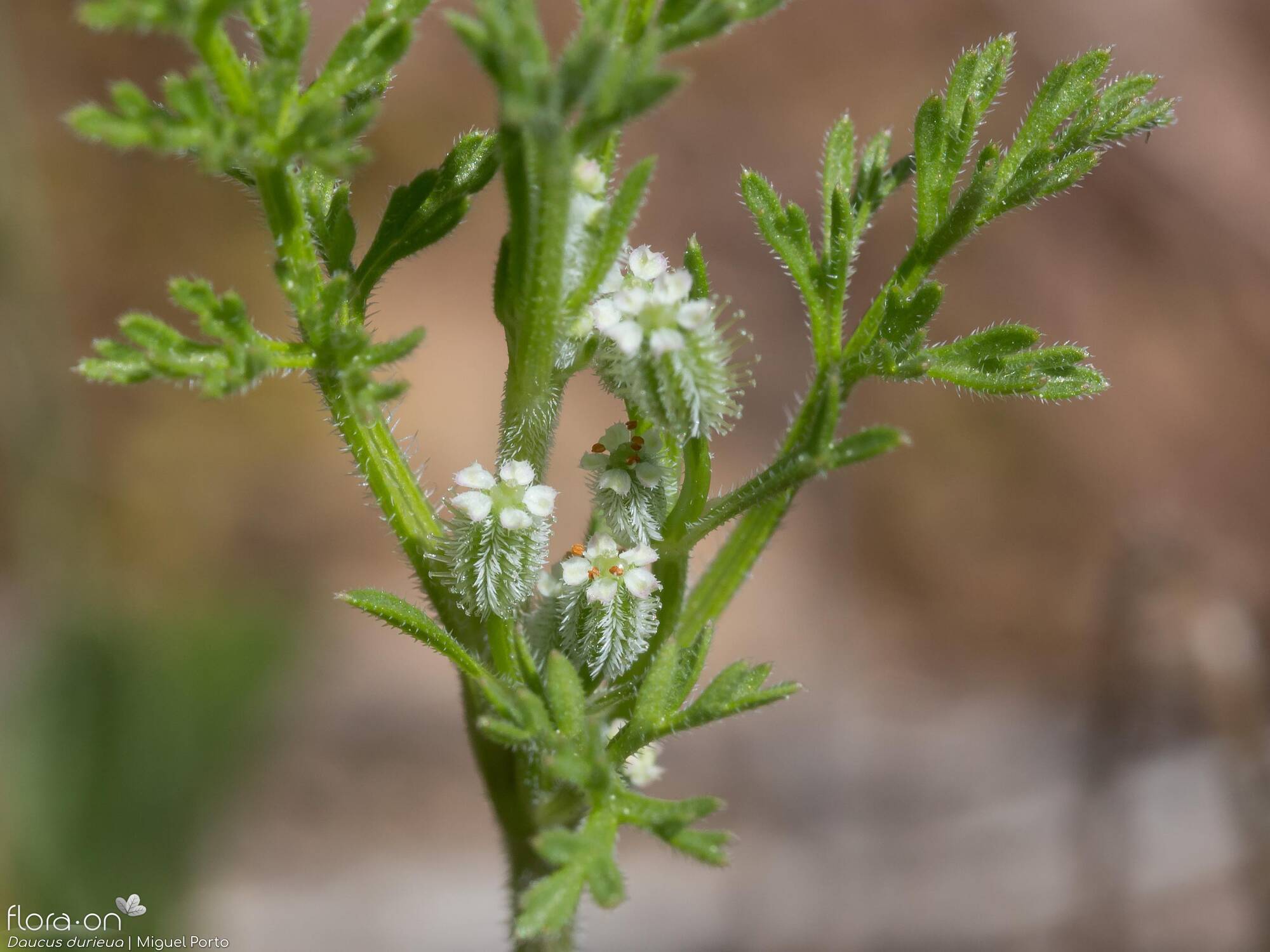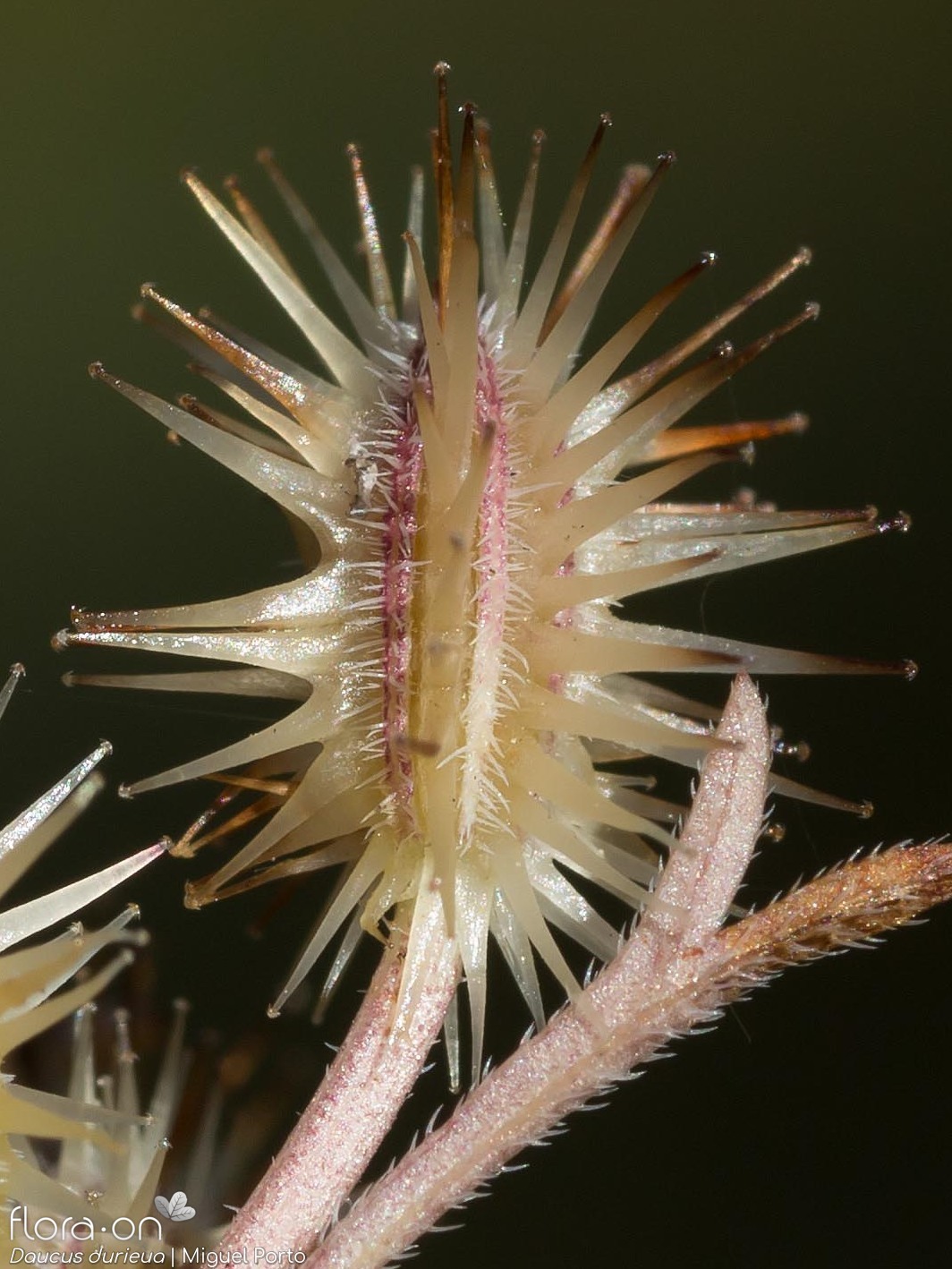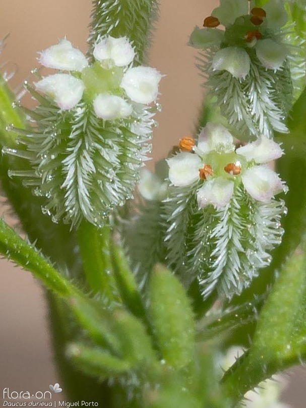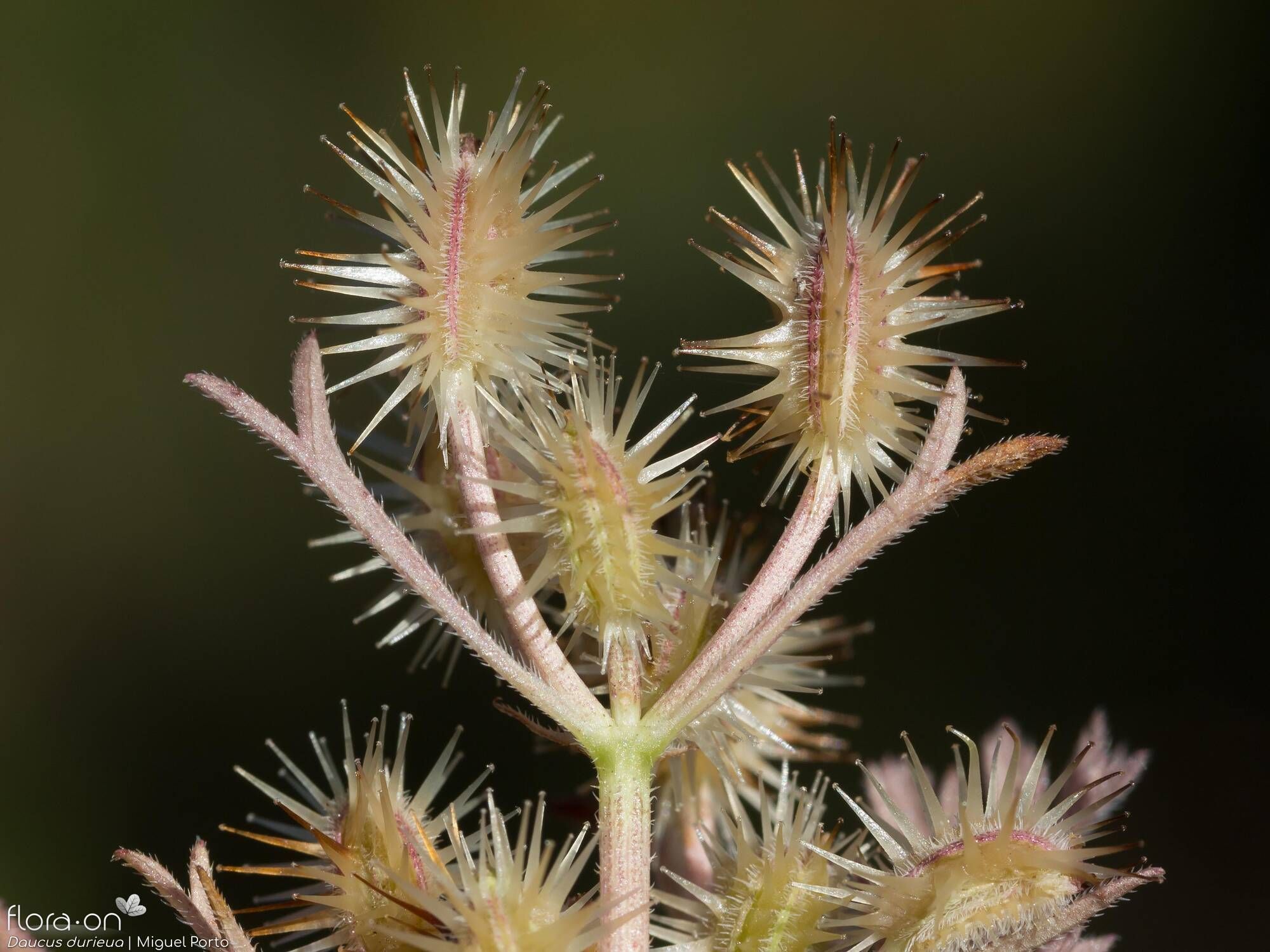 Daucus durieua Lange, it is an erect or ascending annual herb, up to20 (-30) cm tall. Stem flexuous, branched from the base, shortly hispidulous. Leaves petiolate oblong, 2-3-pinnate, usually 1-2 x 1-1.5 cm in outline; lobes lanceolate-linear, 1-2 (-3) x 0.5-1 mm, shortly hispid. Umbels sub sessile, leaf-opposed. Rays3-5, markedly unequal, inconspicuous to conspicuous, thickened. Bracts foliaceous, resembling the cauline leaves, several, unequal exceeding the umbellule, bracteoles 3-5, linear-lanceolate, entire or pinnatifid smaller. Flowers few (up to 5) in each umbellule; pedicels short unequal, thickened, up to 5 mm long. Petals very small, yellowish white. Fruits 4-6 x 1.5-2 mm, oblong-elliptical; primary ridges of mericarps with several rows of whitish short bristles; secondary ridges with conspicuous, often golden-yellow hispidulous-papillose, glochidiate spines, c. 2 mm long, confluent with each other at the bases, forming a narrow wing.