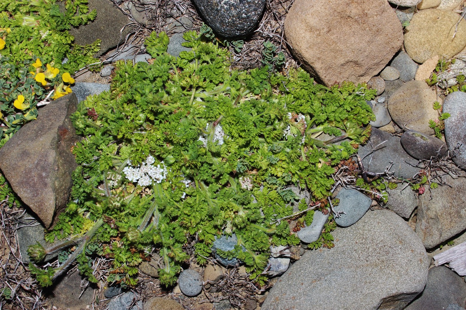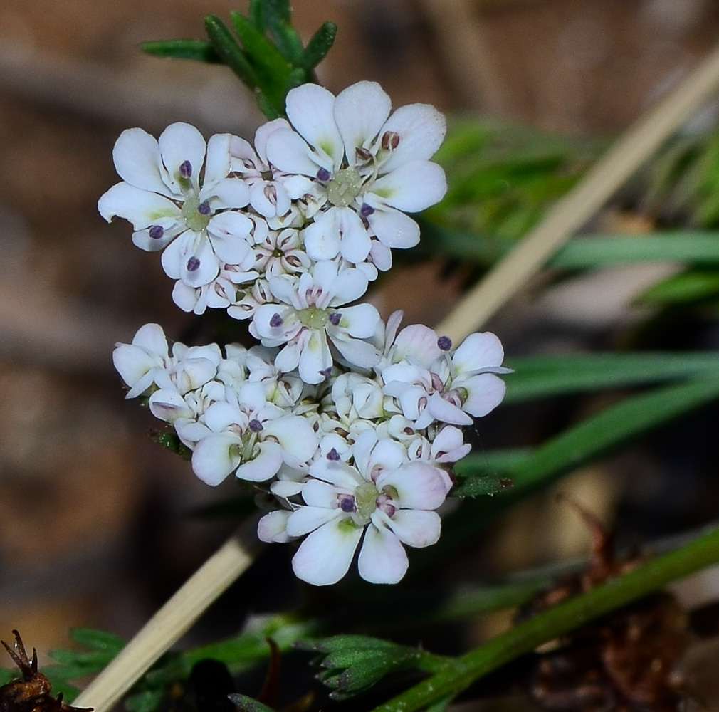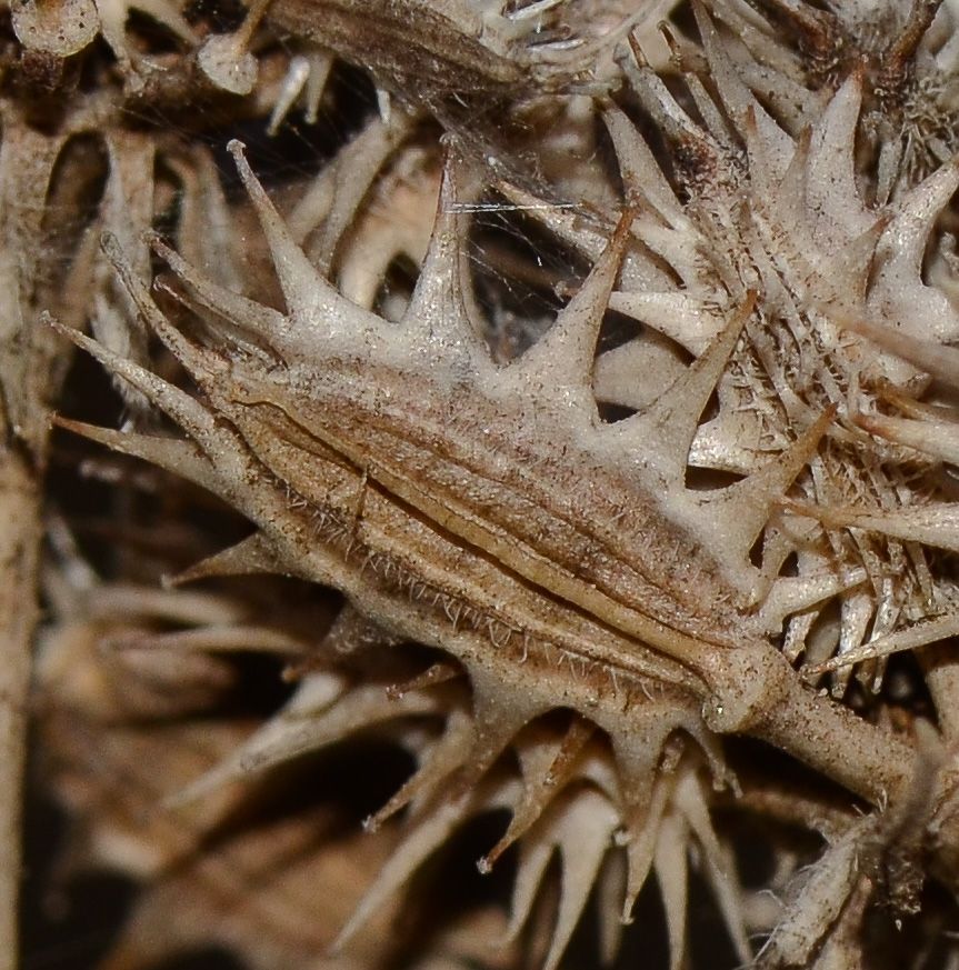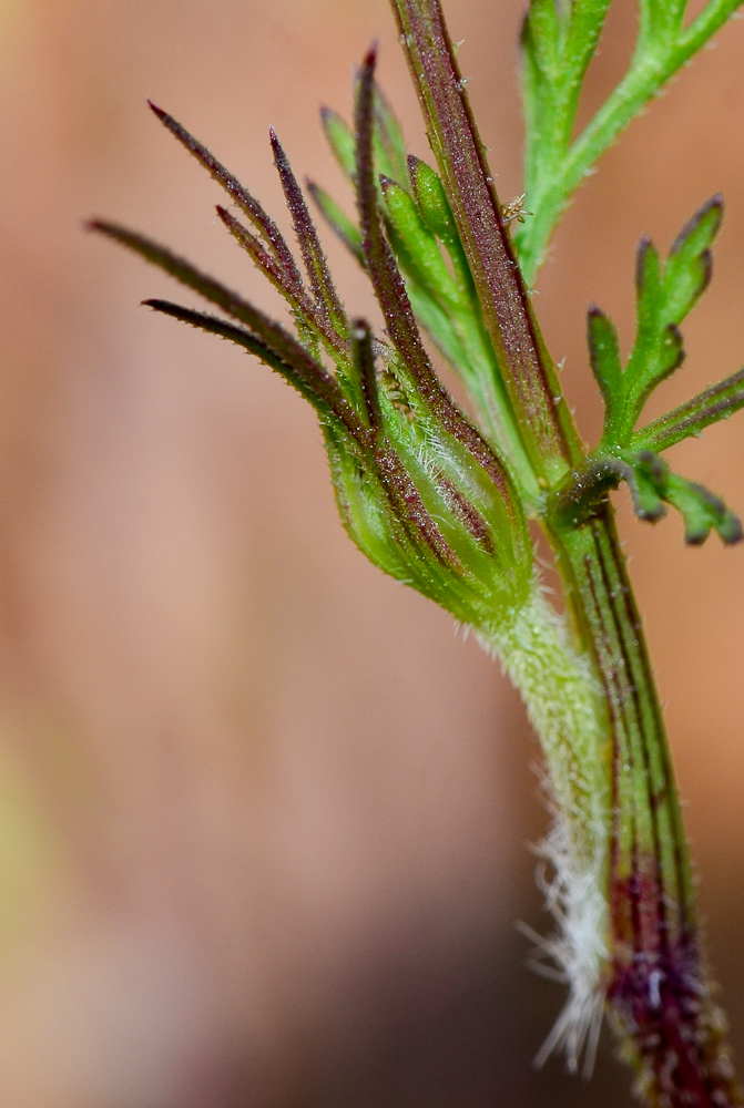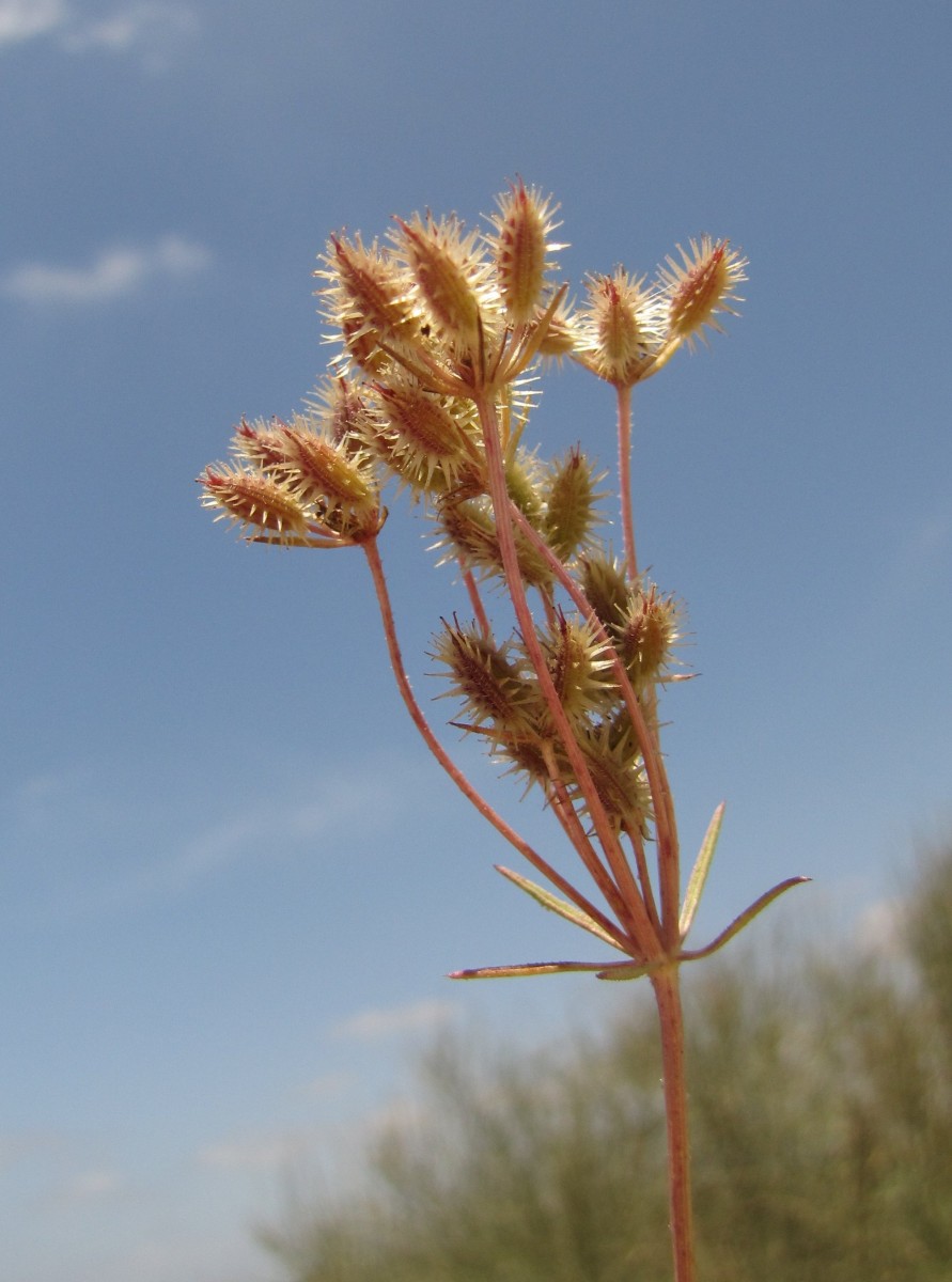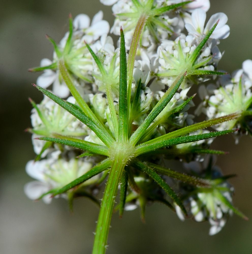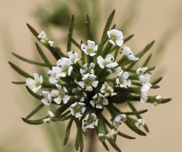 Daucus glaber (Forssk.) Thell. / Heterotypic Synonyms: Daucus littoralis Sm., it is a sub erect annual or biennial herb, up to 10-40 (-50) cm, often much branched from the base, glabrous to ± densely retrorse- hispid, rather fleshy. Leaves usually 2-pinnate, 1-6 cm long, sub glabrous or scabridulous, rather fleshy and glaucous, petiolate. becoming sub sessile above; ultimate segments obovate-cuneate, up to 5 x 3 mm, rather bluntly lobed or toothed, Umbels terminal and leaf-opposed, flattish, 5-7 (-15)-rayed, usually long-peduncled; rays very unequal, rigid. Bracts small, 3-fid, simple, oblanceolate-acute, or shortly 3-fid, 2-10 mm long, fleshy, spreading, setulose; bracteoles shorter than the umbellules. oblong-lanceolate entire, setulose-ciliate, broadly scarious-margined. Flowers perfect. some mate or sterile. Petals ± radiating, white or yellowish, tinged pink. Fruits oblong or ellipsoidal c, 7 x 2 mm; primary ridges rather prominent, densely and irregularly hispid with shorter, whitish bristles; secondary ridges conspicuously spinose with a single row of rather stout, straight, glochidiate spines,0-1.5 mm tong, usually shortly connate at the bases.