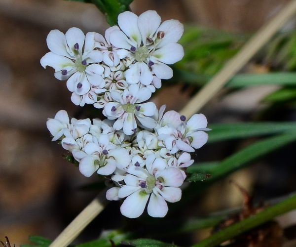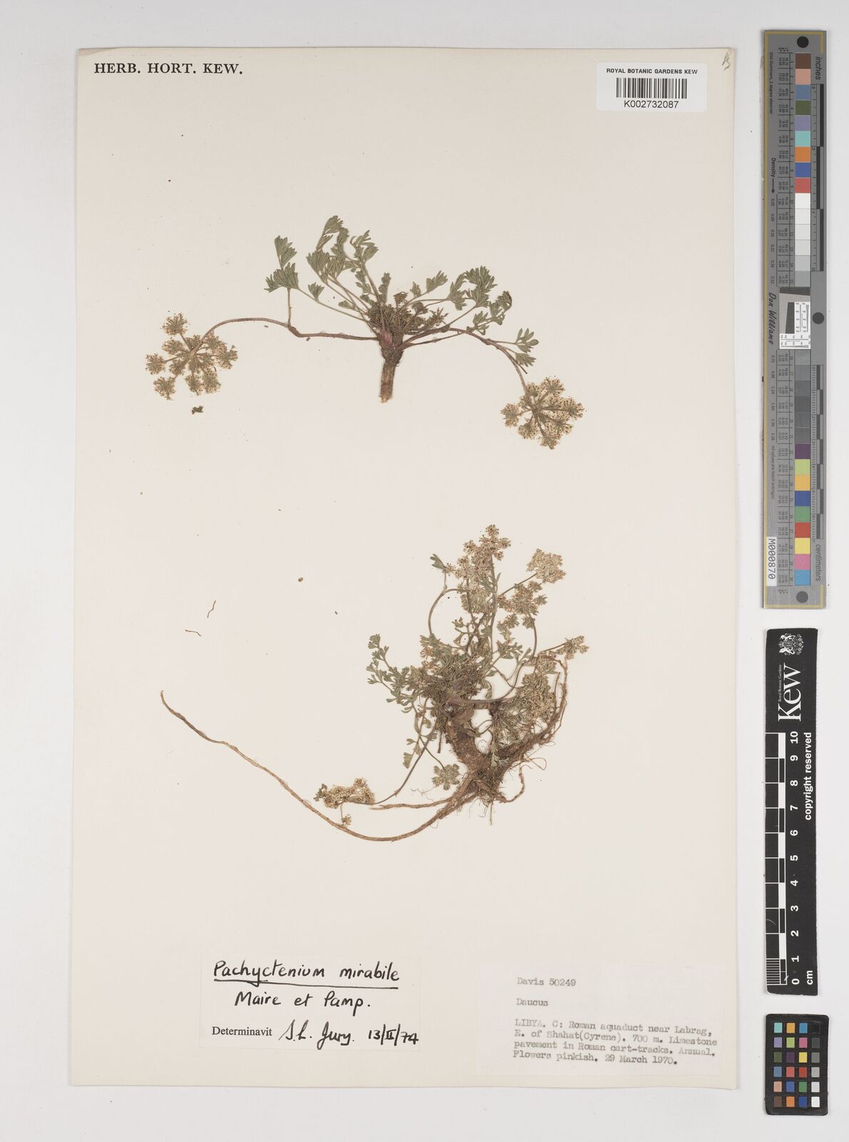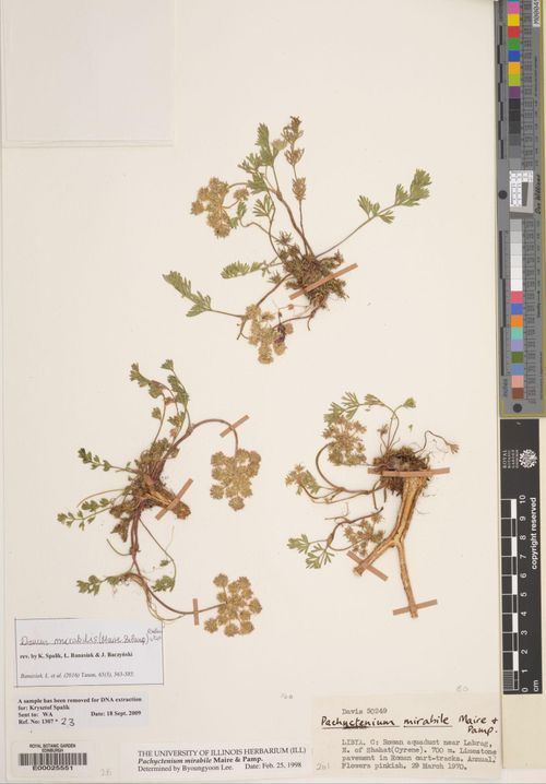 Daucus mirabilis (Maire & Pamp.) Reduron, Banasiak & Spalik / Homotypic Synonyms:  Pachyctenium mirabile Maire & Pamp., it is a perennial herb, up to 10-15 (-20) cm long) branches, prostrate, sometimes ascending, hispid-hirtetlous; rootstock up to 10 mm thick, elongated, branched above. Leaves rosulate, (3-) 6-7 (-9) cm long, oblong-lanceolate in outline, pinnatisect; segments 2-3-jugatc, pinnati-partite to linear-lanceolate, mucronate, petiole ± equal to lamina. sheathing at base. Flowering branches about twice as long as leaves; hairs short retrorse; cauline leaves (0-) 1-2. Umbels generally terminal, c. 5 cm across at flowering (up to 10 cm in fruit), rarely axillary in the upper leaves but smaller. Rays unequal, outer longer, much exceeding the involucral bracts, thickened, hirtellous and purplish in colour in fruit; involucral bracts several, unequal, usually entire, linear or linear-lanceolate, acute, hirtellous; umbellules 6-10 mm wide. Flowers 2.5 mm across, pinkish or purplish, almost actinomorphic; calyx 5-toothed with conspicuous triangular teeth, glabrous; petals obcordate, inflexed, apiculate. Styles 2.  erect, filiform elongating; stylopodium disc flate, rounded. Fruit 2.5 (-3) x 1.6 mm (excluding styles), ovate below with dentate wing and oblong, naked above like a beak, terminating into 5 dentate calyx teeth and 2, filiform elongated styles, more than half the length of fruit; mericarp with secondary ridges dentate-winged in primary ridges short, hairy.