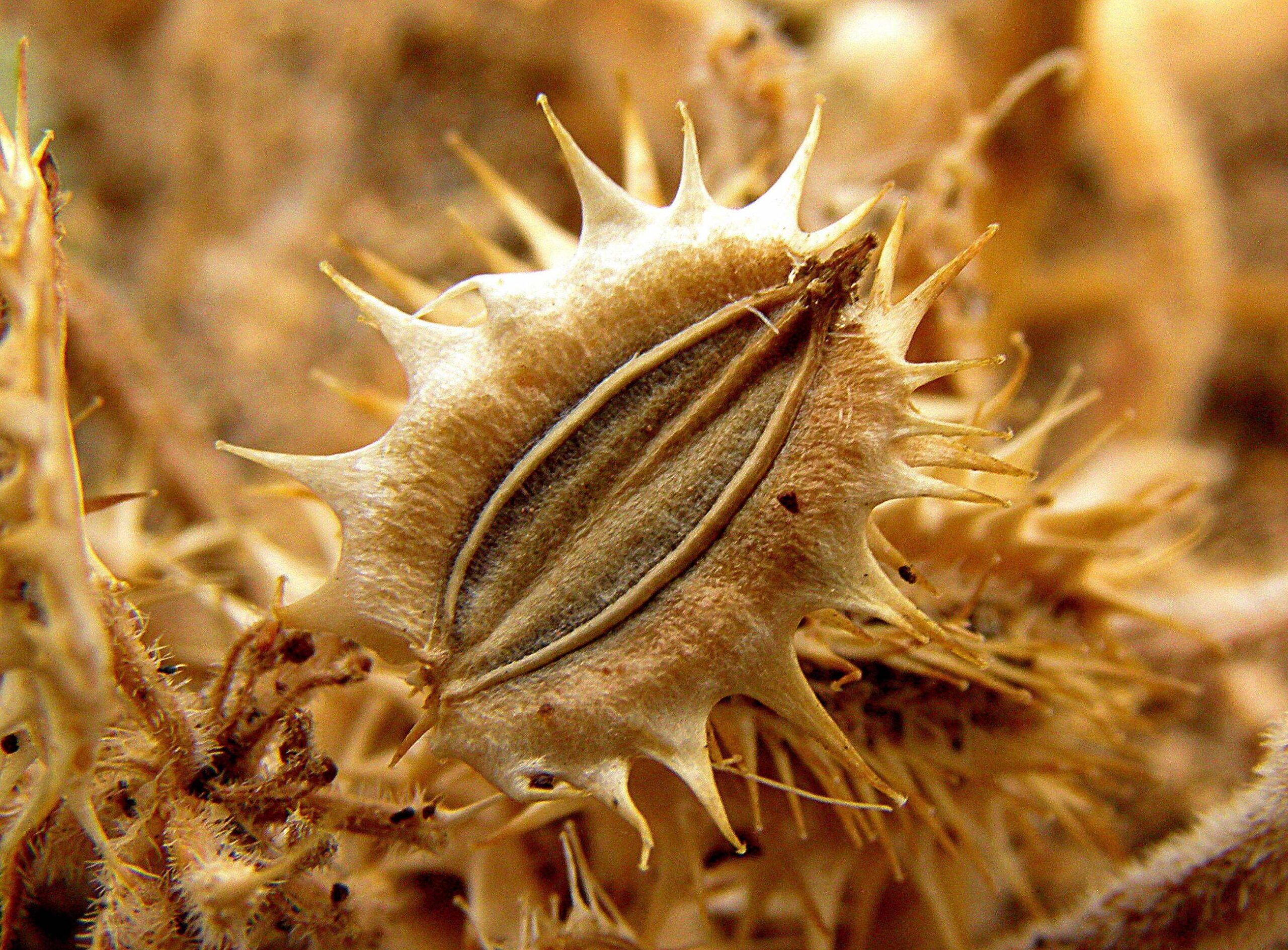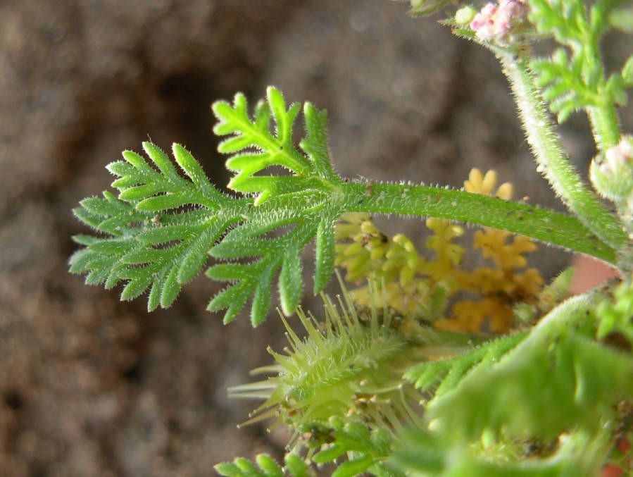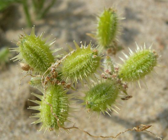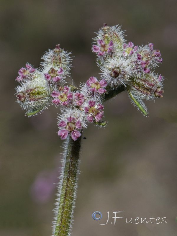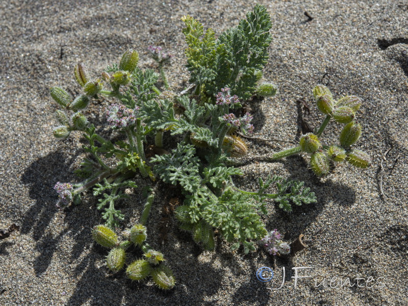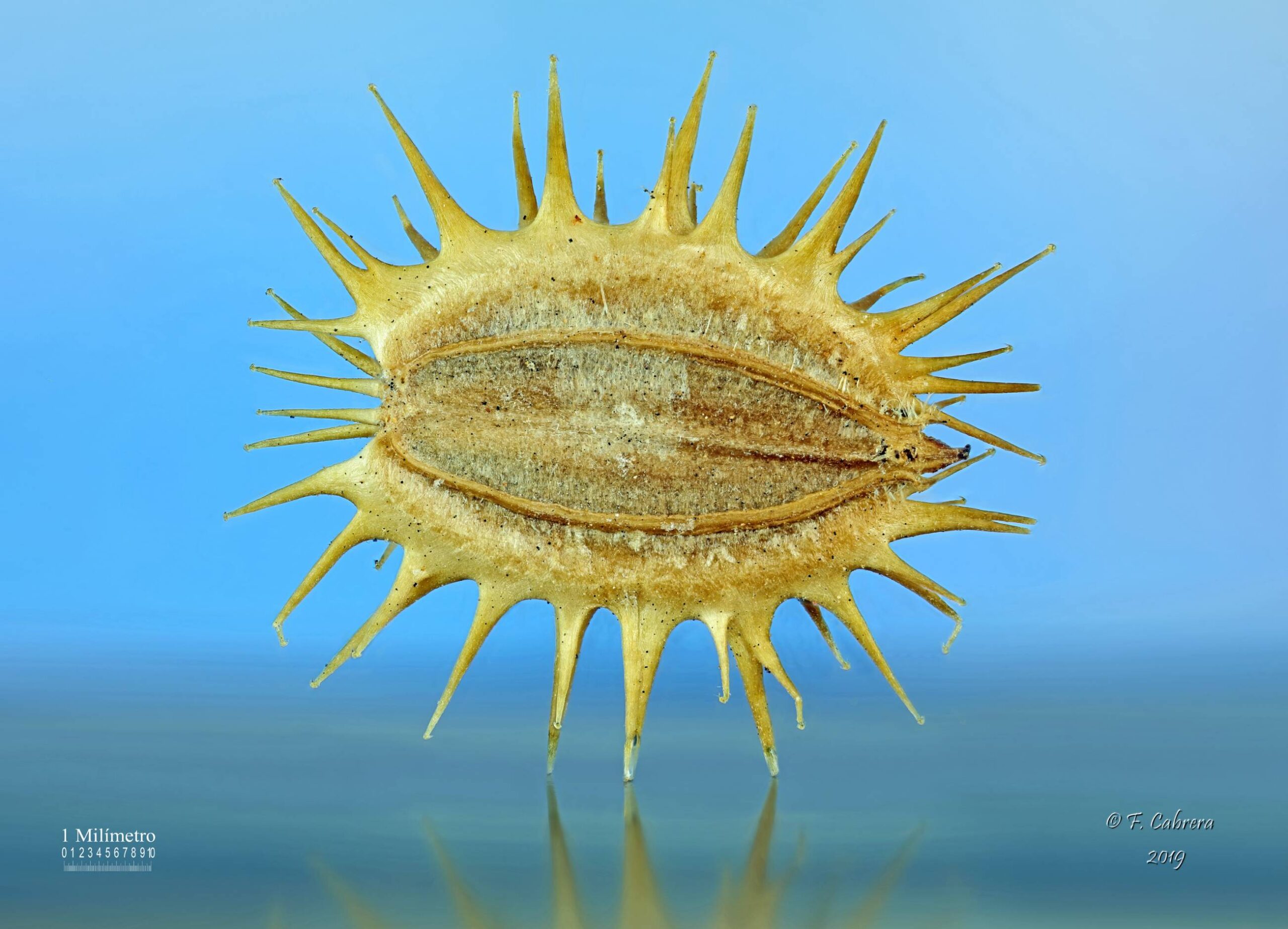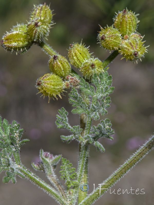 Daucus pumilus (L.) Hoffmanns. & Link / Homotypic Synonyms: Pseudorlaya pumila (L.) Grande, it is an annual herb, densely hairy, branched from the base, procumbent stems. Leaves mostly basal, petiolate, pinnatisect, up to 12 cm long. Umbels provided with linear bracts and very short rays at anthesis, then elongated and unequal during fruiting. Small flowers, with white, pink or somewhat purple petals, acuminate and curved. Ellipsoidal fruit. Mericarps up to 10.6 x 11.5 mm, straw-colored and elliptical in outline; primary ribs filiform, ciliate; secondary ribs prolonged in 1-3 rows, more or less defined, of straight spines with glochidiated apex, those of the lateral ribs very widened towards the base. Flat seeds located on the ventral side.