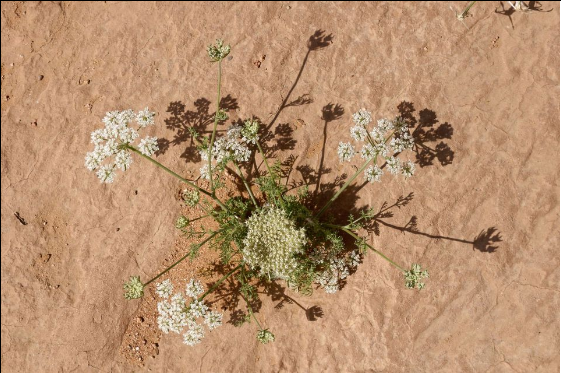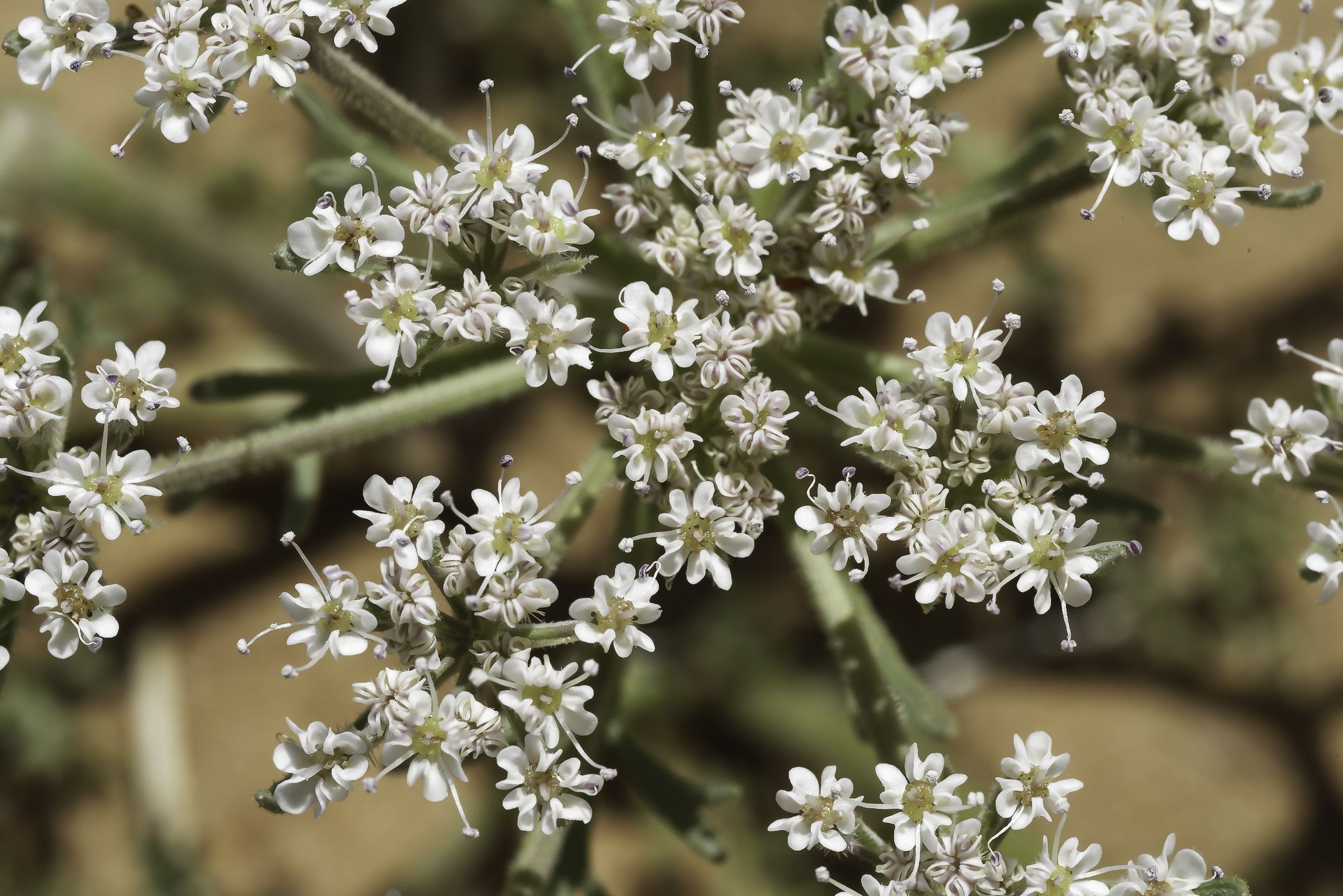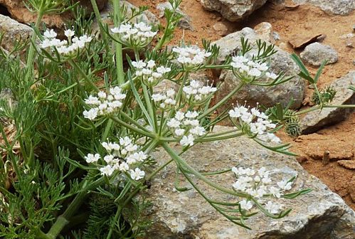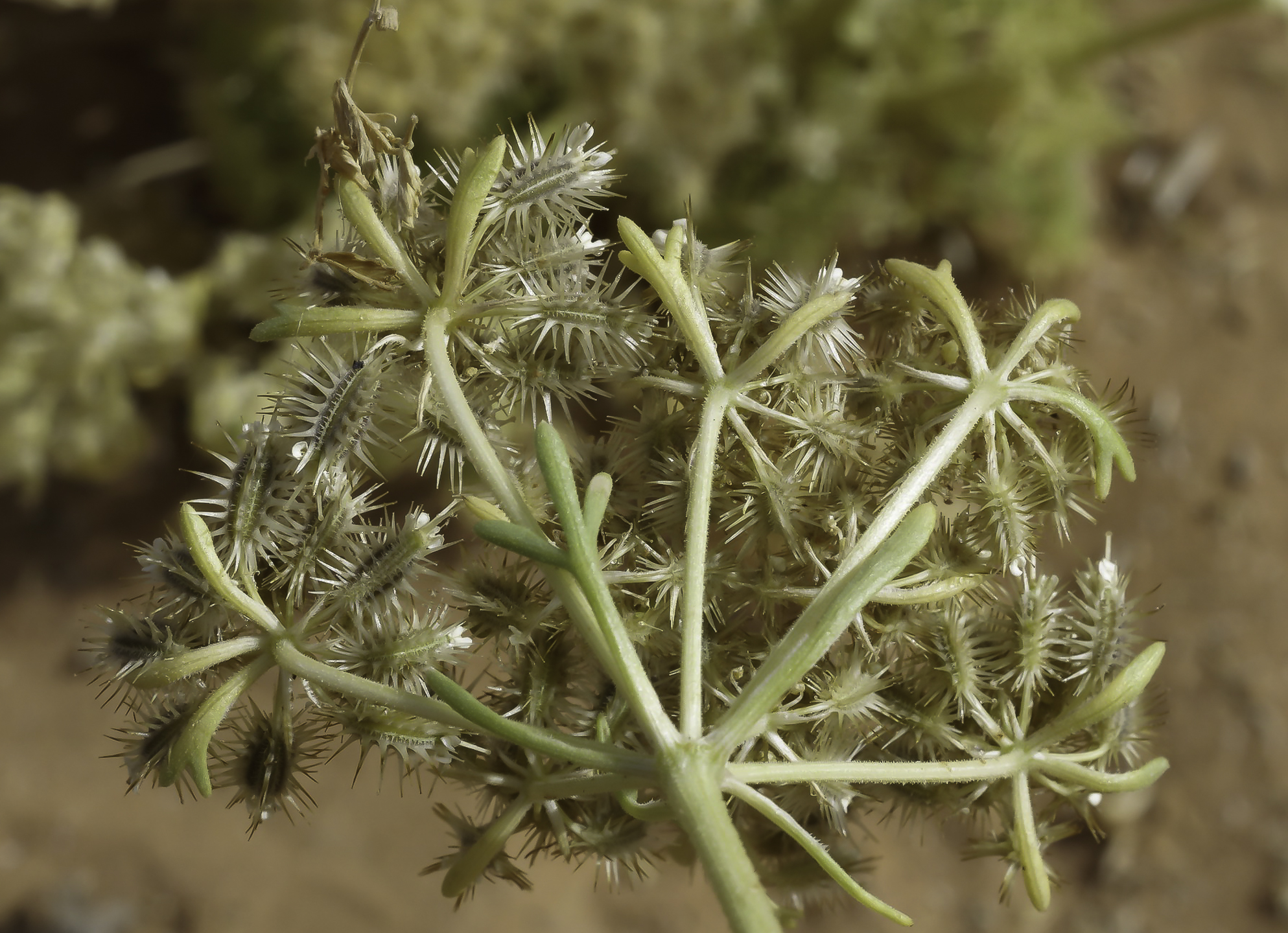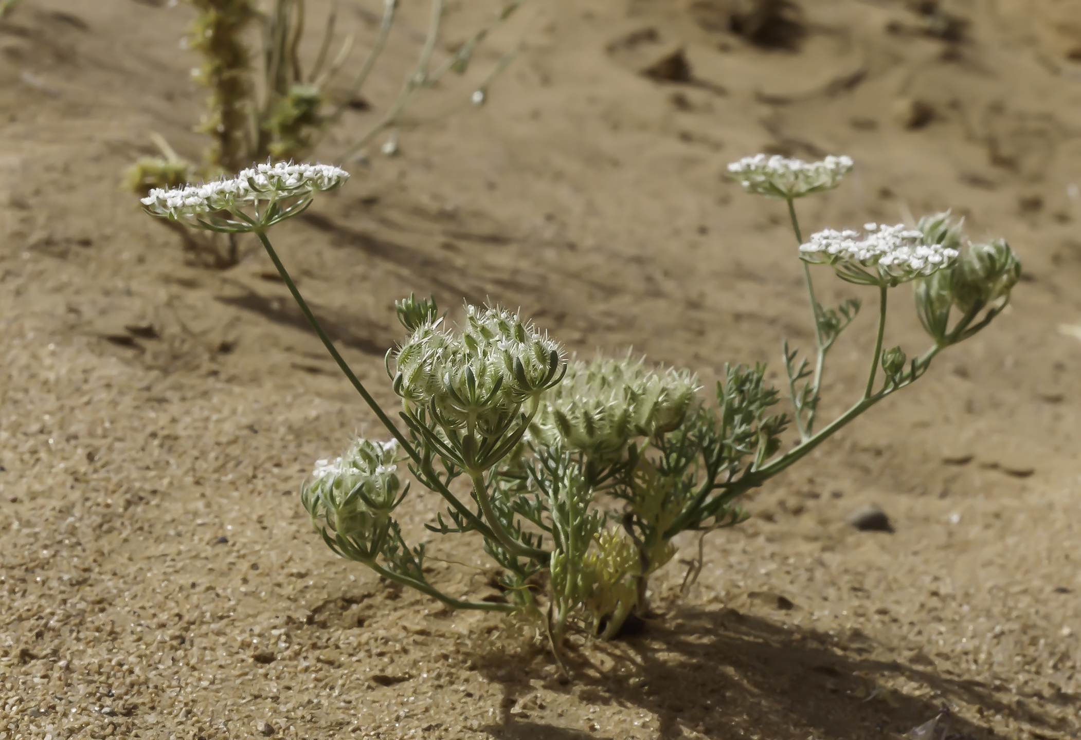 Daucus sahariensis Murb., it is a short annual green herb, up to 15 (-20) cm, branched from the base ascending to erect; stem sulcate, minutely but densely retrorse-hispid. Leaves 2 (-3)-pinnatisect, with linear-oblong, narrow ultimate segments, up to c. to (-15) x 1 mm, obtuse, sometimes very shortly bristle-tipped. Umbels compound, central one usually largest, long-peduncled, arising from the base or a little above the base of the plant, unequally many-rayed. Bracts pinnatisect to almost entire, about as long as the rays in flower; spreading or sub deflexed in fruit. Bractcoles similar to bracts but smaller, often exceeding the umbellulcs. Umbellulcs many-flowered; pedicels unequal, outer exceeding the flowers and fruits. Petals white, hardly radiate, almost equal, notched at apices. Fruits (almost mature) up to c. 6 x 4 mm; spines on secondary ridges longer than the mericarps width, yellowish when dried, broader at base but not confluent; fruit shortly pubescent between the spiny ridges; styles much longer than the stylopodium, erect, spreading like a fork.
