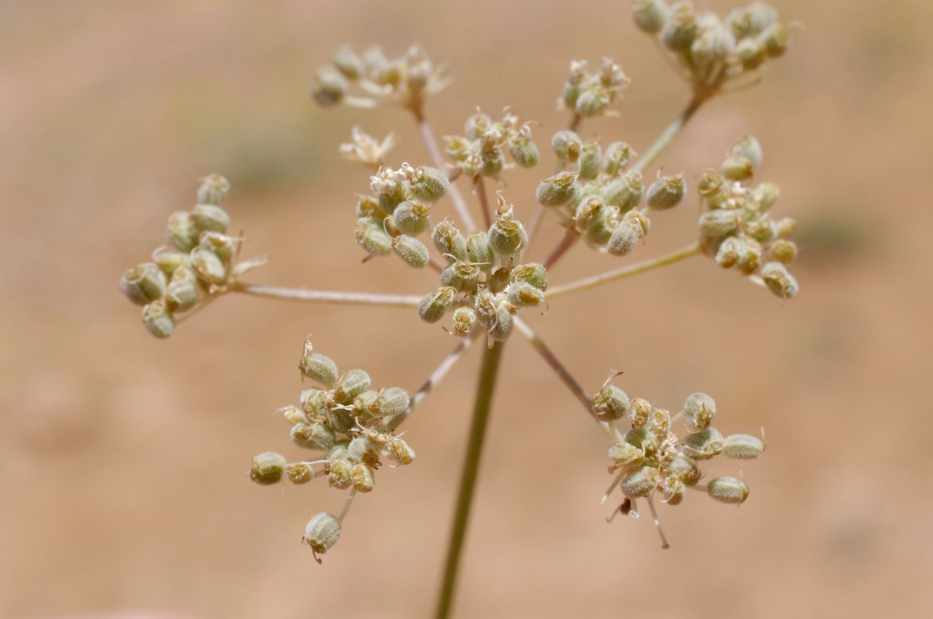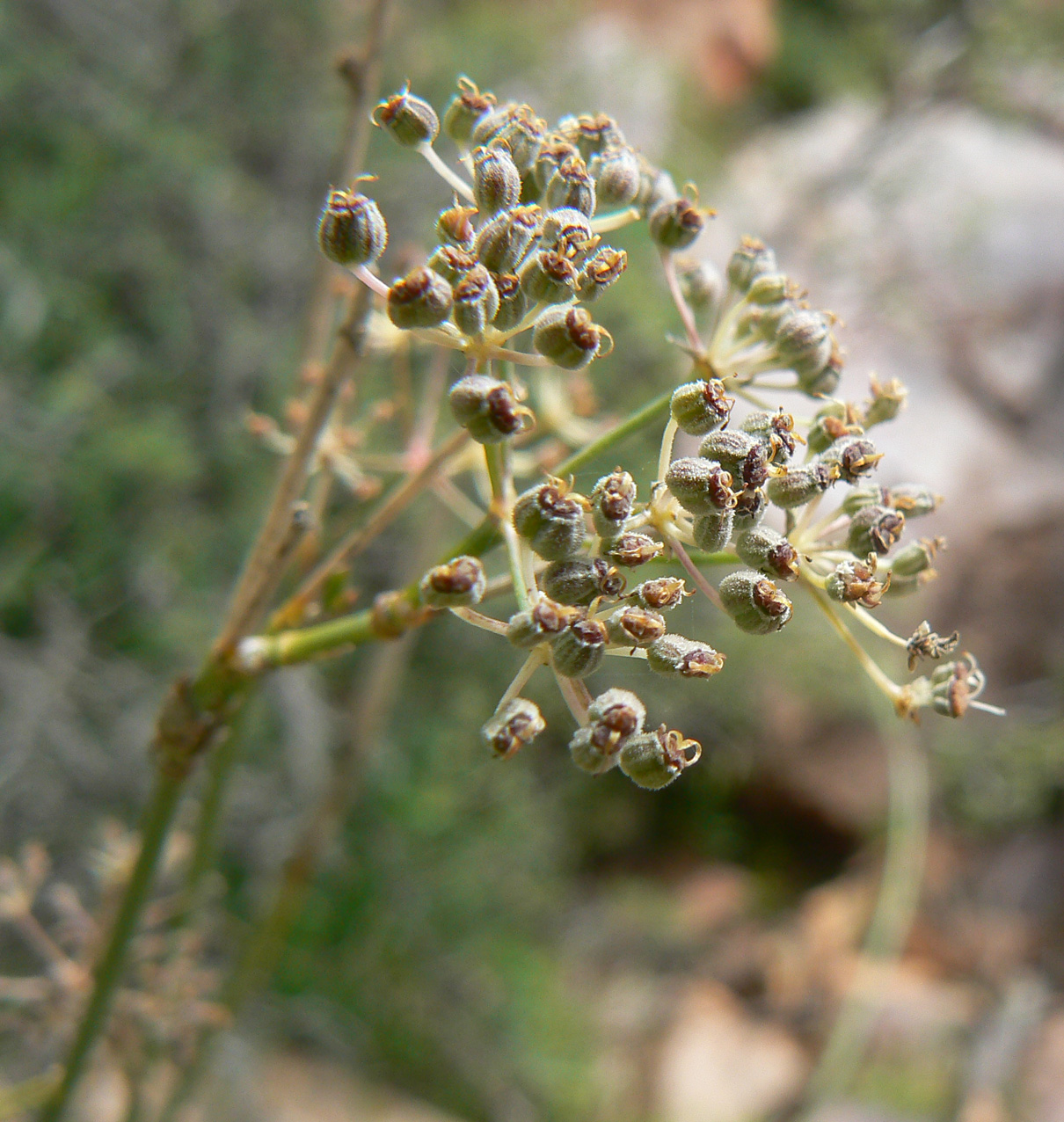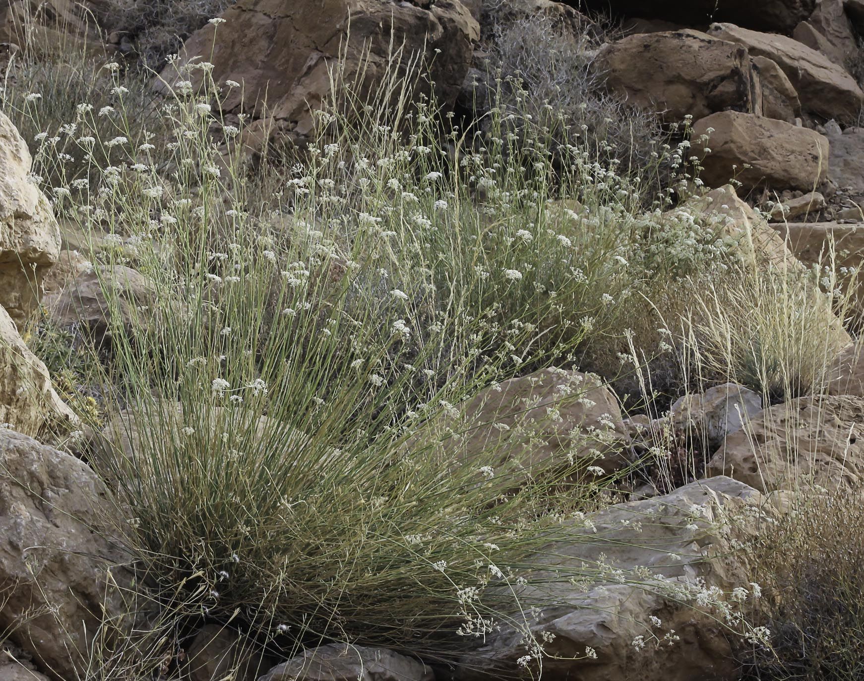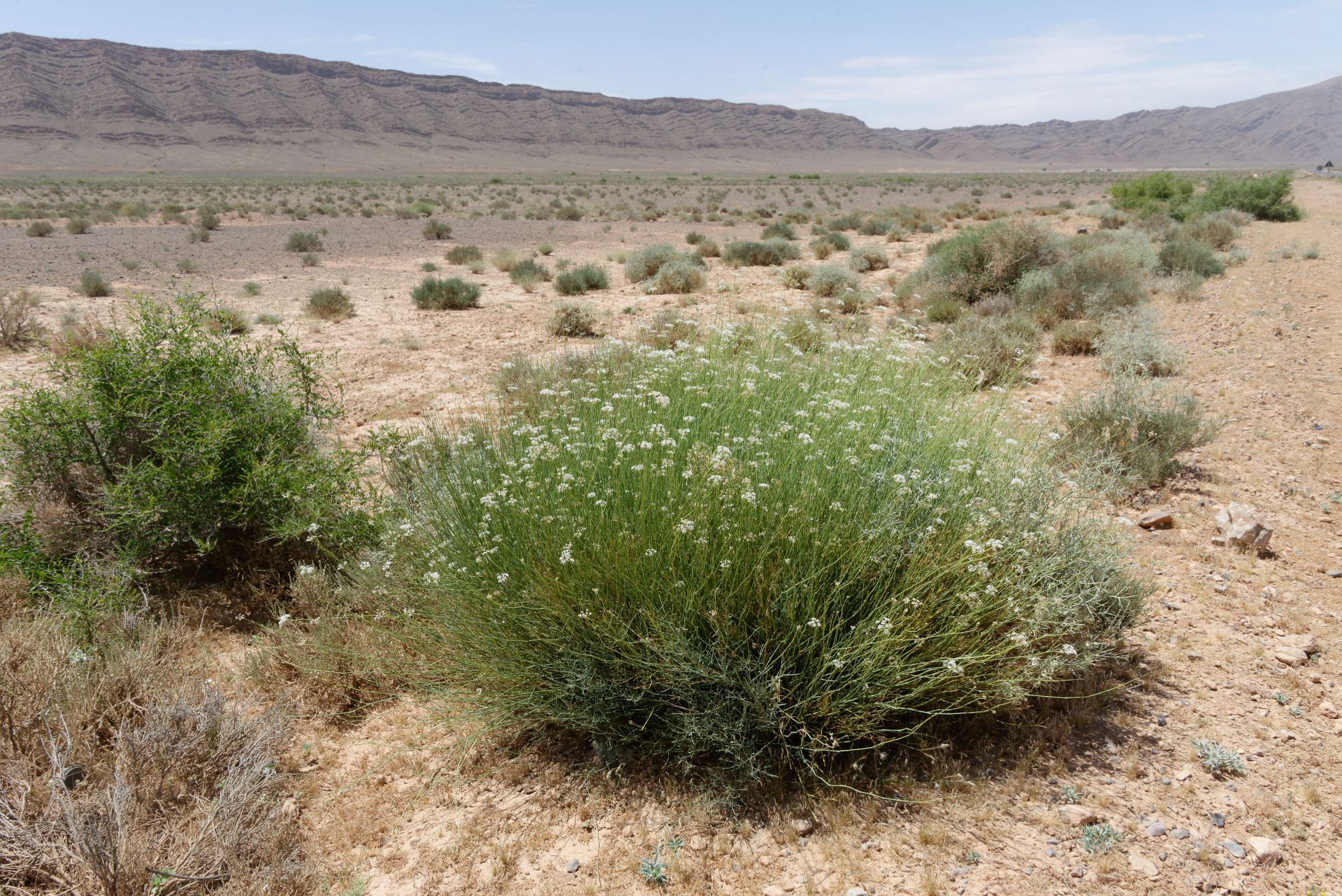 Deverra scoparia Coss. & Durieu / Homotypic Synonyms: Pituranthos scoparius (Coss. & Durieu) Schinz // Infraspecific: Deverra scoparia ssp. tripolitana (Andr.) Pfisterer & Podlech/ Heterotypic Synonyms: Pituranthos rohlfsianus (Asch.) Schinz, it is a caespitose, erect, broom-like tall perennial herb, much branched at base with erect branched, leafless nodose. Greenish stem, up to 60(-80) cm tall; Basal and lower leaves 2-3-pinnatisect, cauline leaves reduced to small, ovate, virgate sheaths, membranous at margin. Umbels usually lateral and terminal, on peduncles 1-3 cm long. Bracts and bracteoles deciduous to sub persistent, usually 4-6, lanceolate, glabrous. the latter ± exceeding the young buds. Petals ovate-oblong, at flowering, becoming inflexed later; middle nerve narrow, glabrous. Stylopodium conical-depressed, margin hardly undulate-crenulate; style longer than stylopodium, deflexed, usually much exceeding the fruit apices. Fruits ovoid-or suborbicular, somewhat laterally compressed, usually villous with small whitish hairs.