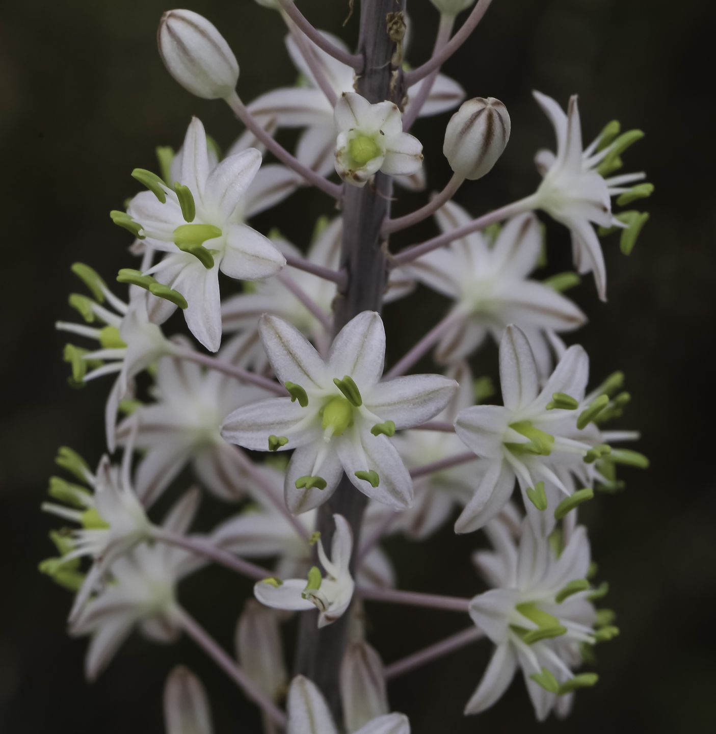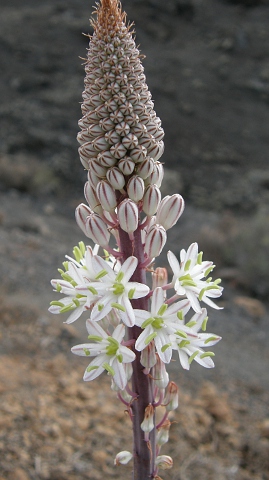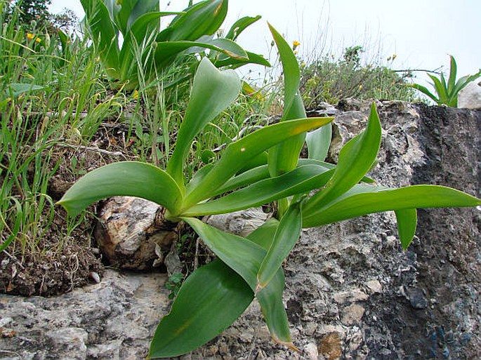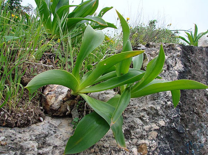 Drimia maritima (L.) Stearn / Homotypic Synonyms: Urginea maritima (L.) Baker, it is a bulbous geophyte, bulbs ovoid, well-developed, 7-20 cm in diameter; tunics membranous, coriaceous, reddish to whitish in colour. and more, glabrous. Leaves appearing before the flowers, broadly and long lanceolate, entire, erect, shorter than the very robust stem. Whitish flowers, very numerous, in a long, tight and spiraled raceme; pedicels 1 times longer than the flower, 2-3 times longer than the lanceolate-linear bract. Perianth with elliptic-lanceolate divisions, with a green vein. Greenish anthers, a little shorter than the perianth. Capsule large, obovate-trigonous, bumpy.