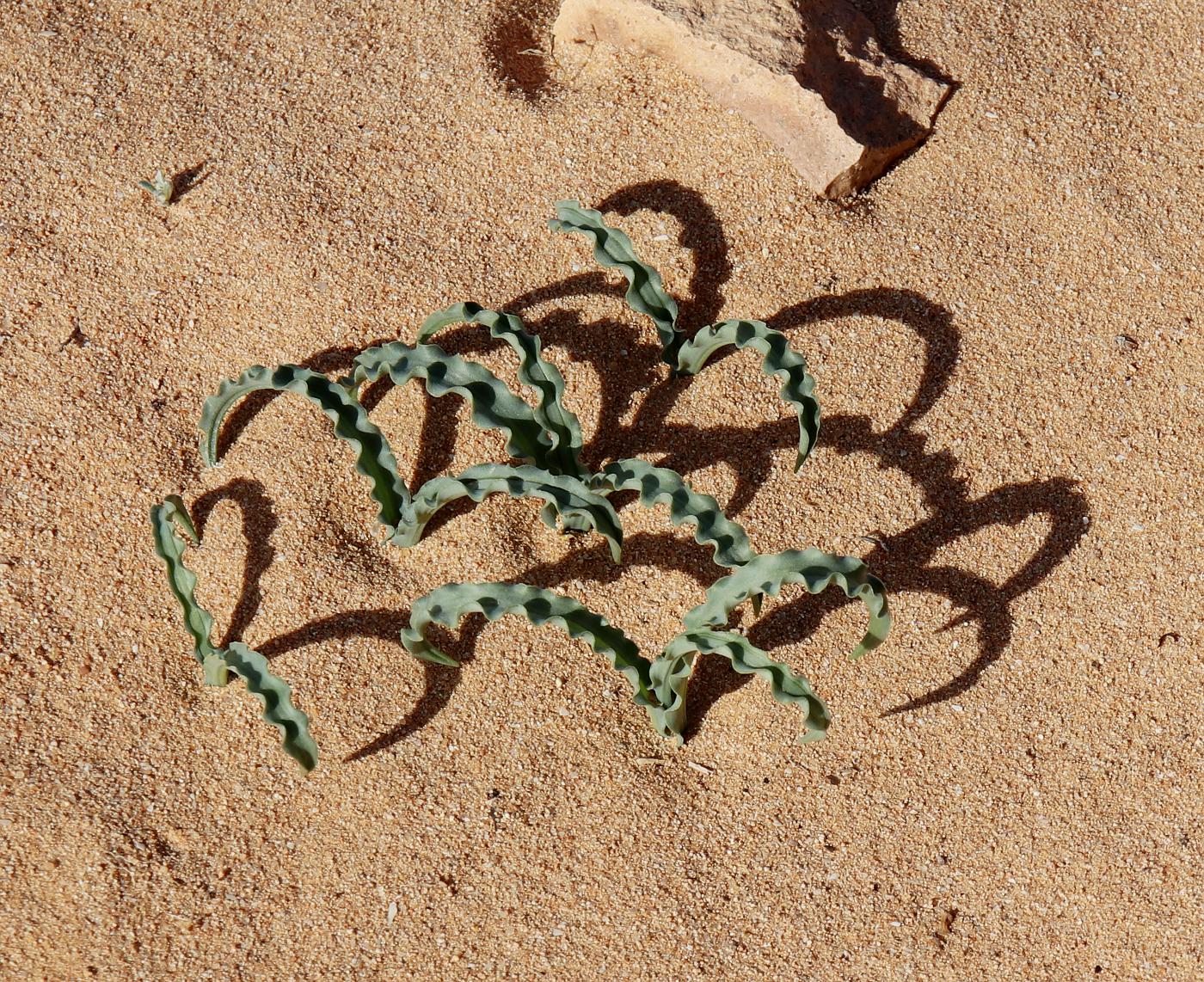 Drimia purpurascens J.Jacq. / Heterotypic Synonyms: Drimia undata Stearn, Urginea undulata (Desf.) Steinh., it is a bulbous geophyte, bulb solitary, ovoid, 2-4 x 1.5-3 cm; tunics membranious, whitish to greyish. Leaves basal forming rosette, usually spreading on the ground, linear, with undulate margins, 10-25 x 0.5-1.5 cm. Scape 20-60 cm long, many-flowered; pedicels c. 1 cm long; bracts linear to linear-lanceolate, membranous, whitish in colour, 2-5 mm long. Perianth stellate; tepals linear to spatulate, c. 5 x 3 mm, ± obtuse, pinkish to green-rosaceous. Stamens equalling to slightly shorter than tepaIs; filaments filiform, white-rosaceous in colour. Anthers yellowish to rosaceous, 1-3 mm long. Ovary triangular-ovoid, yellow-greenish; style equalling to longer than stamens. Capsule ovoid-triquetrous, 0.5-1 cm long. Seeds flattened, obovoid–oblong, black, 3-4 in each locule.