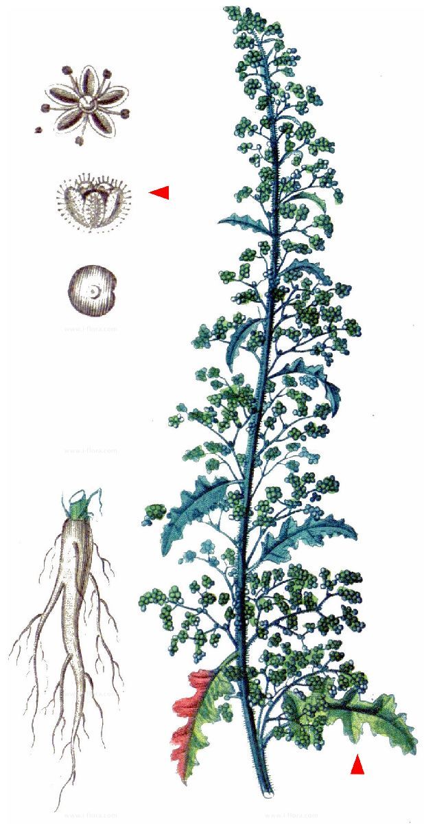 Dysphania ambrosioides (L.) Mosyakin & Clemants / Homotypic Synonyms: Chenopodium ambrosioides L., is an annual or short-lived perennial herb up to 25–130 cm. Stem: glabrous or gland-dotted. Leaf: blade 15–100 mm, ovate to lance-oblong, entire to coarsely dentate, serrate, or jagged-cut, generally densely glandular. Inflorescence: clusters, ± spheric, in terminal and axillary spikes; bracts 3–25 mm. Flower: calyx deeply 5-lobed, lobes smooth, enclosing fruit, sparsely glandular. Fruit: ± 0.5 mm diam; wall free from seed, glandular. Seed: vertical and horizontal, ovoid, +- red-brown, smooth.