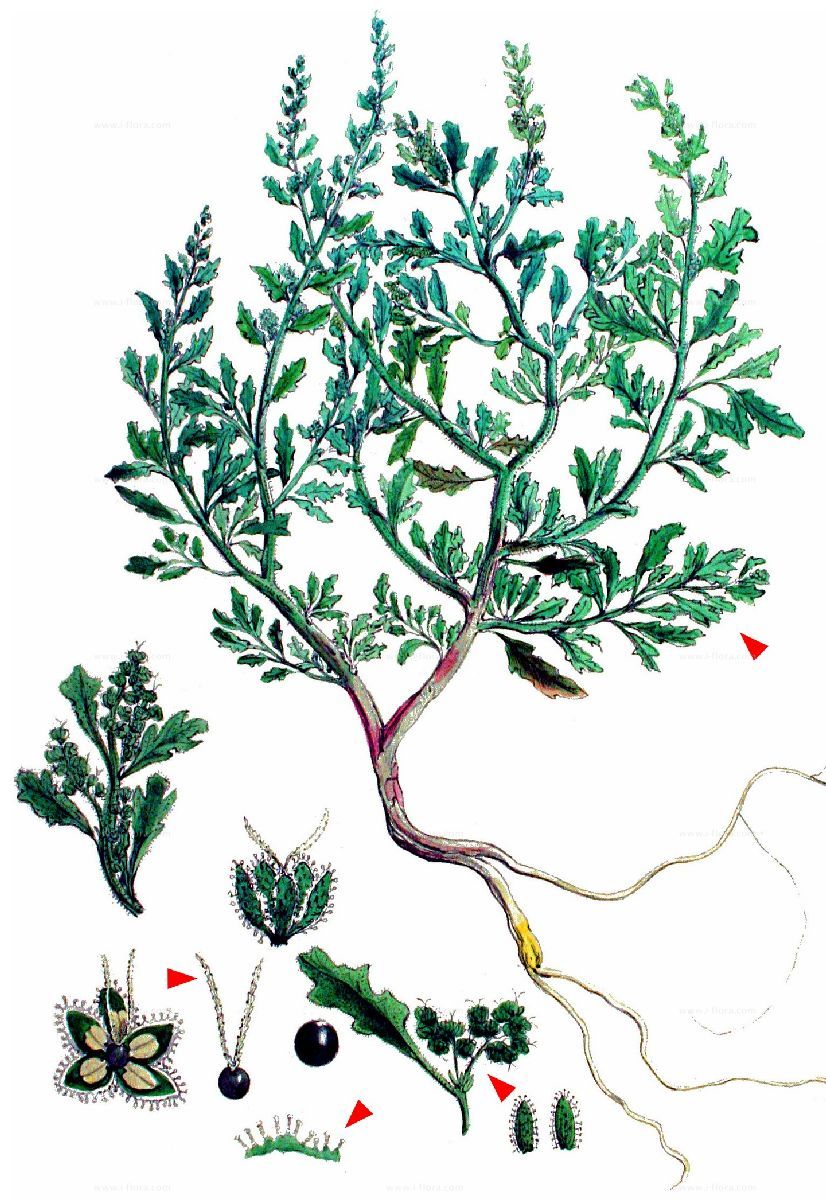 Dysphania botrys (L.) Mosyakin & Clemants / Homotypic Synonyms: Chenopodium botrys L., it is an annual herb up to 14-65 cm. Stem: glandular. Leaf: blade 3-65 mm, ovate to elliptic, wavy to pinnately lobed, lobes acute to obtuse, densely short-stalked-glandular abaxially. Inflorescence: arching; clusters in axillary or terminal panicles. Flower: short-pedicelled; calyx lobes distinct, weakly enclosing fruit, ± flat, densely short-stalked-glandular. Fruit: ± 0.5 mm diam, margin generally acute; wall adherent to seed, white-blotchy, minutely papillate. Seed: horizontal, bumpy.