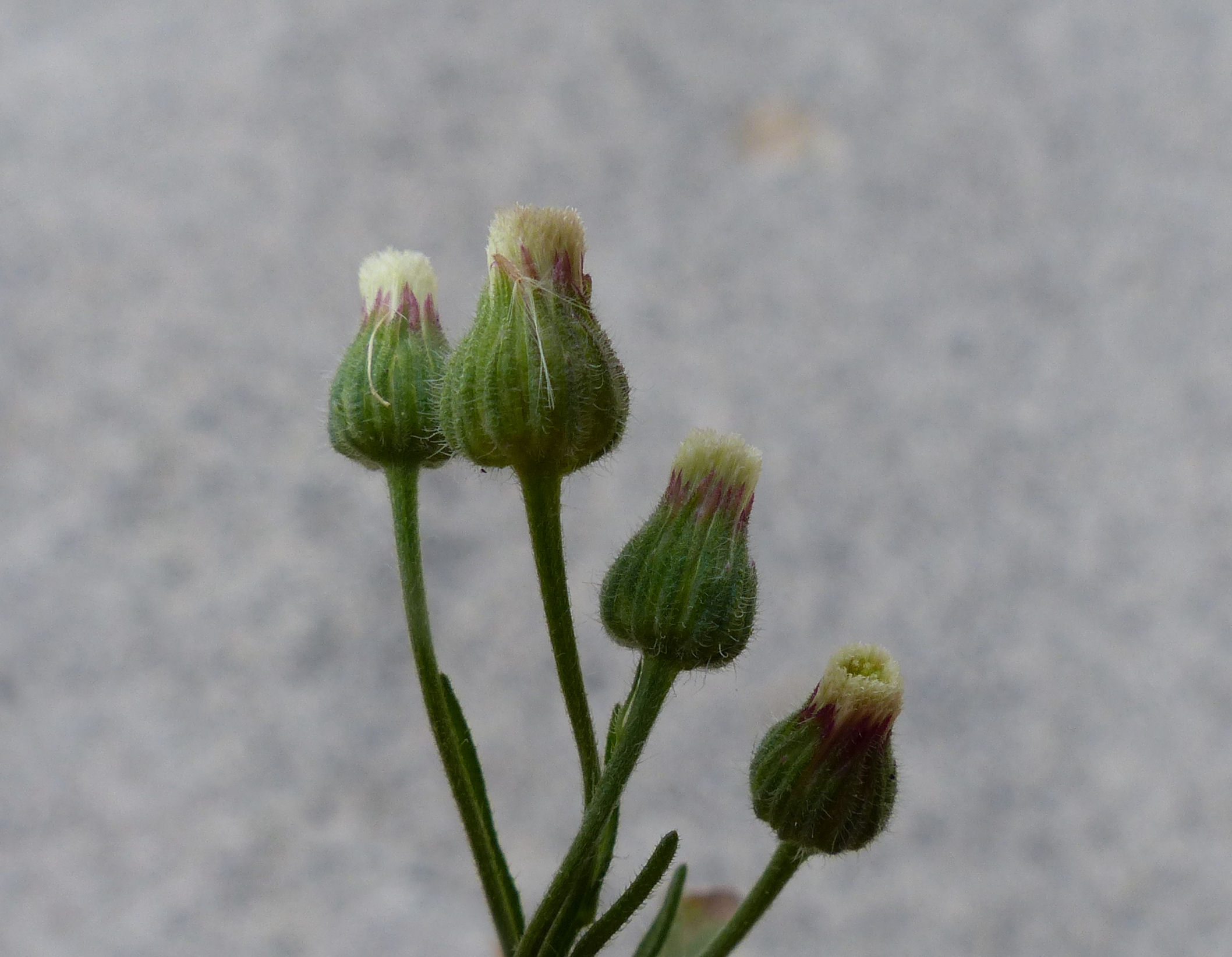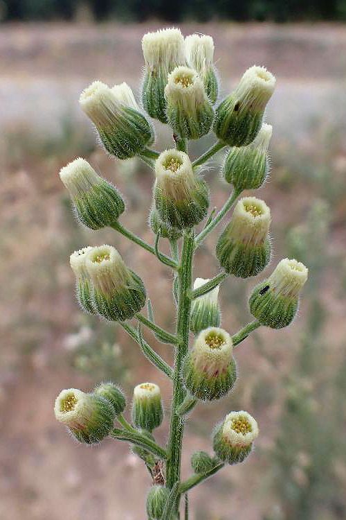 Erigeron bonariensis L. / Homotypic Synonyms: Conyza bonariensis (L.) Cronquist, it is an annual herb, up to10-100(150) cm, ± gray-hairy. Stem erect or ascending, leafy, branched distally or throughout, densely strigose, bristly; central stem often overtopped by distal branches in age. Leaf ± densely strigose and/or bristly. Basal and proximal cauline petioled, 3-8 (-12) cm, 10-25 + mm wide, oblanceolate, entire to coarsely toothed or pinnately lobed; distal sessile, 1-5 cm, 2-10 mm wide, linear to narrowly oblanceolate, entire or shallowly toothed. Inflorescence heads disciform, 5-many, ± long-peduncled, generally in raceme-like (panicle-like or ± flat-topped) clusters. Involucre generally 3.5-5 mm, widely cylindric or urn-shaped in flower; phyllaries ± equal, densely strigose and/or minutely bristly, green to ± red or purple; central colored part of middle phyllaries generally wider than light-colored margin, not red-brown when dry, not resin-filled. Receptacle (2.5)3-5 mm diam in fruit. Pistillate Flower, 60-150. Corolla ± equal to style, green-white to purple, ray 0-0.3 mm. Disk Flower, 8-25. Fruit 1-1.5 mm, pale tan, sparsely minutely strigose; pappus bristles 15-25+, 3-4 mm, cream to ± brown.