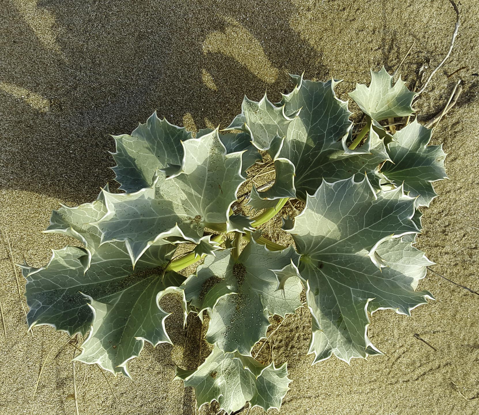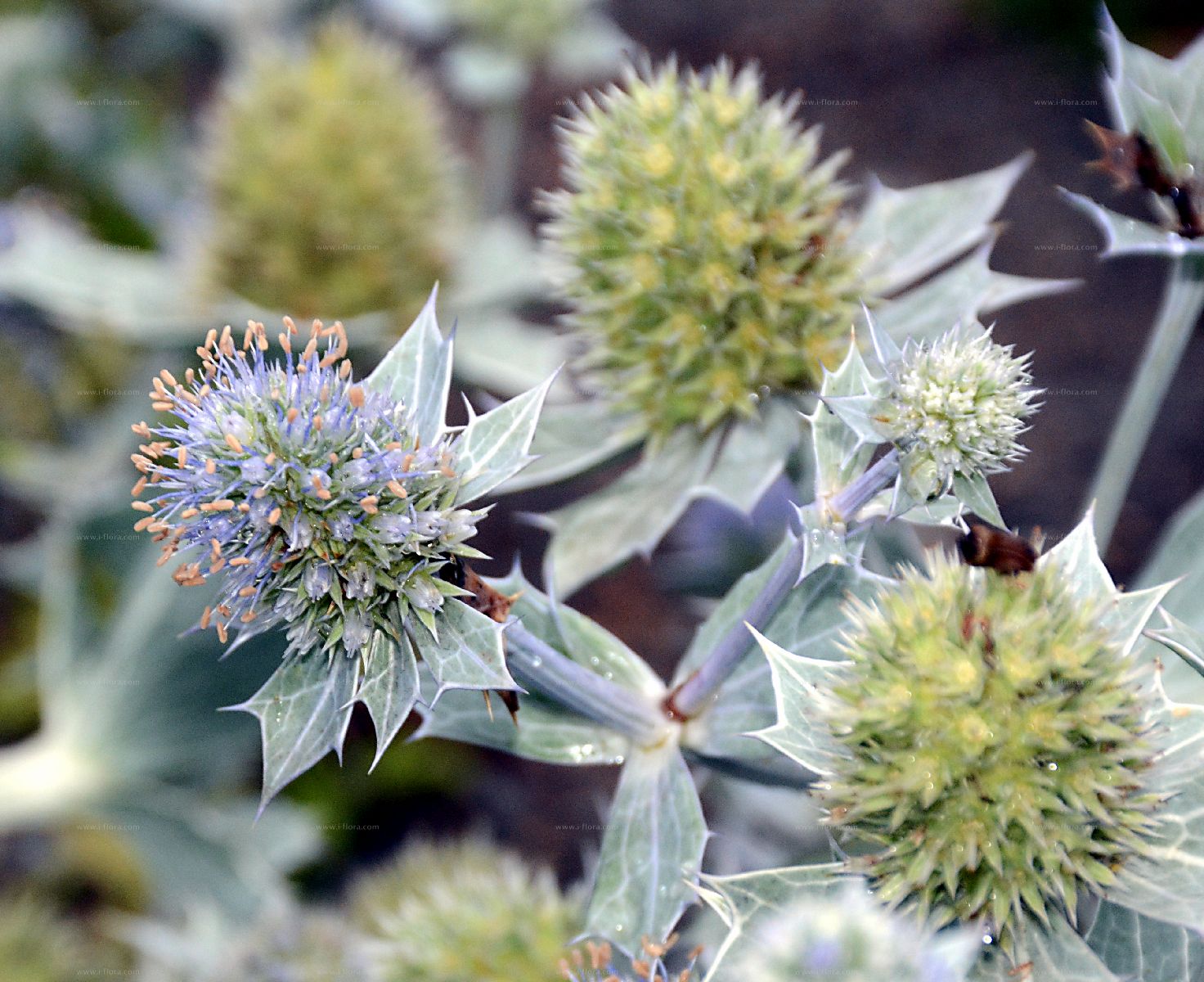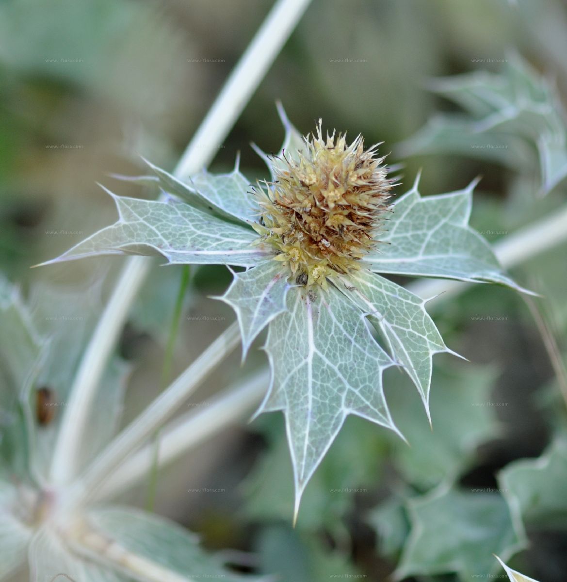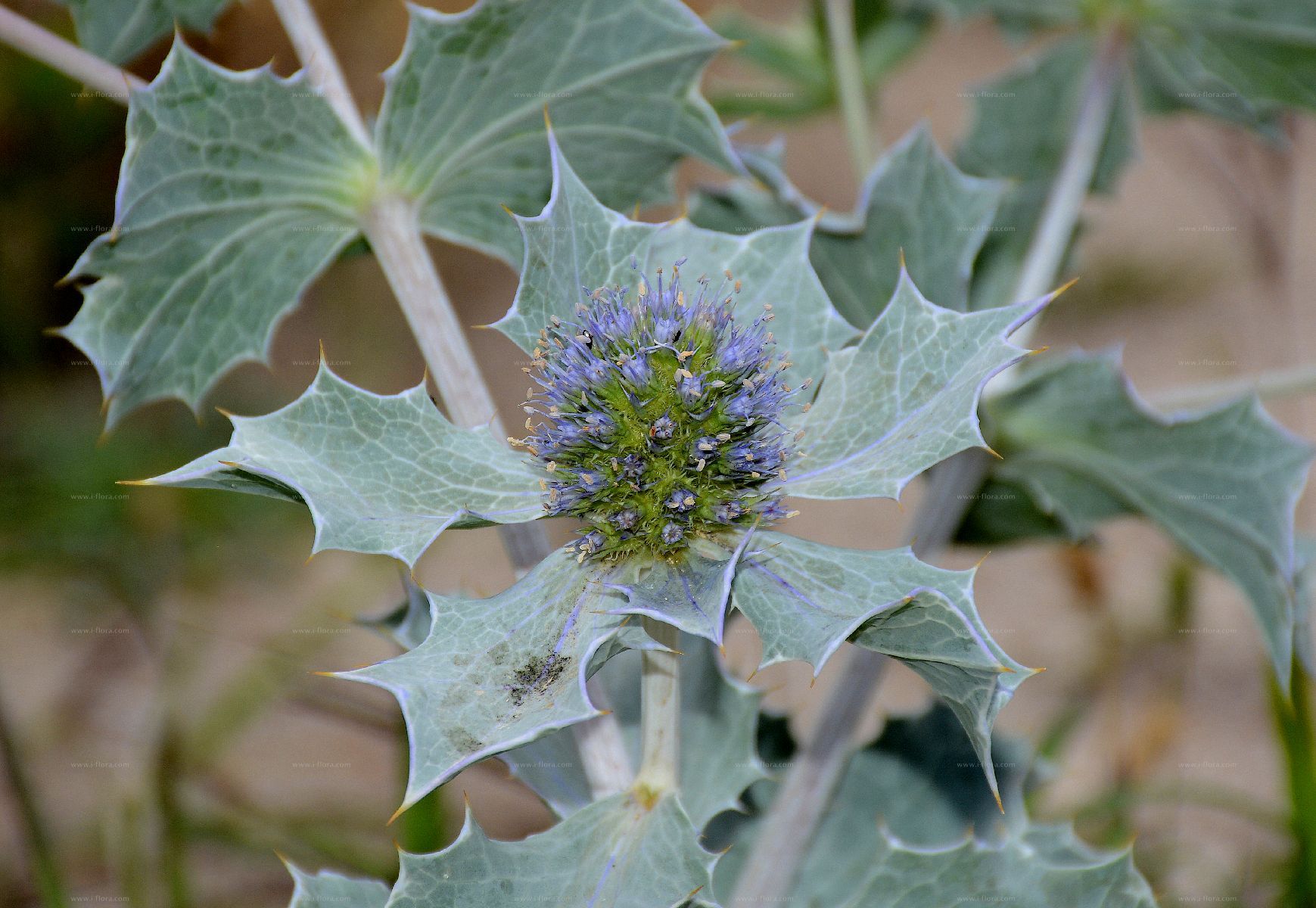 Eryngium maritimum L., it is a perennial herb with thick rhizome, glabrous, glaucous, mostly forming globular tufts, up to 60 cm, branched above. Leaves leathery, thick, pale-yellowish or whitish, prickly-lobed, conspicuously veined; basal leaves 5-10 x 5-15 cm, long-petioled, suborbicular to truncate or cordate-reniform at base, undivided or palmately lobed, coarsely dentate or lobulate at margin; upper leaves 3-8 cm long and broad, clasping; palmately lobed, lobes triangular and terminating in long sharp spines. Heads many flowered, usually 2-3 x (0.8-) 1-1.5 (-2) cm; bracts 3-5 (-7), broadly rhombic to ovate, 2-5 x I-3 cm, usually with 3-5 spiny lobes; bracteolcsc, 1 cm, longer than the flowers, narrowly lanceolate, 3-cuspidate. Sepals 4-5 mm, elliptic to lanceolate, aristate, broadly scarious-margincd. Fruit c. 8 x 5 mm. brownish, spongy, densely scaly prickly, crowned with the spreading calyx-teeth.