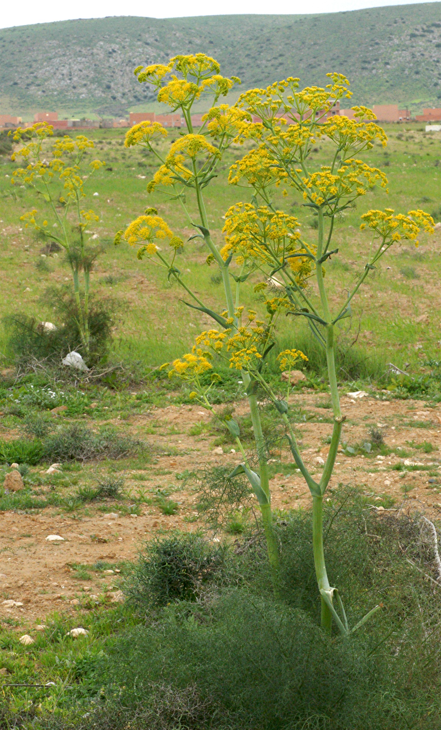 Ferula communis L., it is a perennial plant of 1-2 meters, robust, glabrous, with a large stem; stem very thick, hollow, finely striated, with opposite or whorled upper branches; soft leaves, green on both sides, broken down into very narrow, filiform, elongated strips; the lower ones with a cylindrical petiole, the upper ones with a large membranous sheath; central umbel large, with 20-40 rays, the lateral ones long-pedunculated, extending beyond the central one; involucre and involucelle zero; reflexed styles, longer than the stylopodium; fruit oval or elliptical, rounded at both ends, tawny when ripe.