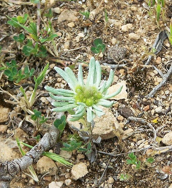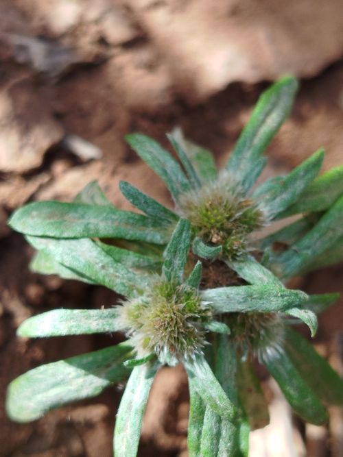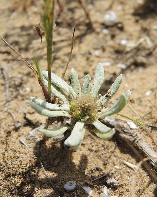 Filago argentea (Pomel) Chrtek & Holub / Homotypic Synonyms: Evax argentea Pomel, it is an annual herb, stems distinct, much branched, Leaves oblong-linear to spathulate. Cluster of capitula globose, tenninal or axillary. Capitula many, oblong. Involucre silvery white. Involucral bracts, obscurely carinate, glabrous to glabrescent, cuspidate.