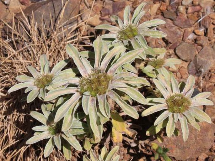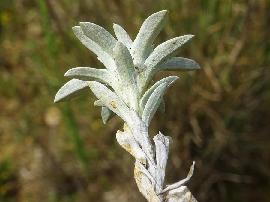 Filago asterisciflora (Lam.) Sweet / Homotypic Synonyms: Evax asterisciflora (Lam.) Pers., it is an annual herb, stems up to 3-13 cm, rigid, simple or branched. Cauline leaves 12-25 x 4-5 mm, linear-oblong to oblanceolate-spathulate, sub opposite. Rosette-leaves 15-40 x 3-7 mm, oblong-lanceolate, acuminate, sub coriaceous. adpressed-hairy, c. 4 times as long as the cluster of capitula. Capitula numerous, in clusters 12-18 mm wide. Involueral bracts cuspidate or somewhat acuminate, with recurved arista c. 1 mm. Cypsela c, 1x 0.3 mm, narrowly obovoid, sparsely hairy, brown, emarginate at apex.