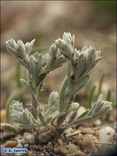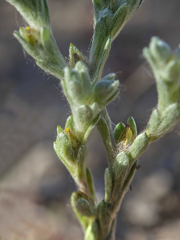 Filago mareotica Delile , it is an annual herb, very similar to Filago ramosissima Lange, but capitula always solitary. axillary forming a ± unilateral spike.