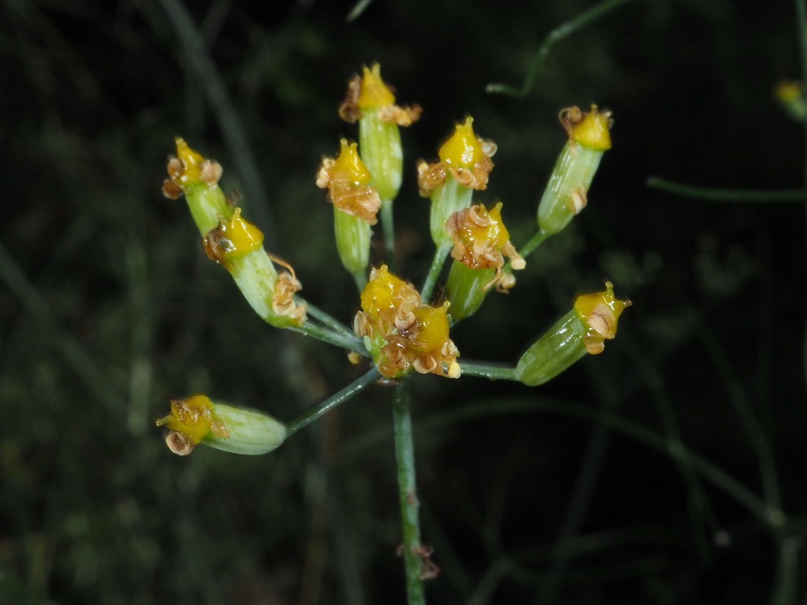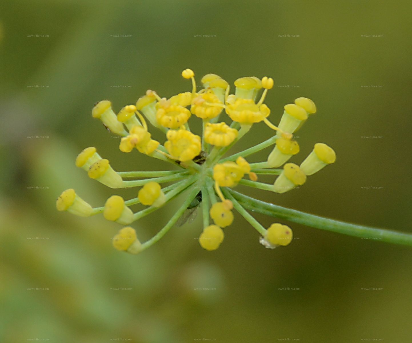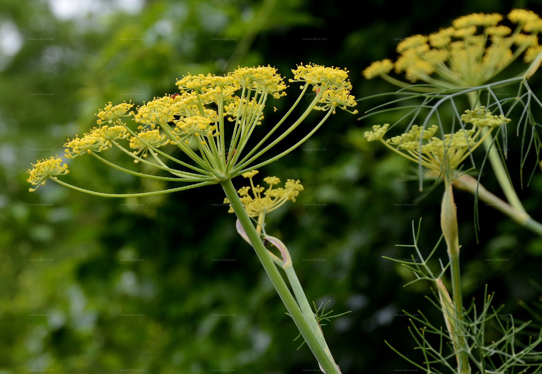 Foeniculum vulgare Mill., it is an erect perennial or biennial herb, up to 2-2.5 m tall, glabrous, dark green with fusiform root, stems ± glaucous. finely sulcate, solid, terete. Lower leaves up to 5-20 cm long, petioles with conspicuous, 1-5 cm long, ribbed basal sheaths, lamina triangular or triangular, ovate, nearly as long as wide, 3-4-pinnatisect in to numerous, filiform, 5-40 x 0.3-0.7 mm, acute-mucronate ultimate segments: upper leaves akin to basal, sessile, few and much reduced, sometimes represented by basal sheath with a short, aristate appendage. Umbels (3-) 5-25 (-30)-rayed, numerous, long peduncled: rays patent. 1-7 cm long. unequal. glabrous. Umbellules (10-) 15-25-flowered, Pedicels (1-) 2-10 mm long. Petals oblong-ovate. c. 1×1 0.8 mm, yellow. Anthers yellow. suborbicular. Fruit oblong-ovoid. 4-6 x2-3 mm, pale-greenish or brownish, glabrous: mericarps with 5. prominent obtusely carinnte ribs.