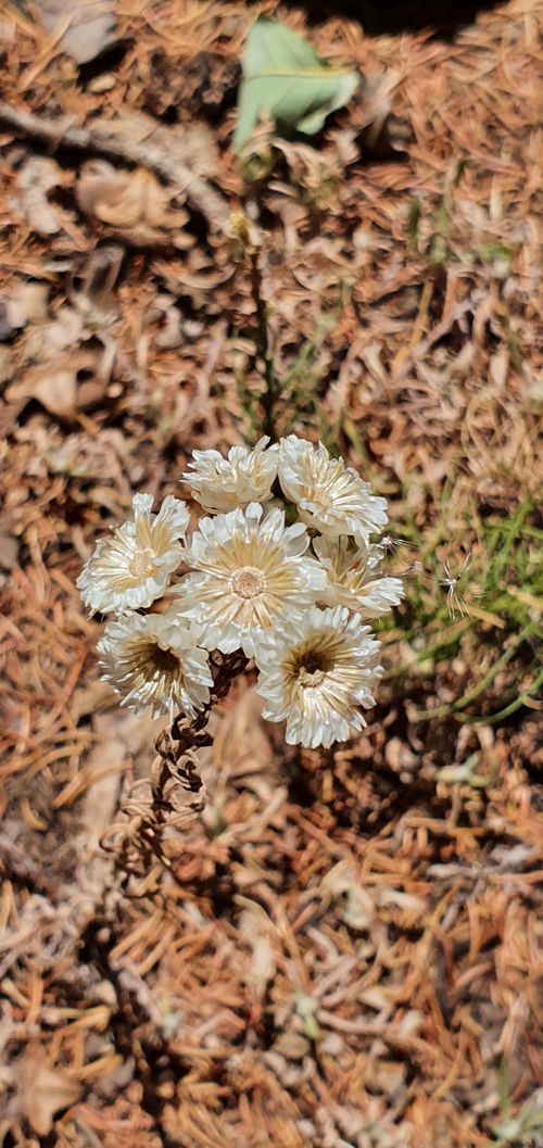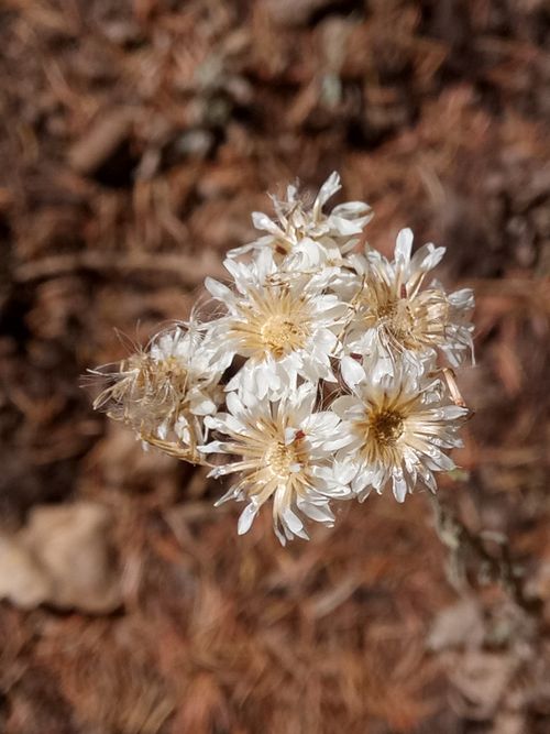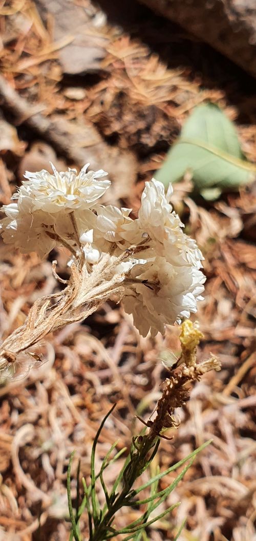 Helichrysum lacteum Coss. & Durieu, it is a perennial plant, up to 10-40 cm tall, caespitose; sterile branches usually with a rosette of leaves at the apex and sometime inflated, Leaves oblong or spathulate, white tomentose, those on the branches with capitula flexuous. Capitula globose, with peduncles c. 1cm, arranged in dense corymb, Involucral bracts silvery white, shining, erect and spreading at maturity, hairy at the base and equaling the florets. Florets all hermaphrodite.