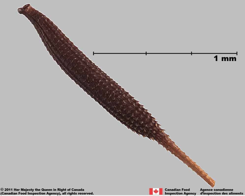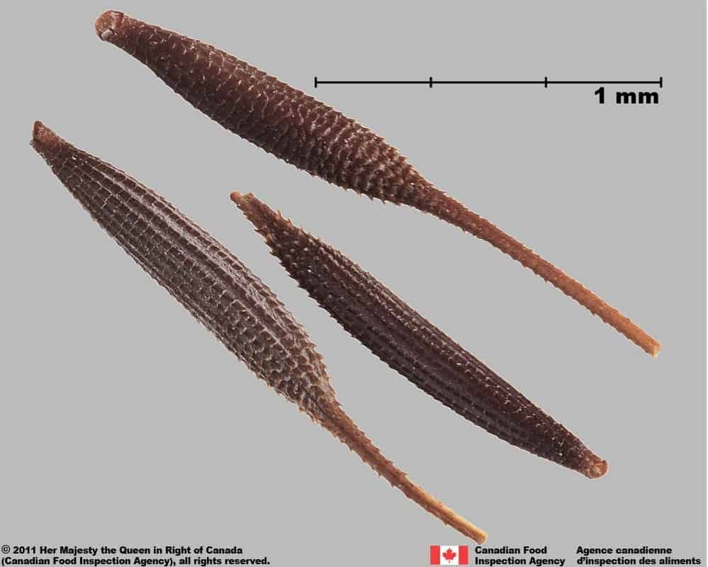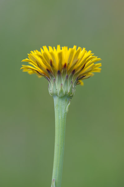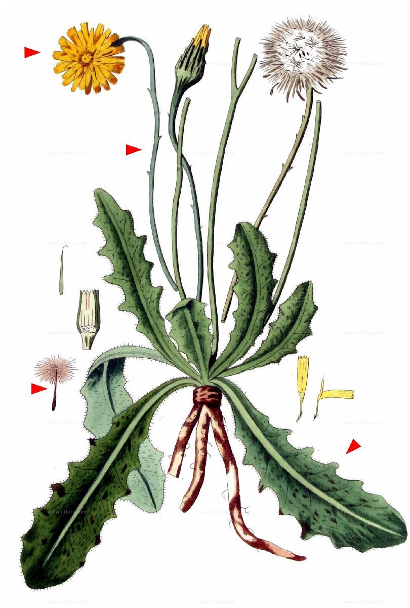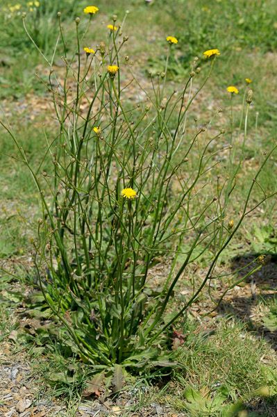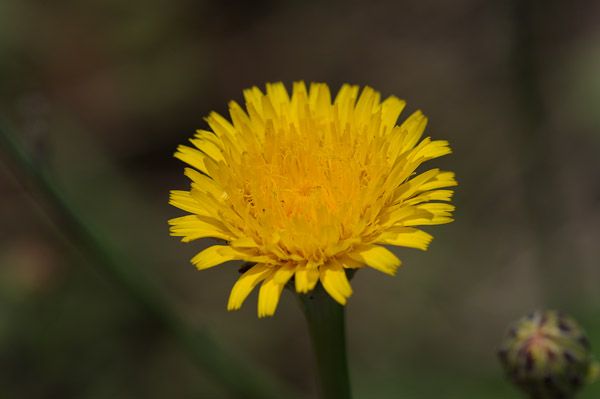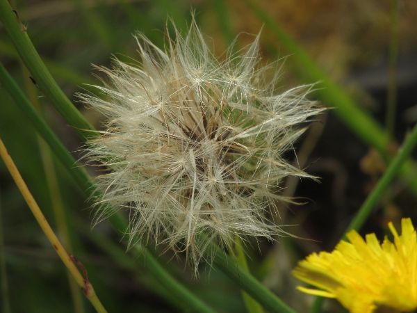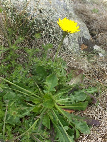 Hypochaeris radicata L., it is a robust perennial plant up to (10-) 20-60 (-100) cm, usually branched, sometime thickened immediately below the capitulum, glabrous or hispid. Leaves (20.)50-250x 10-40 mm, oblong or elliptic to oblanceolate, dentate to pinnatifid, sparsely to densely hispid or setulose-hispid. Cauline leaves 0.2. Capitula 20-30 (-40) mm wide, 15-25 mm long in fruit. Involucral bracts 25 x 2.5 mm, in several rows, glabrous or setose on the mid veins. Ligules bright yellow. Cypselas 8-17 mm. all with a distinct, long beak on the marginal ones shortly beaked or beakless (and up to 5 mm long), Pappus in 2 rows of setae; the outer3-6 mm, of scabrid or plumose setae; inner 9.5-12.5 mm, or plumose setae: setae not dilated at the base.