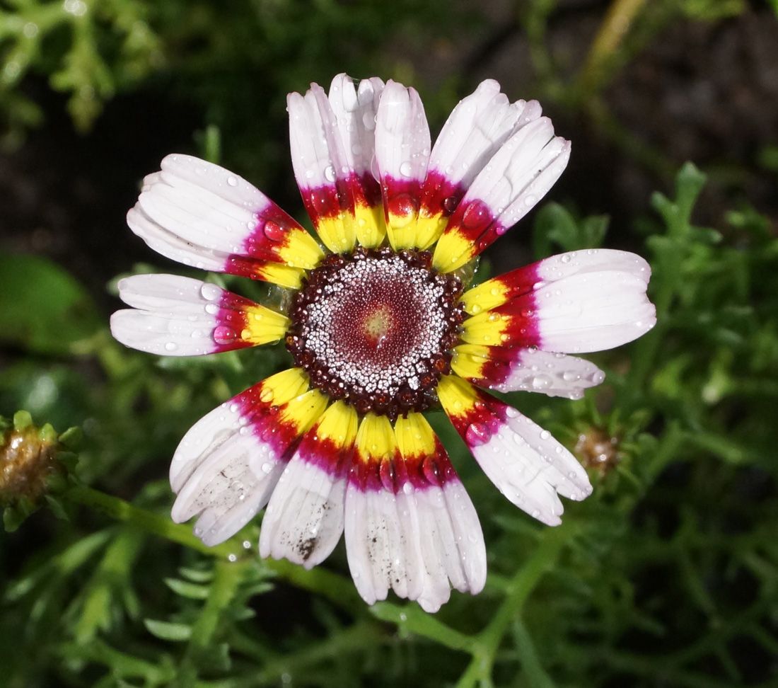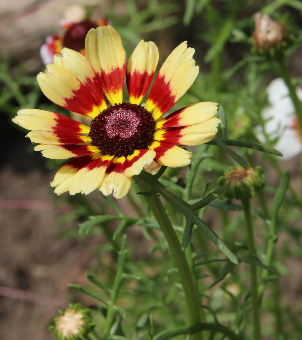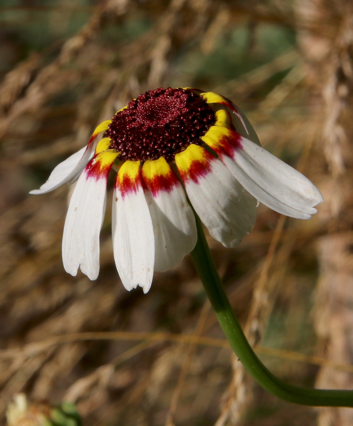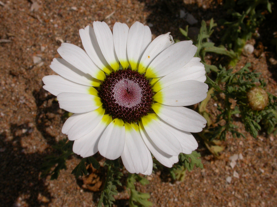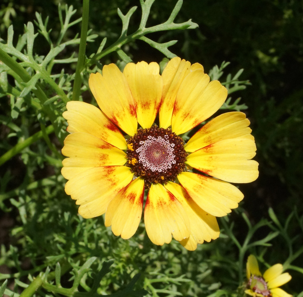 Ismelia carinata (Schousb.) Sch.Bip. / Homotypic Synonyms: Chrysanthemum carinatum Schousb., it is an annual herb. Stem, the aerial part is generally erect, simple or distally branched, average height 10-30 cm. Leaves mostly cauline, sessile (hugging the stem) or petiolate, are arranged alternately and have a 2-pinnate-lobed blade with terminal margins that are usually toothed, rarely entire. The blade contour is obovate or oblong. The surfaces are glabrous. Leaf size, 25–50 × 15–30 mm. Inflorescence consist of solitary or 2-3 flower heads gathered in a loose corymb-like formation, the inflorescences themselves consist of a terminal, radiate, pedunculated flower head. The flower heads consist of a meniscoid to hemispherical involucre, composed of 20-30 bracts, within which a receptacle serves as the base for two types of flowers. Ray florets and disk florets. The bracts, ranging in shape from ovate or obovate to lanceolate-deltate or lanceolate and more or less keeled, have a herbaceous consistency, are broadly hyaline on the margins and have resin canals, and are arranged in a more or less imbricated fashion in 2-4 rows. The convex receptacle lacks the straws that envelop the base of the flowers. Involucre diameter: 12-25 mm. The flowers are tetra-cyclic (i.e., formed by 4 whorls: calyx – corolla – androecium – gynoecium) and pentamerous (calyx and corolla formed by 5 elements). They are divided into: Ray florets (outer): 13 to 21 per flower head, female, fertile, and arranged in a row; the shape is ligulate (zygomorphic); sometimes they may be absent or sterile. Disc florets (central): They are more numerous (80-150) with short tubular shapes (actinomorphic); they are hermaphroditic and fertile. Calyx: The sepals of the calyx are reduced to a crown of scales. Corolla: Ray florets: The shape of the corolla is more or less tubular-funnel-shaped at the base, while it is ligulate at the apex; the ligule may end with some teeth; the color is generally yellow or white. Disc flowers: The shape is tubular, abruptly dividing into five lobes; the lobes, patent or erect, are delta-shaped or more or less lanceolate; the color is red or purple. Androecium: is composed of five stamens (alternating with the corolla lobes) supported by generally free filaments; the stamens are connate and form a sleeve surrounding the style. The anthers, with a collar of baluster-like filaments, can be either basifixed or medifixed. The endothecial tissue (inner lining of the anther) is almost always non-polarized. The pollen is spherical with an average diameter of approximately 25 microns; it is tricolporate (with three openings, either slit-like or isodiametric or pore-like) and echinate (with protruding tips). Gynoecium: The ovary is inferior, unilocular, and consists of two carpels. The style (the pollen receptor) is deeply bifid (with two divergent stigmas) and has separate or contiguous marginal stigmatic lines. The two arms of the style are truncated and may be papillose or covered with tufts of hairs. The fruits are achenes with pappus. In some species, there is a certain dimorphism between the achenes of the external ligulate florets (trigonal with three wings) and the tubular ones of the central disc (lattice with one or two wings). The apex is rounded at the margins or has a small crown. The pericarp lacks mucilaginous cells and resin sacs.