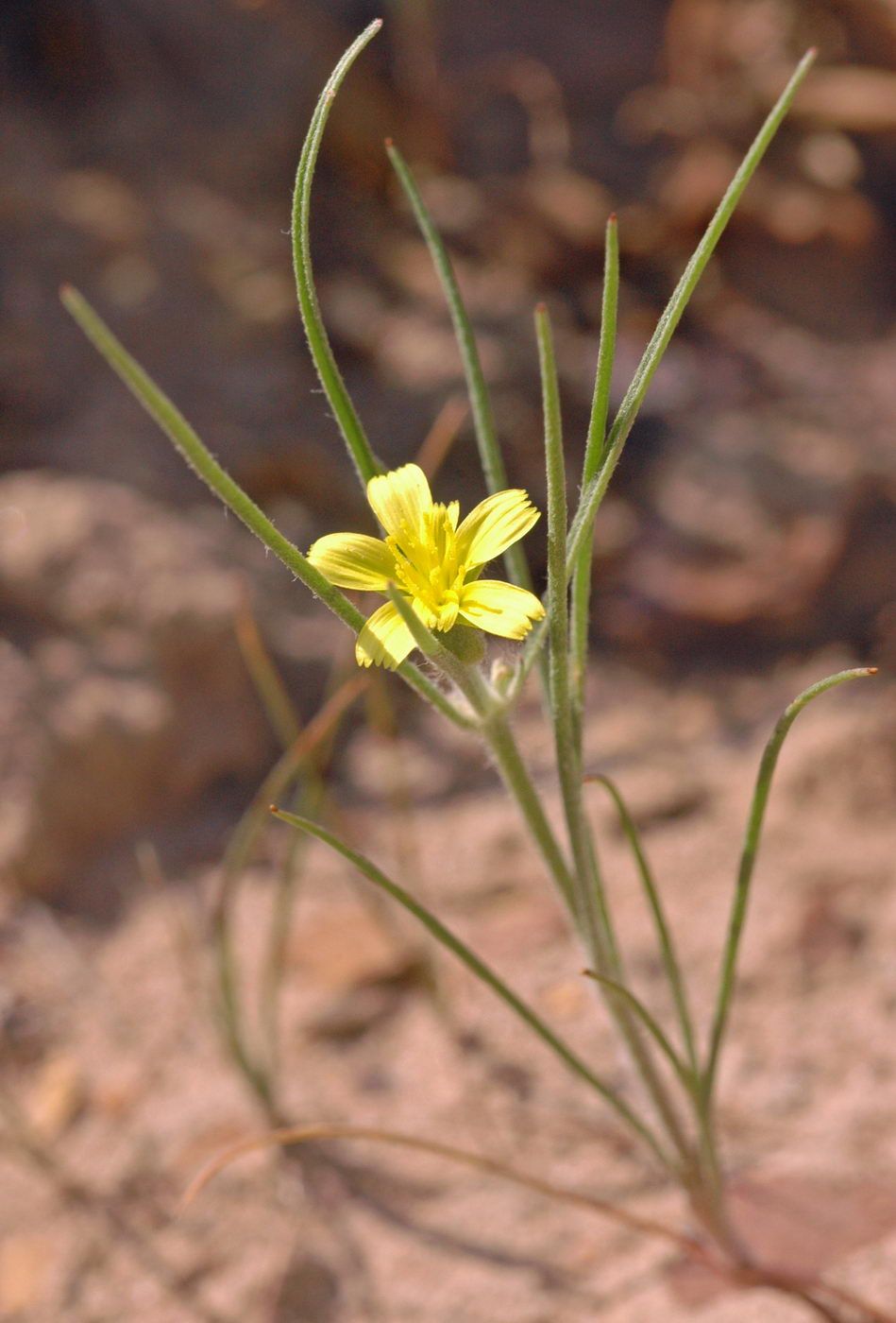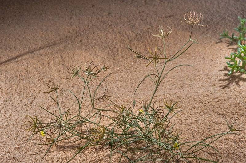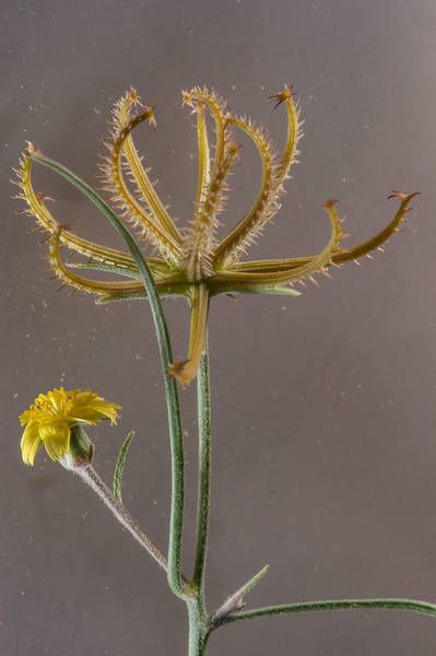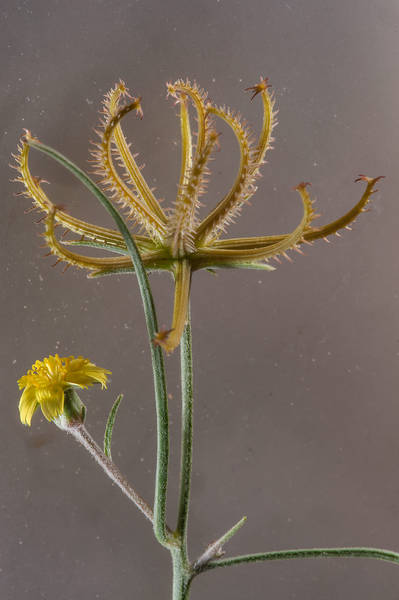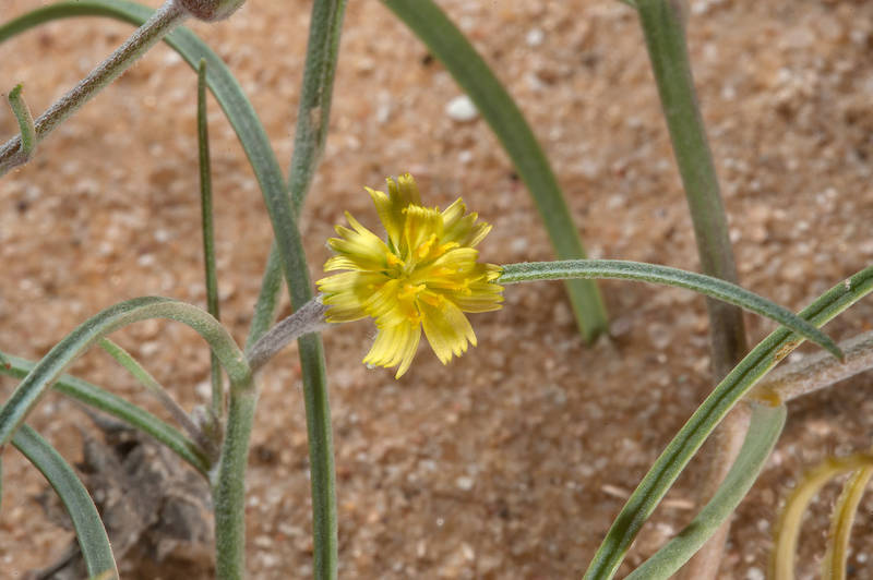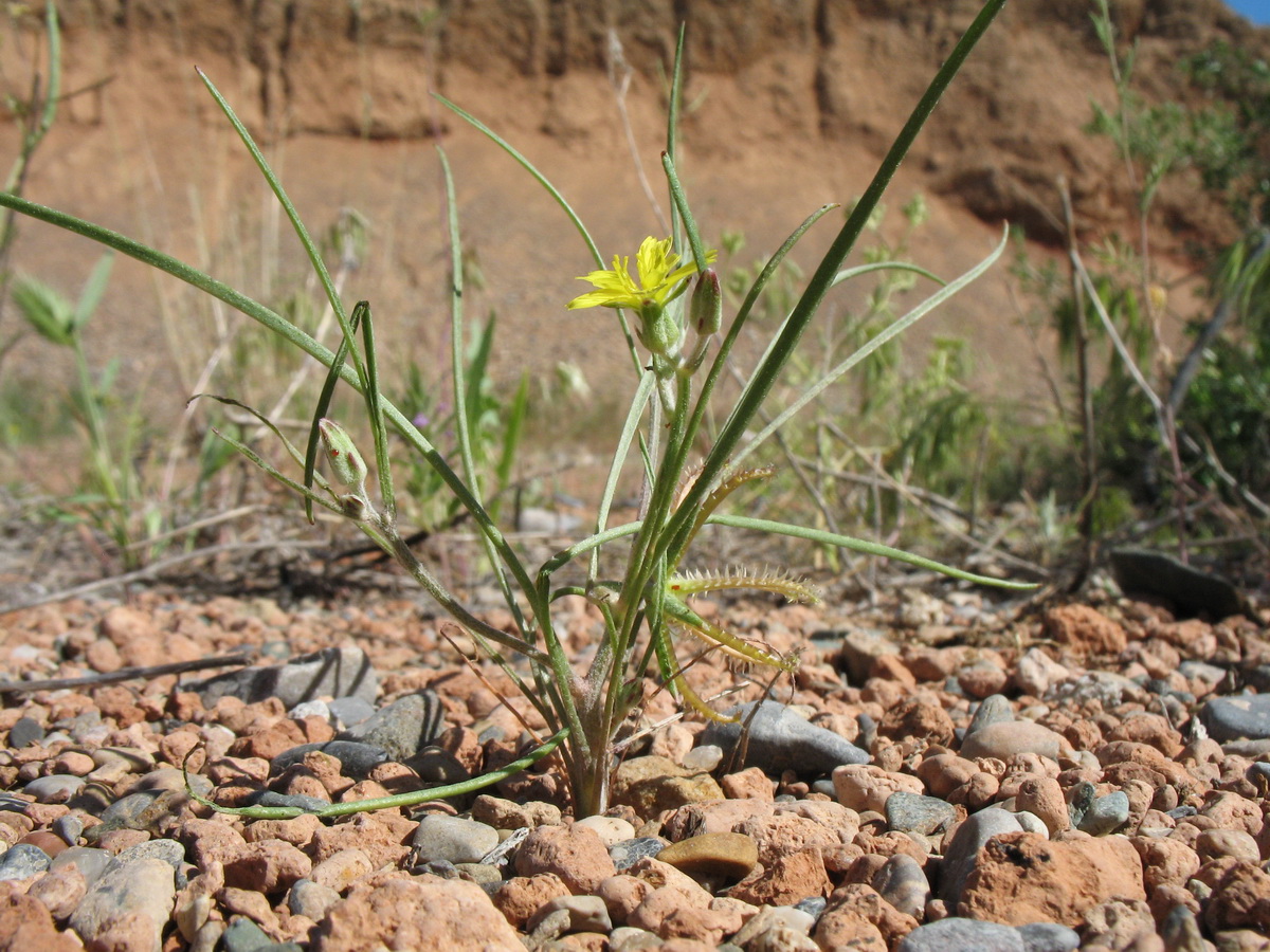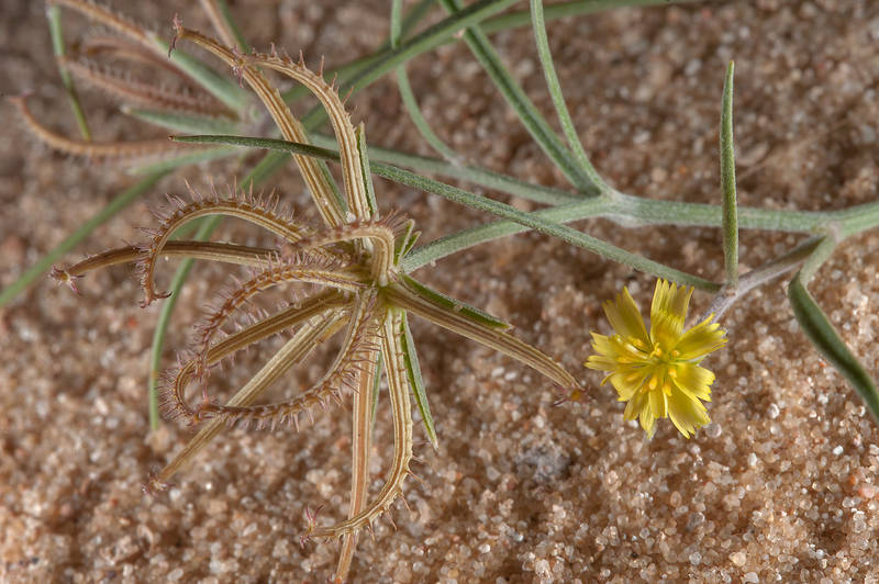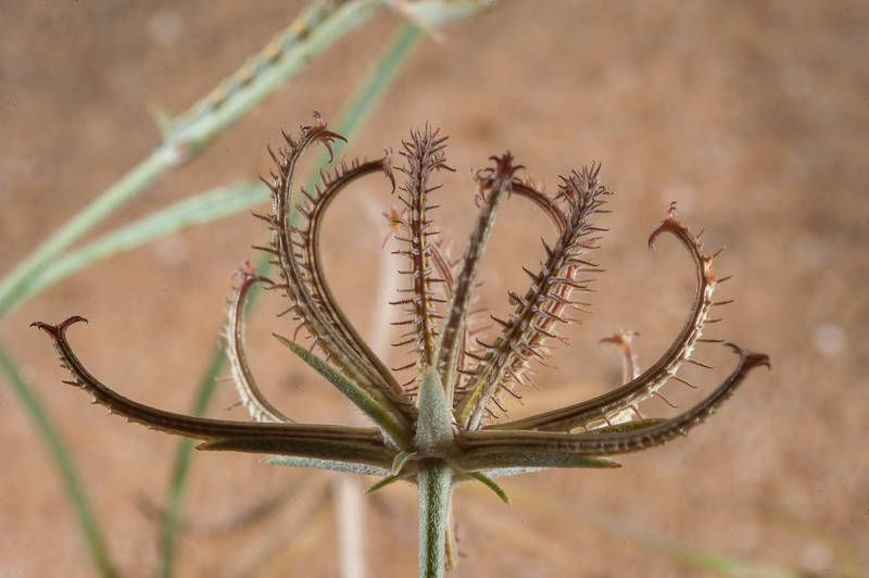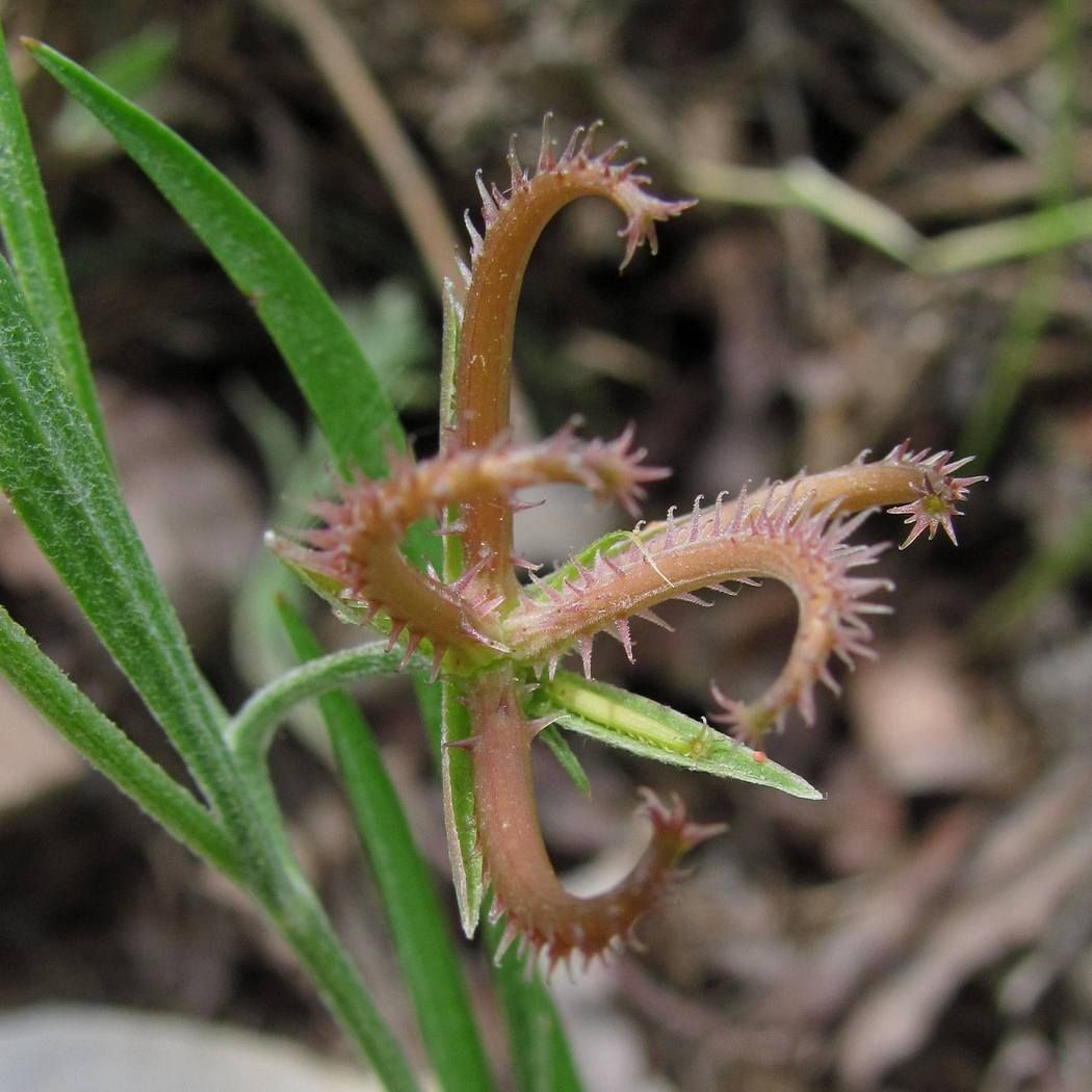 Koelpinia linearis Pall., it is a annual herb, up to 40 cm, slender. Stems simple or few branched, erect or ascending, hairy or glabrescent in the upper parts; hairs simple and biramus or bifurcate. Leaves, linear or filiform, mostly crowded in the lower parts, 30-80 (-100) mm long. Capitula,1-3 on a branch, occasionally ± sub sessile capitula in the basal parts of the plant. Peduncles 2-4 (-5) cm; capitula 6-7 (-9) x (2-) 3.5-4 mm (in fruiting 10-30 mm broad). Involucral bracts 5-7, linear, entire, hairy. Cypscla (8-) 12-18 mm; hooks simple or with subsidiary hooks, hairy; hairs white-glistening; apex with 6-7 (-9), rigid hooks; hook similar to those on the back, connate on the base.