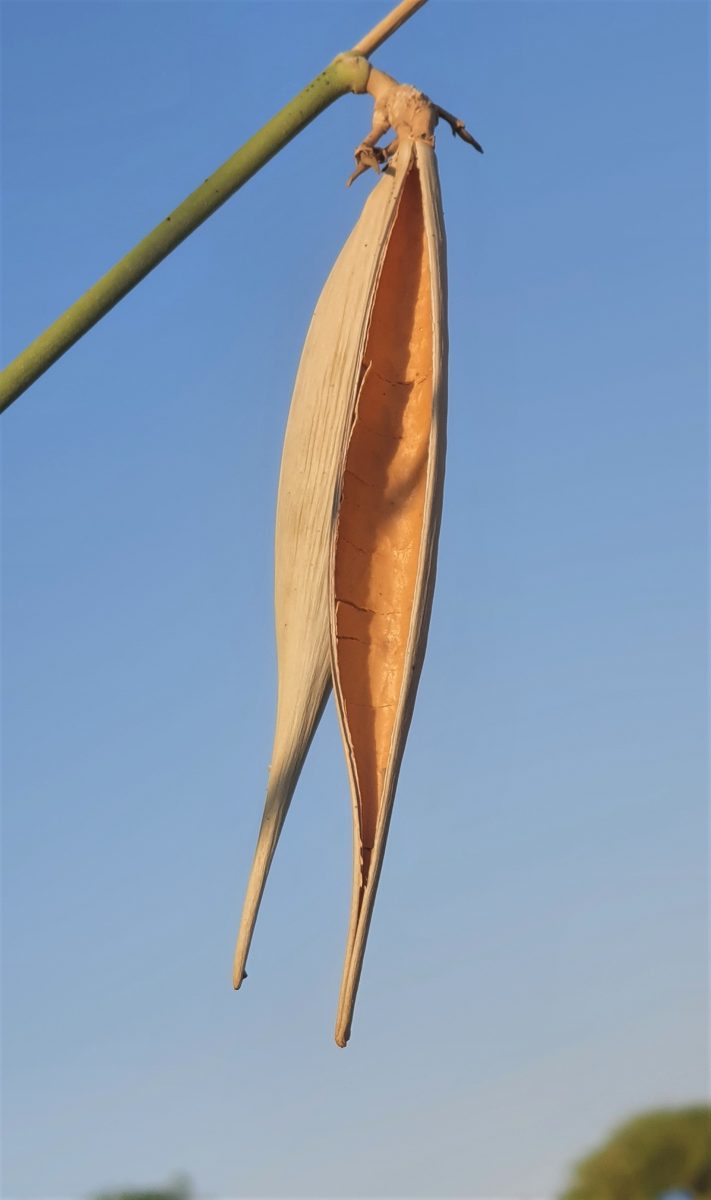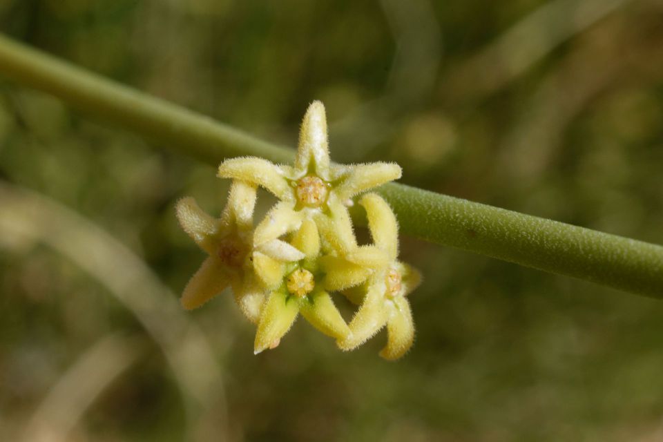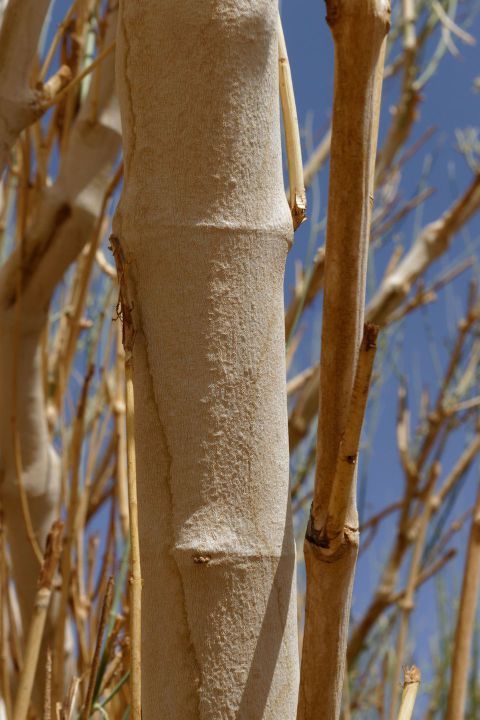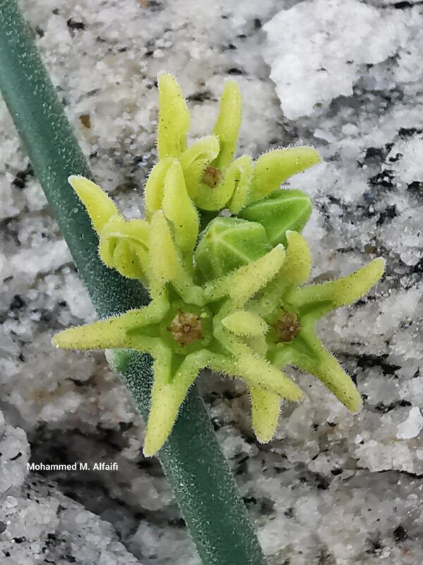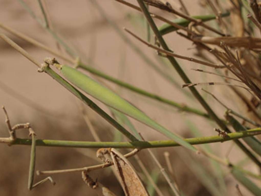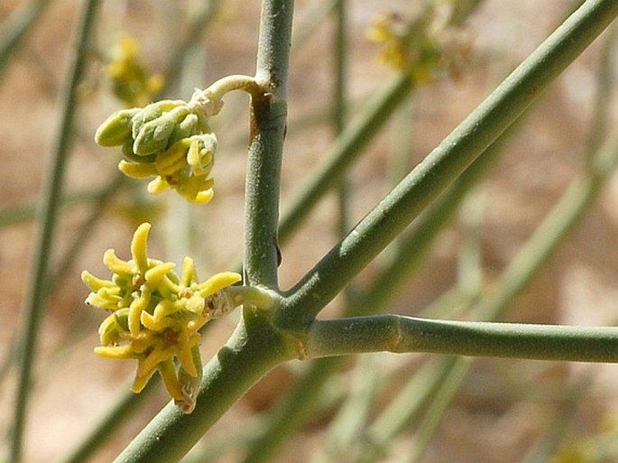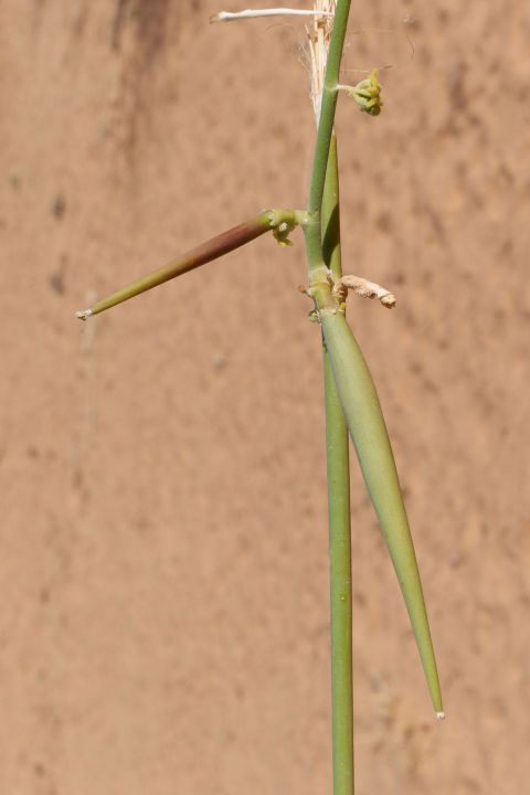 Leptadenia pyrotechnica (Forssk.) Decne., it is an erect shrub or small tree, up to 5 m tall, with numerous slender, spinescent green branches. Leaves when present, 2.5-5 cm x 2.5-3 mm, linear, sessile. Flowers in small umbellate cymes. Peduncle 2.5-8 mm long, pedicel c. 2.5 mm long. Calyx c. 1.5 mm long, lobes as long as the tube, pubescent. Corolla funnel-shaped, glabrous below, lobes pubescent within and without. Follicles solitary, 7.5-11.5 cm x 6-7 mm, reflexed, lanceolate, smooth, beaked. Seeds c. 8 mm long, coma 2.5-3.8 cm long.