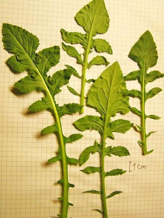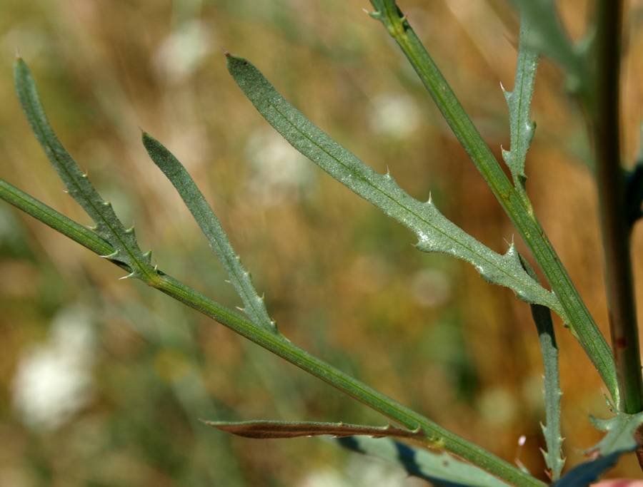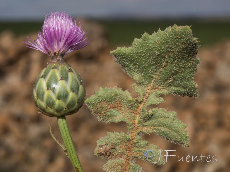 Mantisalca duriaei (Spach) Briq. & Cavill., it is an annual herb, up to 20-50 (-15) cm, scabrid, appressed hairy to glabrescent, erect or ascending, much branched, slender. Basal leaves oblanceolate, tapered into a long petiole, sinuate-toothed. Cauline leaves lanceolate, sessile, sinuate-toothed, apex of the leaf and teeth whitish mucronate. Capitula solitary, in the middle of the basal leaves and at apices of the branches. Involucre 10 x 10 mm. ovoid. Involueral bracts coriaceous, ± glossy glabrous, greenish, ovate to linear-lanceolate, very narrowly scarious margined, acuto-mucronate, tips blackish or dark brown. Florets purplish; peripheral florets exserted and slightly spreading from the involucre. Cypsela dimorphic; peripheral epappose, with a ± basal hilum, central ones pappose, with lateral hilum; hilum carunculate; pappus as long as the cypsela.
