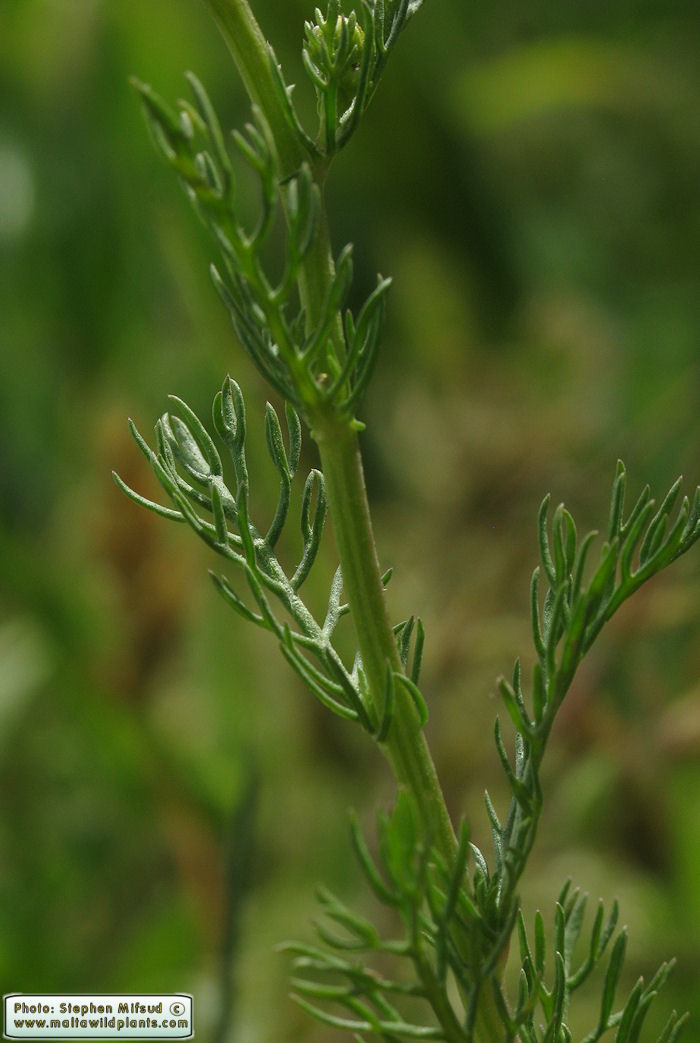 Matricaria chamomilla L. / Heterotypic Synonyms: Chamomilla recutita (L.) Rausch., it is an annual herb, up to (2-)10-60 cm, glabrous. Stems erect or ascending, much-branched above. Leaves 4-7 cm; segments acute, well separated. Peduncles 3-10 cm. Capitula (1-) 8-120 (-more)- 10-25 mm in diam. Involucral bracts with a pale margin. Ligules 6-9 x 2-3 mm, soon deflexed, rarely absent. Tubular florets 5-lobed, yellow; upper part of tube campanulate above a marked constriction. Achenes c. 1 mm, pale greyish-brown, with 4-5 ribs on the ventral face; pappus usually very small or absent, but sometimes, especially in achenes of the ligulate florets, a conspicuous, irregularly toothed auricle, as long as or longer than the achene.