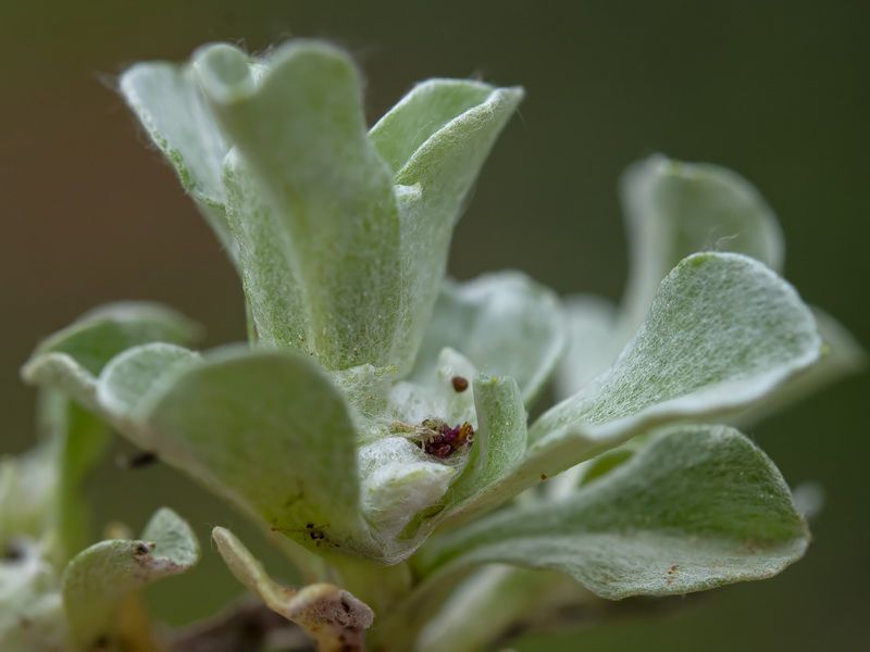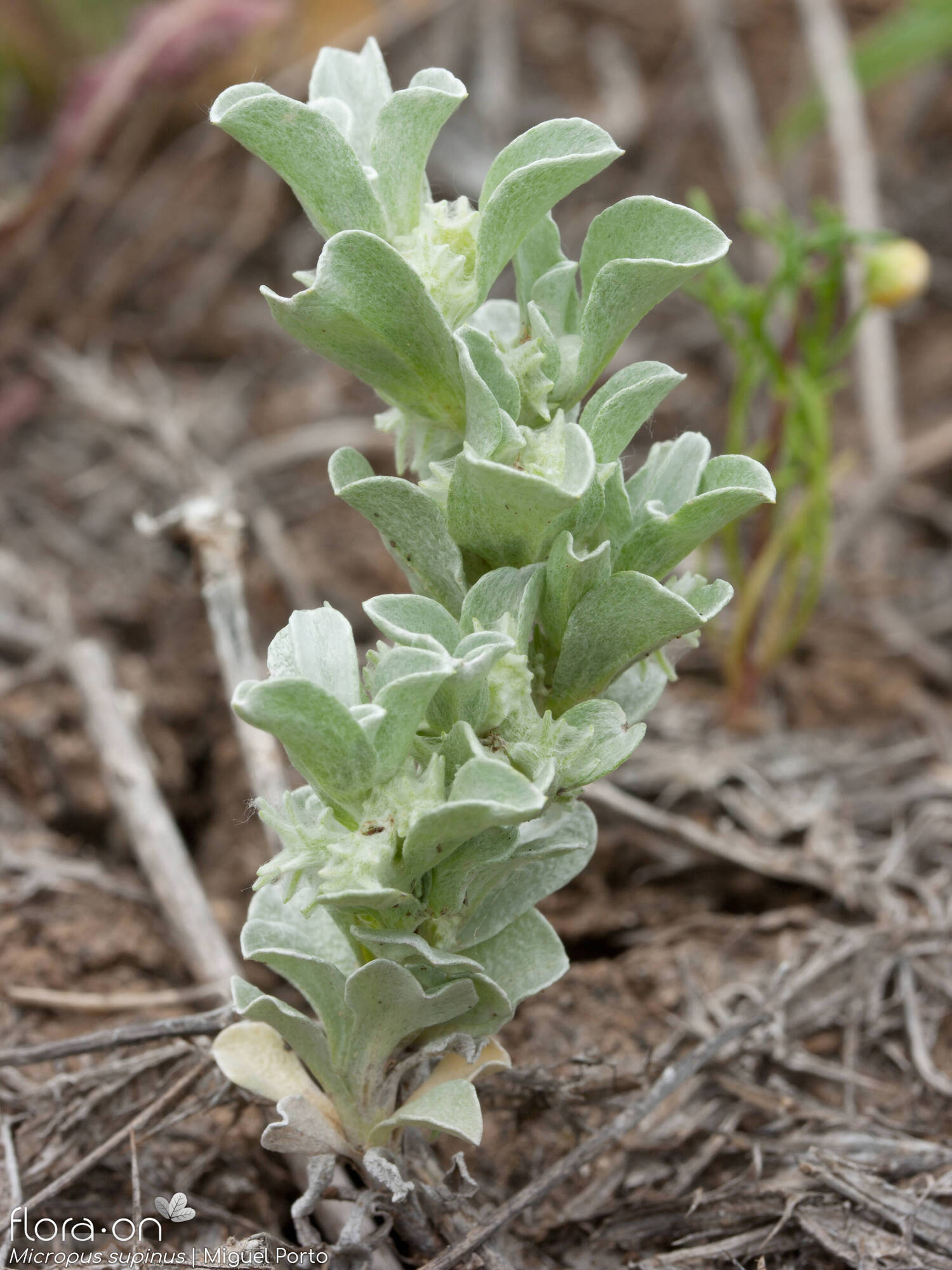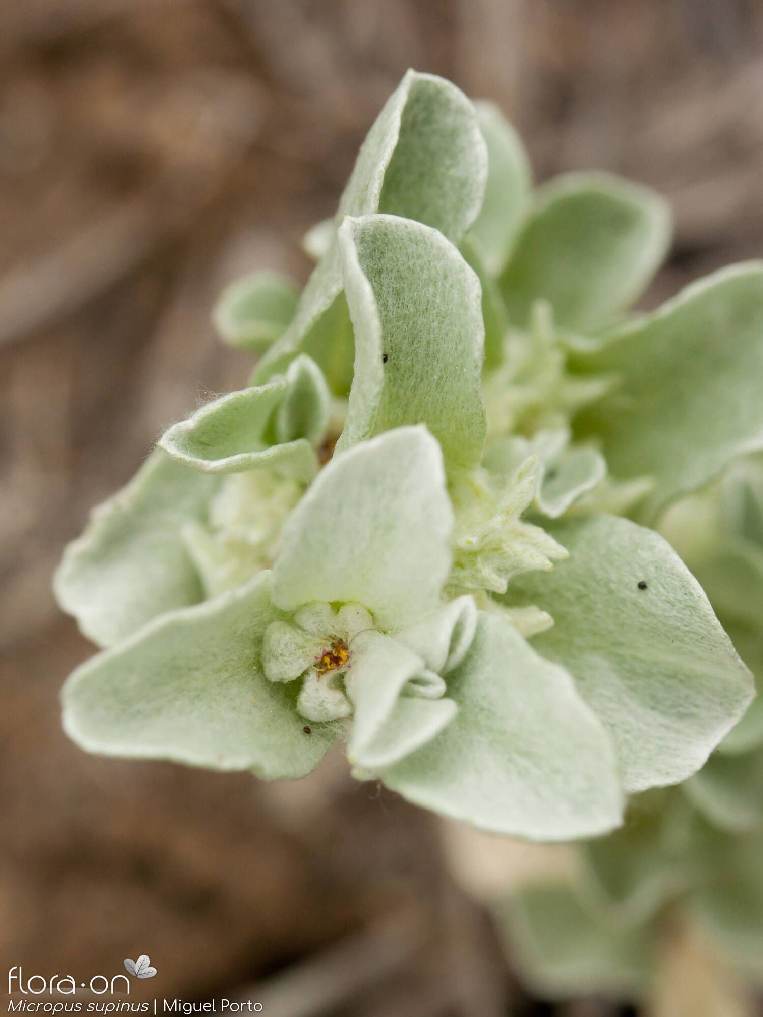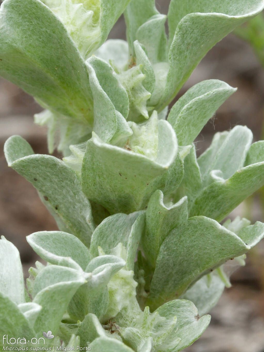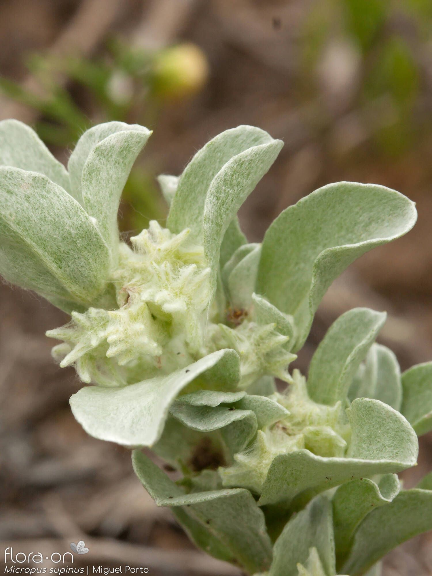 Micropus supinus L., it is an annual herb, up 2 -10 cm. Stems procumbent or ascending, rigid, branched from the base. Leaves 12-20 x 4-11 mm, obovate-spathulate, rounded to subacute, flat. Capitula 5-7 mm wide. Outer involucral bracts 1-I.2 mm, membranous. Inner involucral bracts 4-5, 5-8 mm in fruit, with densely appressed hairs; palea minute. Cypselas 2.3-2.5 x 1-1.3 mm, obliquely obovoid, pale-brown, shining.
