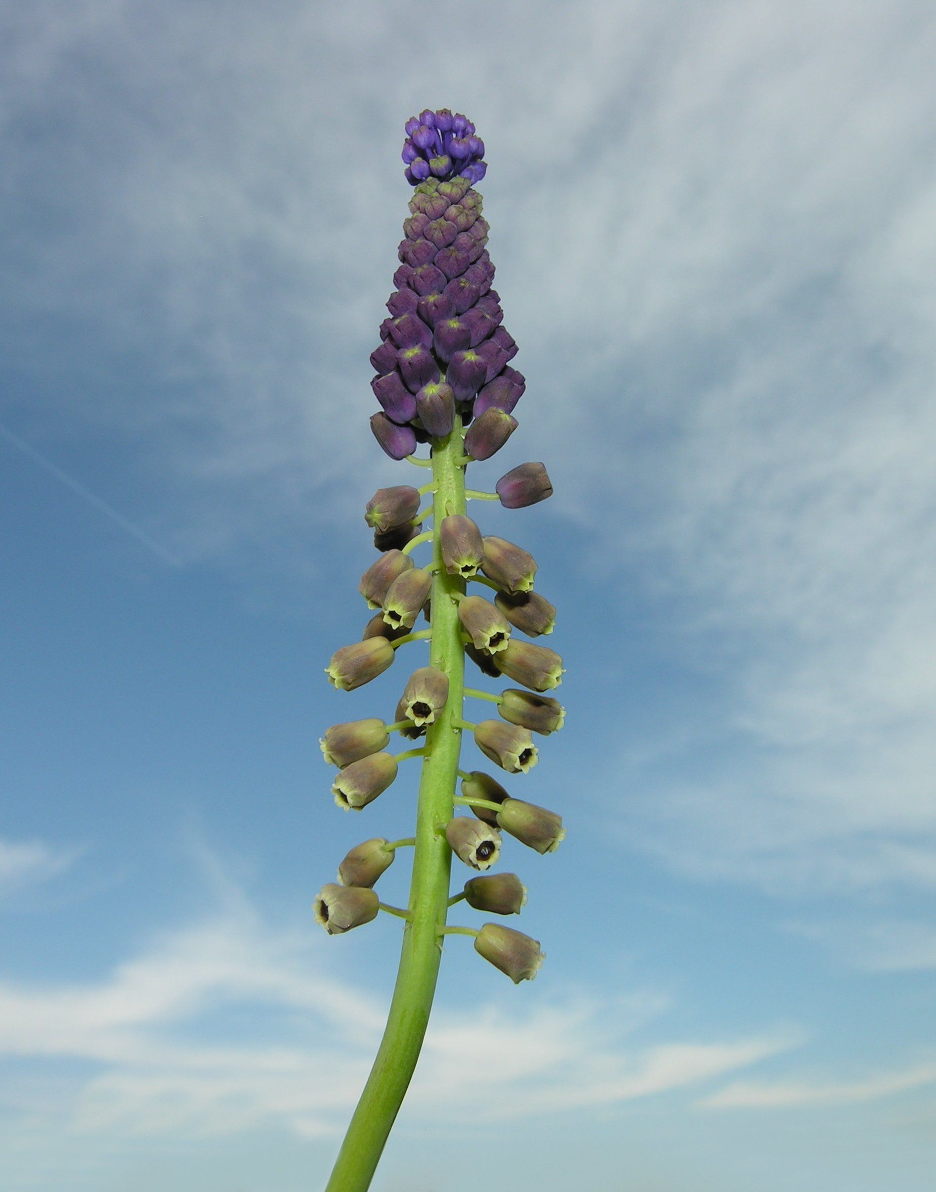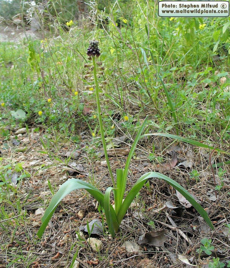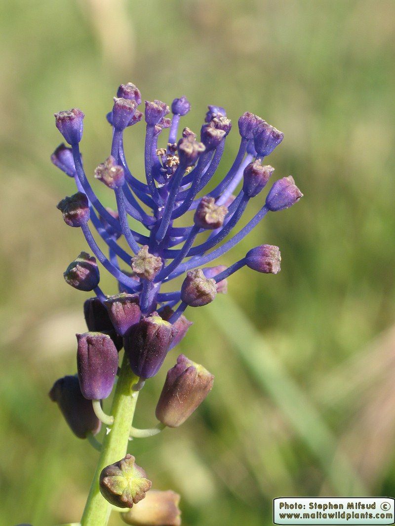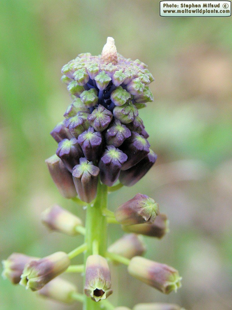 Muscari comosum (L.) Mill. / Homotypic Synonyms: Leopoldia comosa (L.) Parl., it is a bulbous geophyte, bulb, tunics pink. Leaves 3-5(-7), 7-40 (-60) cm x 5-17(-30) mm, linear, usually shorter than scape. Scape 15-50(-80) cm, erect. Raceme 40-80 x 3-6 cm, lax, cylindrical. Pedicels of fertile flowers 4-10(-15) mm, patent, not elongating. Fertile flowers 5-9.5 mm, oblong-urceolate, pale brown; shoulders rounded, darker brown; teeth cream to pale yellowish-brown. Pedicels of sterile flowers 6-25(-40) mm, fleshy, ascending, violet. Sterile flowers 2-6(-10) mm, globose to obovoid, bright violet, shorter than fertile flowers, often numerous, in a conspicuous, usually corymbose terminal tuft. Fruiting raceme 8-40 cm, lax, cylindrical. Capsule 10-15 x 6.5-8 mm, obovoid, emarginate.