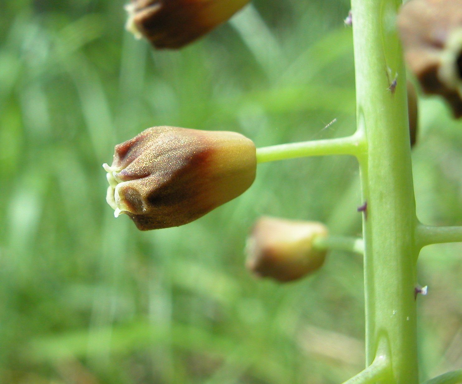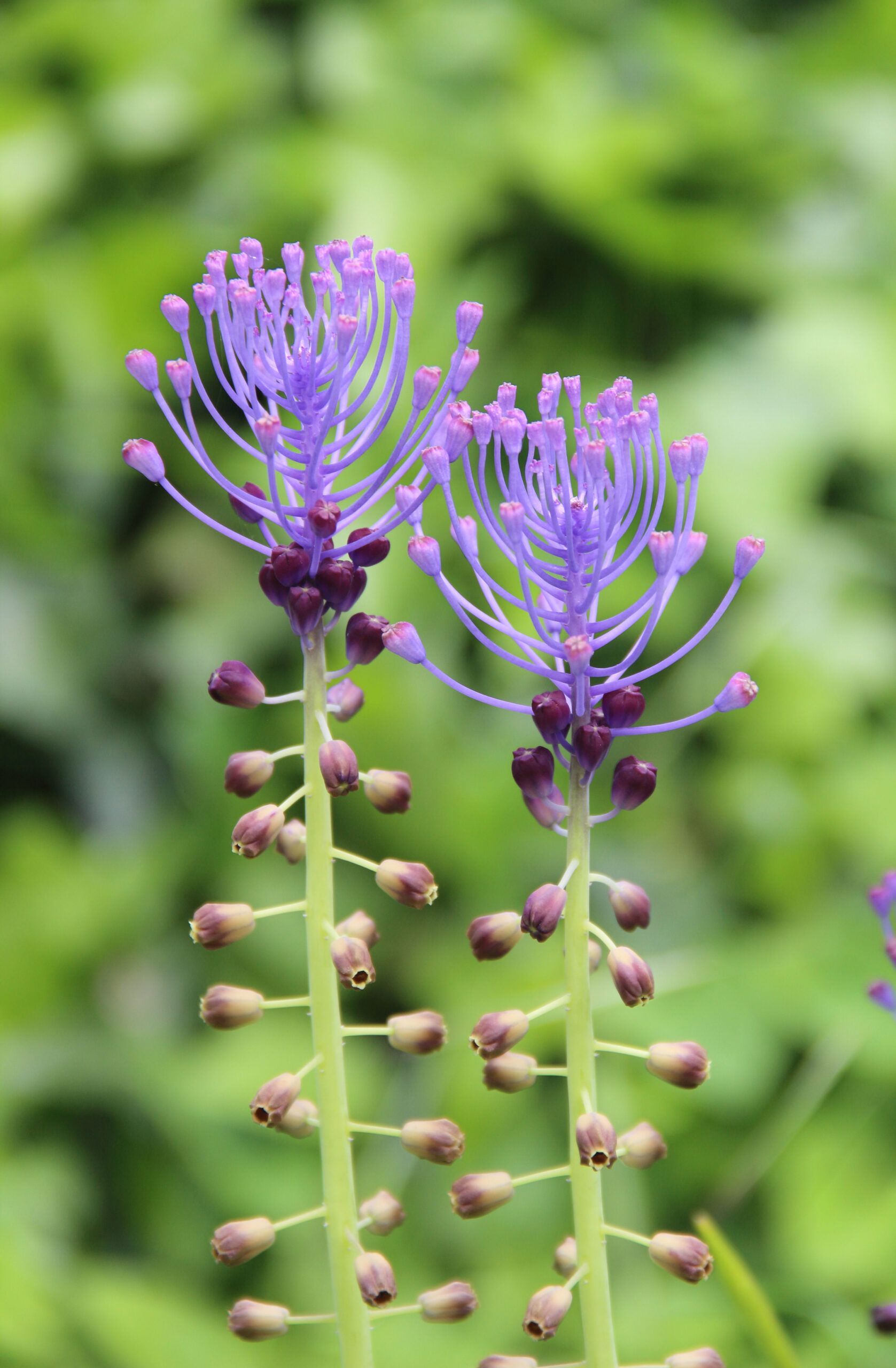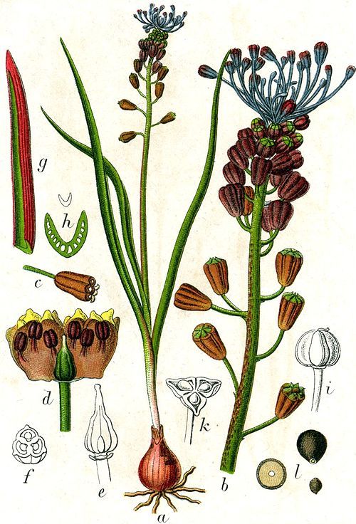 Muscari comosum (L.) Mill. / Homotypic Synonyms: Leopoldia comosa (L.) Parl., it is a bulbous geophyte, bulb, tunics pink. Leaves 3-5(-7), 7-40 (-60) cm x 5-17(-30) mm, linear, usually shorter than scape. Scape 15-50(-80) cm, erect. Raceme 40-80 x 3-6 cm, lax, cylindrical. Pedicels of fertile flowers 4-10(-15) mm, patent, not elongating. Fertile flowers 5-9.5 mm, oblong-urceolate, pale brown; shoulders rounded, darker brown; teeth cream to pale yellowish-brown. Pedicels of sterile flowers 6-25(-40) mm, fleshy, ascending, violet. Sterile flowers 2-6(-10) mm, globose to obovoid, bright violet, shorter than fertile flowers, often numerous, in a conspicuous, usually corymbose terminal tuft. Fruiting raceme 8-40 cm, lax, cylindrical. Capsule 10-15 x 6.5-8 mm, obovoid, emarginate.