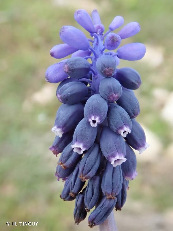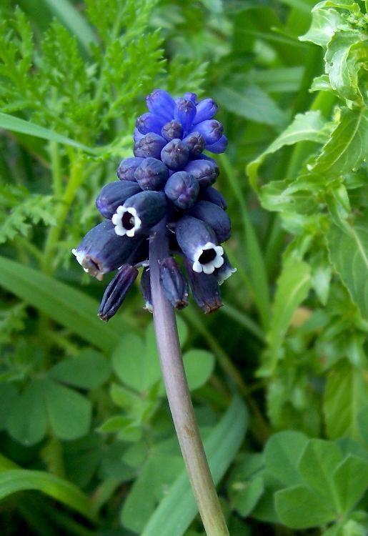 Muscari neglectum Guss. ex Ten & Sangiov., it is a bulbous geophyte, bulbs ovoid-elongate, c. 2.5 cm in diameter. Leaves broad, c. 5 mm wide, scape longer, (15-) 25 to 40 cm. Inflorescence less crowded is 2–6 cm (0.8–2.4 in) long; pedicels 4-5 mm long. The flower stems are 5–20 cm (2.0–7.9 in) tall. The flowers are arranged in a spike or raceme and are dark blue with white lobes at their tips (teeth); there may be a cluster of paler sterile flowers at the top of the spike. The fruit is a 3-celled capsule with two ovules in each cell.
